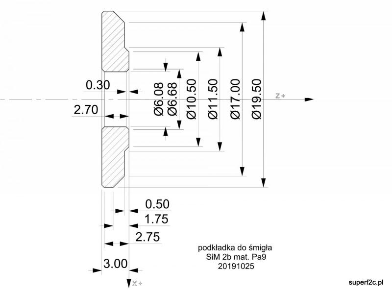 Do tej pory wycinając drutówką ze stalki czy jak kto woli kratówki: nie stanowiło dla mnie problemu i kąty odpowiednie ustawić. W przypadku obróbki CNC na tokarce ustawianie noża jest po prostu kłopotliwe. Mam tu na myśli złapanie współrzędnej Z=0 i X=0. Zdecydowanie łatwiej jest mi wymienić płytkę i ewentualnie wprowadzić tylko korekty w danym nożu. W moim przypadku przecinak będzie zajmował pozycję w imaku T04 a korekta będzie wpisywana w tabeli korekcji narzędzi w rubryce T0404. I dlatego chcę poprawić imak cztero-nożowy co by było prawidłowo czyli prostopadle. Nie jest problem samo poprawienie wyjętego już imaka. Problem jak na razie jest dla mnie wyjęcie imaka. Ale napisałem do producenta i liczę że jak i poprzednio z podprogramem miałem problem wymiany narzędzia tak i tu dostanę parę zdjęć co i jak mam wykonać. Zresztą przedstawiciel fabryki cały czas jest na FB i śledzi moje poczynania z tokarką CNC210 i frezarką XC-4040. https://www.facebook.com/mariusz.brozek.5/media_set?set=a.1594437643948195&type=3 co do kształtu samej podkładki. Nie mam koncepcji na stanie przy tokarce i manualnie wykonywanie podkładek. Zdecydowanie preferuję obróbkę CNC. A nożowi tokarskiemu jest bez różnicy jaką będzie pokonywał drogę w materiale. Pierwotnie miała być klasyczna z fazami podkładka. No ale... -