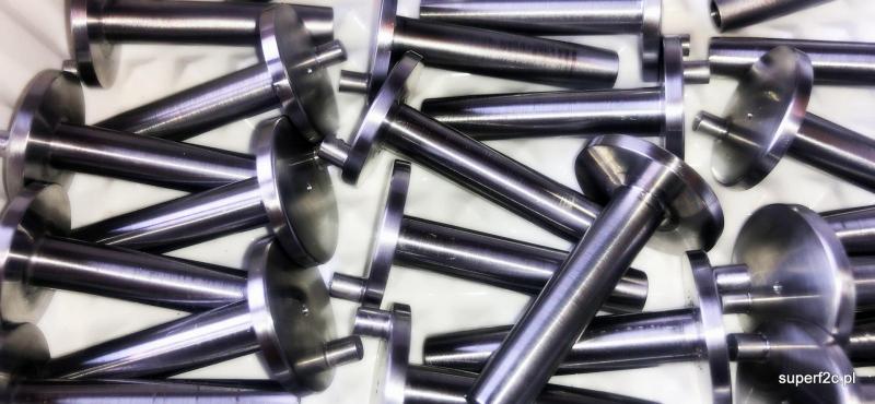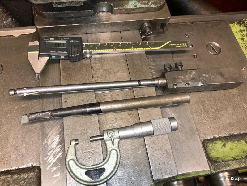 są także wały korbowe. Wymagające jeszcze przed samym azotowaniem wypolerowania miejsc współpracujących z panewkami. wrócił cały SAAB 96 z piaskowania karoserii. Na tej fotografii fragment podłogi. Sito... Całość zabezpieczona minią. Czyli zabezpiecza gołą blachę po piaskowaniu przed korozją. Farba miniowa - antykorozyjny podkład pod następną warstwę farby powierzchniowej. A sama minia to wymieszana na wiertarce czerwony tlenek ołowiu plus pokost lniany. Utlenia powierzchniowo z wytworzeniem cienkiej warstwy tlenków żelaza. Czysta postać pasywacji. I jak każdy związek ołowiu to trucizna... tak zwana bor-sztanga czyli na końcu ponad 150 milimetrowej sztycy zamocowany nożyk z SW18 w celi wykonania otworu(wyluzowanie fi10H7) w długim pręcie. Osiowo. Bo niestety po wierceniu dwustronnym otwory troszeczkę się mijały. -