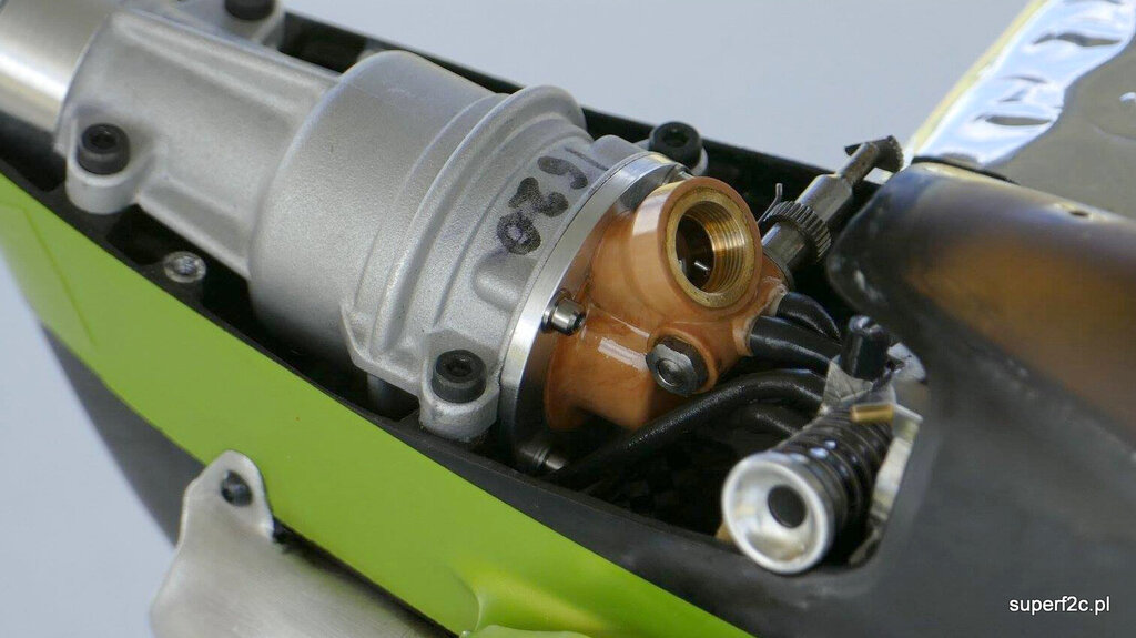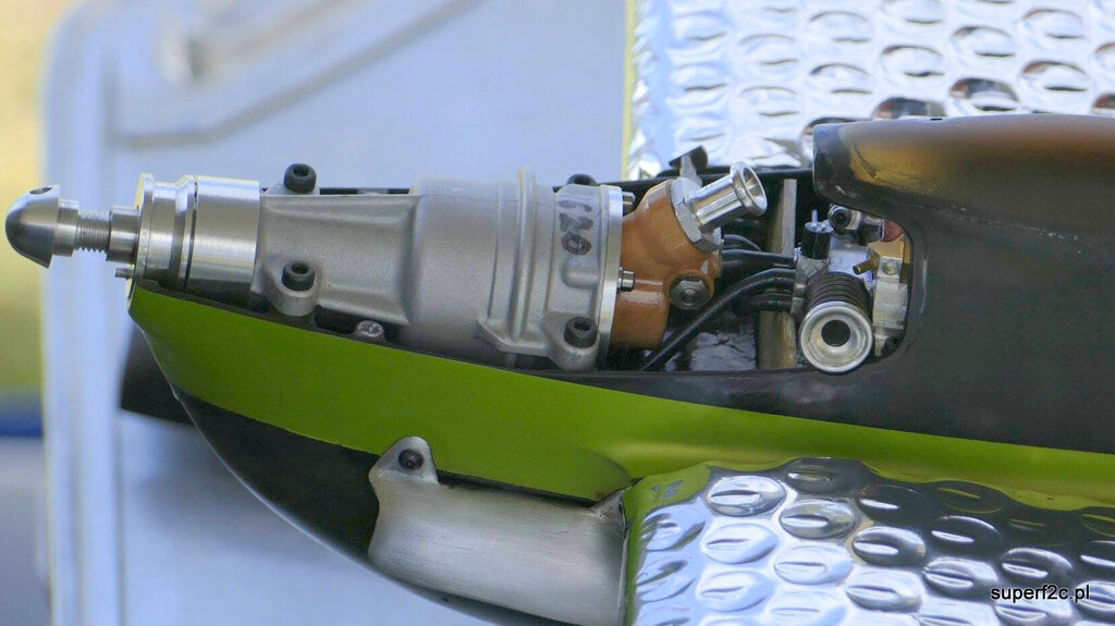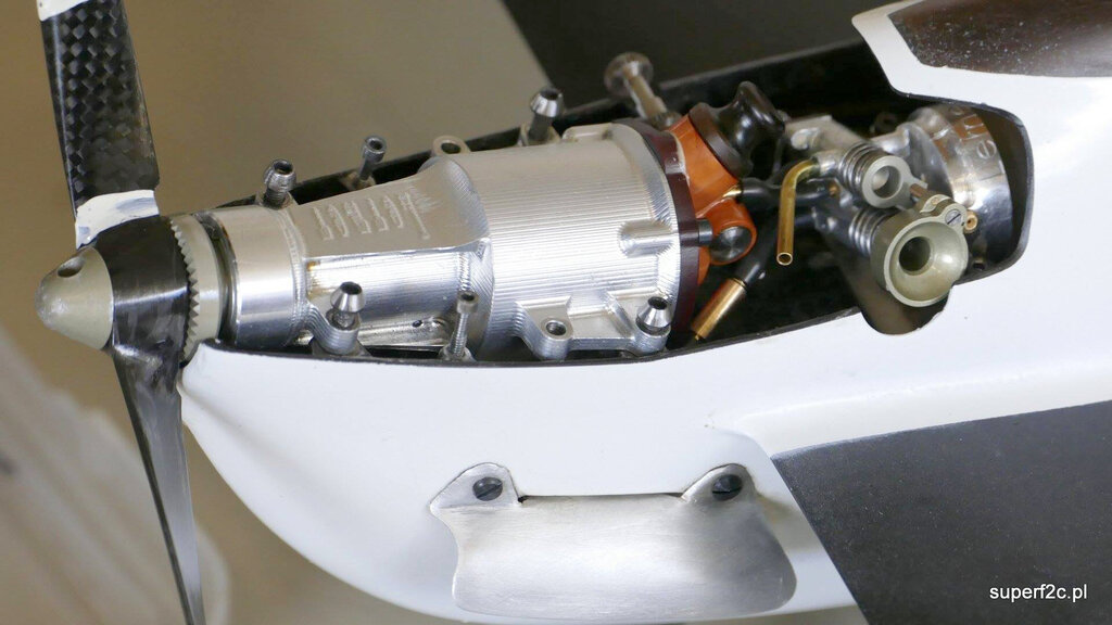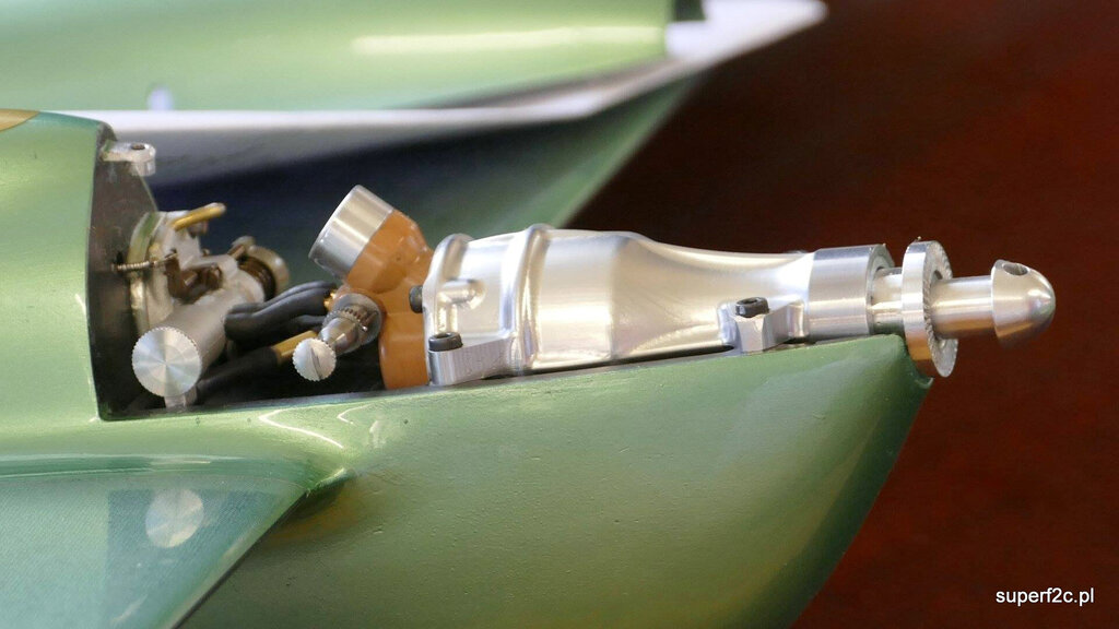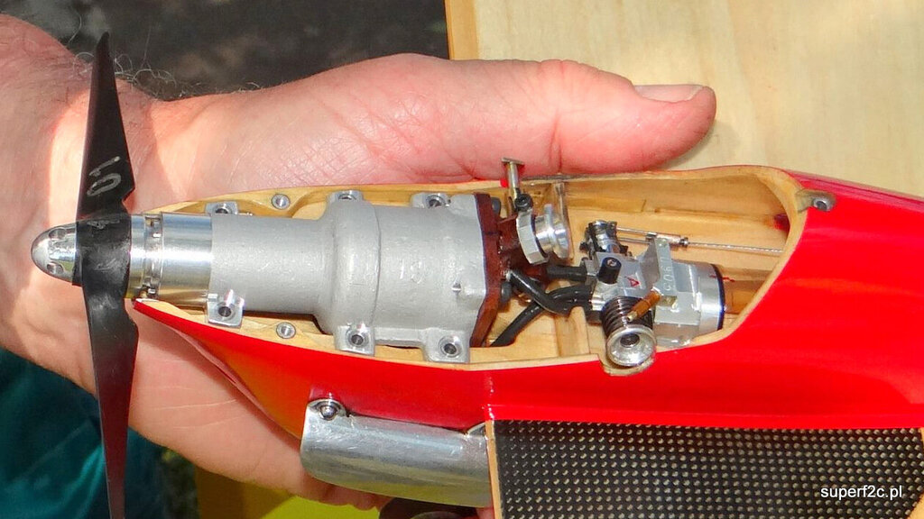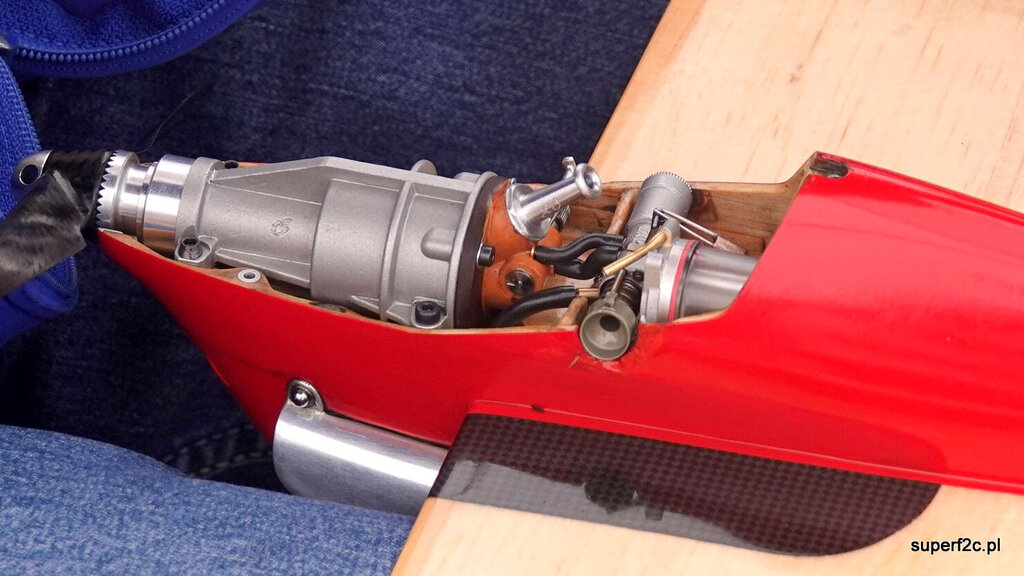 to pewnie będzie dłuższy wywód. Ale że się jeszcze frezuje to nie ma problemu trochę wprowadzić w tajniki kategorii modeli wyścigowych na uwięzi F2C. Modele coraz lżejsze, (dzięki technologii bez drewna przy budowie) to i coraz szybsze. W prędkości ze zwolnieniem prędkości obrotowej poradzono sobie bez problemu zwiększając długość linek tak że 1 kilometr model pokonuje przez 9 okrążeń a nie 10. W Wyścigu F2C dalej jest 15,92 m a prędkość obrotowa bez zmian była na poziomie 16,1 sekundy na 10 okrążeń. Co przy trzech zawodnikach startujących w jednym biegu i wieku pilotów stanowi problem ukończenia biegu. Kończy to się zazwyczaj rozbiciem modelu. A model rozbity to praktycznie złom. Spowolnienie prędkości modeli wyścigowych odbyło się do tej pory po przez zmiany regulaminowe. Gaźnik ma mieć średnicę 3 mm i ma do tego doszedł a-la tłumik który zwiększył troszeczkę powierzchnię czołową modelu. Zmiana średnicy z dowolnej czyli dużej na 3 milimetry spowodowała że modele bez problemu zaczęły latać po 50 okrążeń. Czyli biegi eliminacyjne rozgrywano na jedno międzylądowanie. Zrobiło się to nudne i w przepisach zmieniono że musi być przynajmniej dwa międzylądowania na 100 okrążeń i w finale na 200 okrążeń także musi być odpowiednia liczba lądowań. Tak że dzisiaj 7 cm sześciennych paliwa wystarcza na około 44 okrążenia co daje możliwość taktycznego wyboru międzylądowania między 30 a 40 okrążeniem. Wtedy jak inni lecą i nie przeszkodzą w szybkim lądowaniu piloci wszystkich trzech zespołów jednocześnie na 33 okrążeniu gaszę silniki i jednocześnie lądują. Przeszkadzają sobie wzajemnie i łatwo o nie skończenie biegu. analogicznie po zrobieniu 67 okrążeń wszyscy jednocześnie gaszą silniki i łatwo wtedy o wypadek. widać wielofunkcyjny zawór umieszczony na przodzie zbiornika o pojemności wraz z instalacją doprowadzającą paliwo do silnika 6,9 cm sześciennego, który w połączeniu z tankowaczką ciśnieniową na ramieniu mechanika i zaworem na palcu umożliwia błyskawiczne tankowanie. Wręcz perfekcyjne. Stosowne filmy najlepszych zamieszczę później. Ale tu przykład dobrej pracy mechanika: 20892348_146509639270942_4666710953285386240_n.mp4