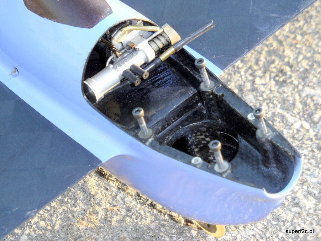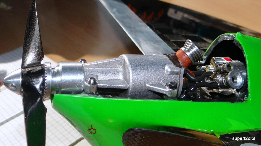 śmigło kompozytowe siedzi dociśnięte do piasty zaopatrzonej w ostre nacięcia kołpakiem. Kołpak ma wystającą śrubę M6 ale o skoku 0,75 zamiast typowego skoku jeden dla gwintu M6. Cała siła z jaką dociskamy jest limitowana otworem w kołpaku o średnicy fi 3,2 mm. Zatem przetyczka wykonana z długiego klucza ampulowego o sześciokącie 5 milimetrów. Sześciokąt 5 mm to klucz do kompresji z długim pokrętłem ułatwiającym precyzyjną regulację kompresji a reszta klucza czyli ta rączka jest cieniowana do średnicy 3 milimetry i znakomicie nadaje się do dokręcania śmigła. I dokręcamy ile mamy sił trzymając śmigło przy samej piaście. Dodatkowo każde śmigło wyjęte z formy po ścięciu wypływek jest zakładane na zatoczony wałek na tokarce. Średnica zatoczenia jest ciasno dobrana co umożliwia zatoczenie jednej i drugiej strony śmigła przy piaście. Przy czym po zatoczeniu śmigła wtam gdzie styka się z piastą śmigła dodatkowo zataczam specjalnie zrobionym nożem rowki co daje szansę wbić się aluminiowej piaście w śmigło. Co by zwiększyć szansę na nieobracanie się śmigła jak silnik "kopnie" drugi skuteczny sposób to płaska część tarczy oporowej bez ryflowania za to zaopatrzona w jeden kołek. A śmigło ma otwór w odpowiednim miejscu pod ten kołek. To zdjęcie podczas kontroli technicznej i jest wykręcana dysza w celu kontroli dopuszczalnej średnicy 3 milimetry. A na skrzydłach widać osłonę termiczną zdejmowaną przed samym wyścigiem. Szczególnie ważne w gorące słoneczne dni. A o samych śmigłach i technologii wykonania śmigła ( narysowania 3D w RhinoCeros3D) a właściwie wykonania formy aluminiowej (Fusion360) na pewno także opowiem i udokumentuję to wszystko aktualnymi fotografiami w osobnym wątku.