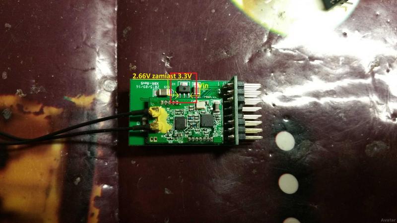 Witam, Może komuś się przyda. Mały tutorial jak naprawić odbiornik - w tym przypadku FrSKY X8R. Dokładnie tego samego dnia gdy przyszedł, wieczorem usiadłem aby go zbindować. Nie miałem pod ręką, żadnego regla ani modelu, tylko bateryjkę 2S - 7,4V. Przed podłączeniem myślałem - patrz uważnie na kabelki, co byś biegunów nie pomylił... No i stało się... pomyliłem się. Niestety odbiornik nie dawał znaków życia - jedynie słabe świecenie czerwonej diody i ledwo widoczne zielonej. Pierwsza myśl, że prawie 200PLN idzie do kosza. Uczciwość wzięła górę i postanowiłem nie odsyłać odbiornika na gwarancji z nadzieją, że może się uda wymienić na nowy. Ewidentnie moja wina, więc co będę kombinował. Po kilku chwilach konwersacji z wujkiem Google dało małą nadzieję. W innych odbiornikach FrSKY po podłączeniu zasilania na odwrót padały stabilizatory wejściowe 3.3V. U mnie było podobnie. Po pomiarach stabilizatora na wyjściu miałem 2.66V zamiast 3.3V. Po podłączeniu zewnętrznego zasilania 3.3V odbiornik zaczął działać prawidłowo. Jako zestawu naprawczego użyłem jakiegoś małego stabilizatora na płytce. Po jego wlutowaniu i zabezpieczeniu termokurczem(na zdjęciu jeszcze nie ma termokurcza). Odbiornik ładnie się łączy z apką i wysyła telemetrie. Mam nadzieję, że komuś się przyda. Pozdrawiam - Avatar.
