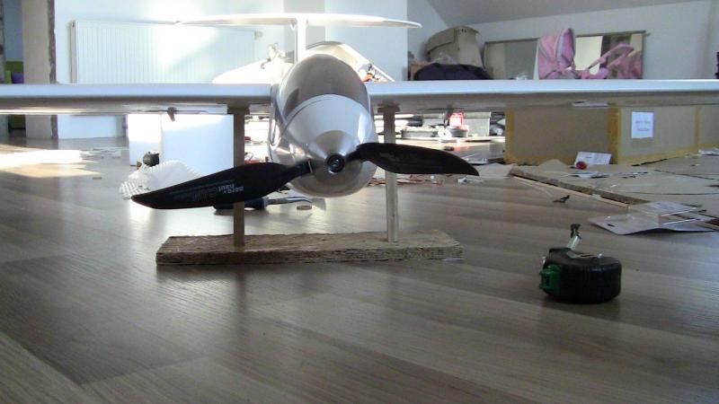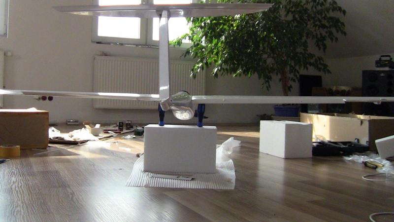 25. Zebrałem wszystko co powinno znaleźć się w środku prowizorycznie i oparłem go jak na zdjęciu. W środku dla sprawdzenia dwa lipo łączna waga 390 g. a cały model z tymi lipo 2,4 kg. Według tego podparcia i z tymi pakietami SC wypada teraz ok 105 mm do krawędzi natarcia, więc nie wiele mu trzeba aby przesunąć SC bliżej krawędzi. Myślę że taki pakiet 4000mAh powinien być ok. Ale w ogonie brak jeszcze wpuszczonej pianki. Za to inna rzecz mnie niepokoi, a mianowicie model przechyla się na jedno skrzydło. Aby był wyważony poprzecznie w miejscu łączenia końcówki skrzydła z wingletem muszę obciążyć 7g. Martwić się tym czy nie ?