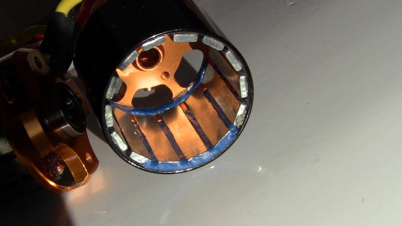 17. Bogdan, oczywiście że chodziło o statyczny nie wiem czemu tak wklepałem. Panowie, na jednym ze zdjęć widać jak neodym wysuną się ku górze, i to ten neodym zawadzając o izolację tak ja poszarpał. Silnik nie osiągną nawet 40 St. C, jak widać na zdjęciu silnik ma wypełnienie jakąś niebieską masa (może epoksyd) ale tylko trzech magnesów. reszta jest tylko przyłapana jakimś przezroczystym klejem. Gdyby wszystkie magnesy były zatopione, problemy raczej by nie było. Po prostu, jakiś Chińczyk nie dokończył klejenia i tyle. Silnik jak najbardziej do uratowania, trzeba wkleić ten jeden magnes i dokończyć zalanie pozostałych. Izolacja do naprawy i powinno działać. Dobrze że jak tylko zauważyłem wylatujące spod silnika pierwsze czarne paproszki od izolacji, natychmiast wyłączyłem.