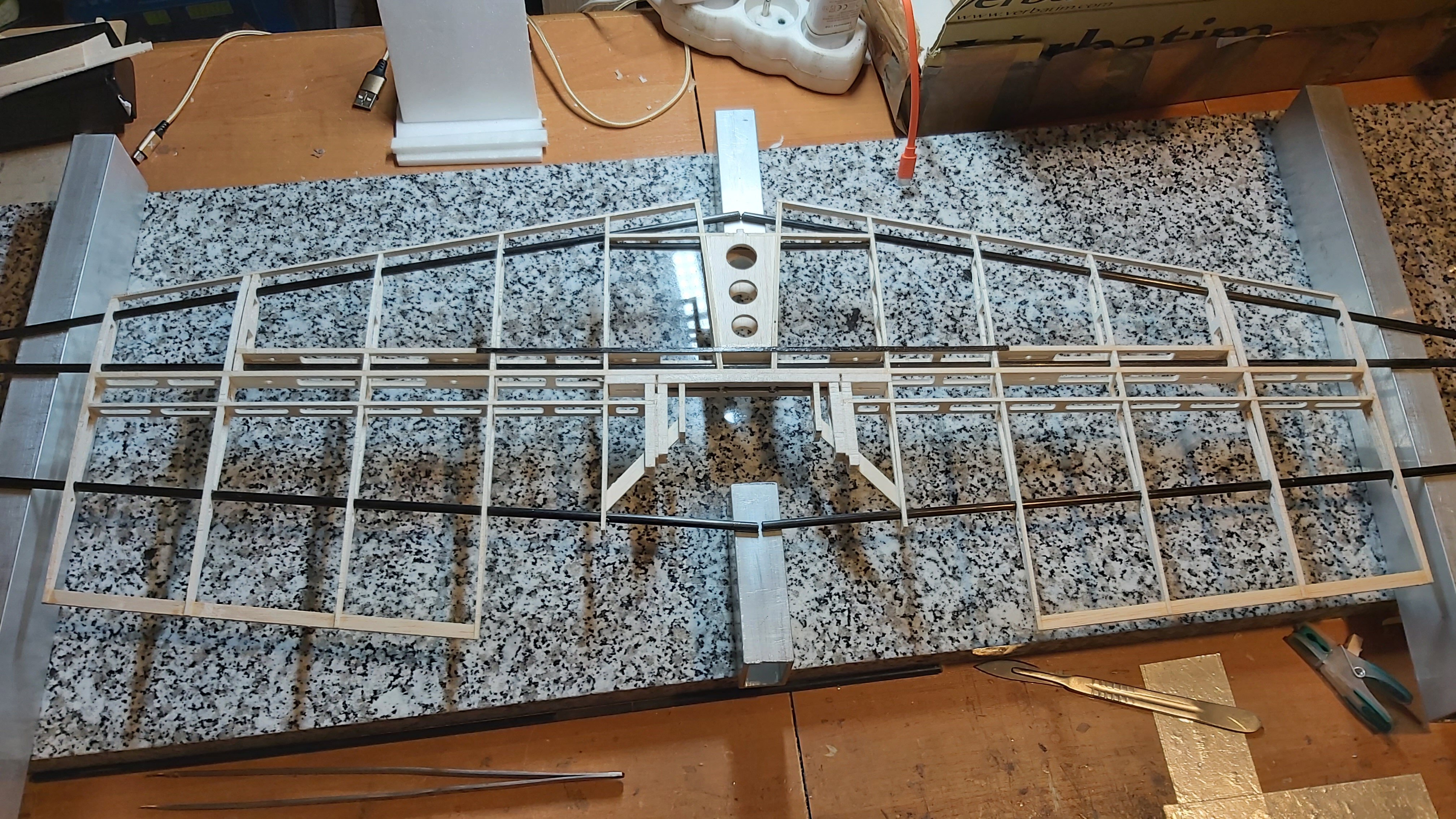 No więc tak: jak przenosiłem zestaw z auta do piwnicy była juz noc bo to z pikniku wracałem, no i miałem wrażenie że coś troche pogubiłem po drodze. Więc brakuje mi kwadratowych profili 3x3, jednego brakuje do kadłuba ale tamten może czekać bo jego da sie wstawić w każdej chwili byle przed wklejeniem trójkątnej listwy czyli spływu statecznika pionowego. Ale kurcze dzis brakuje mi kolejnego profilu i ten nie może czekać, chodzi o ten który idzie z przodu przez żeberka przykadłubowe. Zmodyfikowałem otwory i wstawiłem tam węglowa rurkę 4mm , mniejszej nie miałem, no i jest OK. Konstrukcja posklejana już jest , jutro jeszcze kontrola czy nie zrobiłem gdzieś mijaka gdzieś nie dałem kleju , jak bedzie OK to można kompletować poszycie i jeszcze z dwa podejścia wieczorkiem i stateczniki i stery wysokości będą zrobione. -