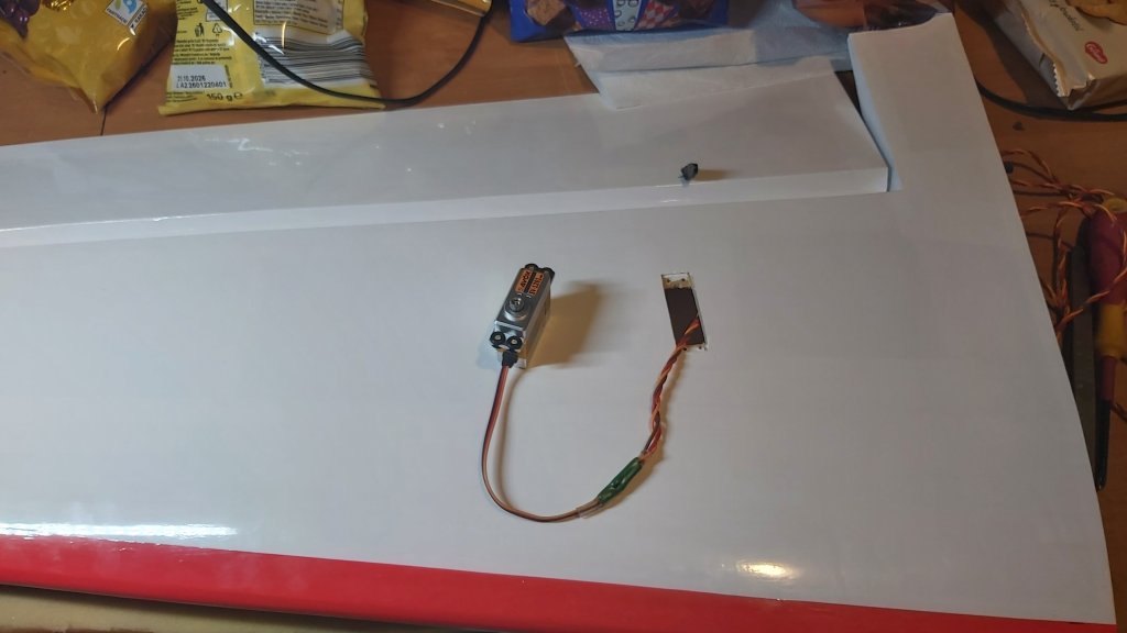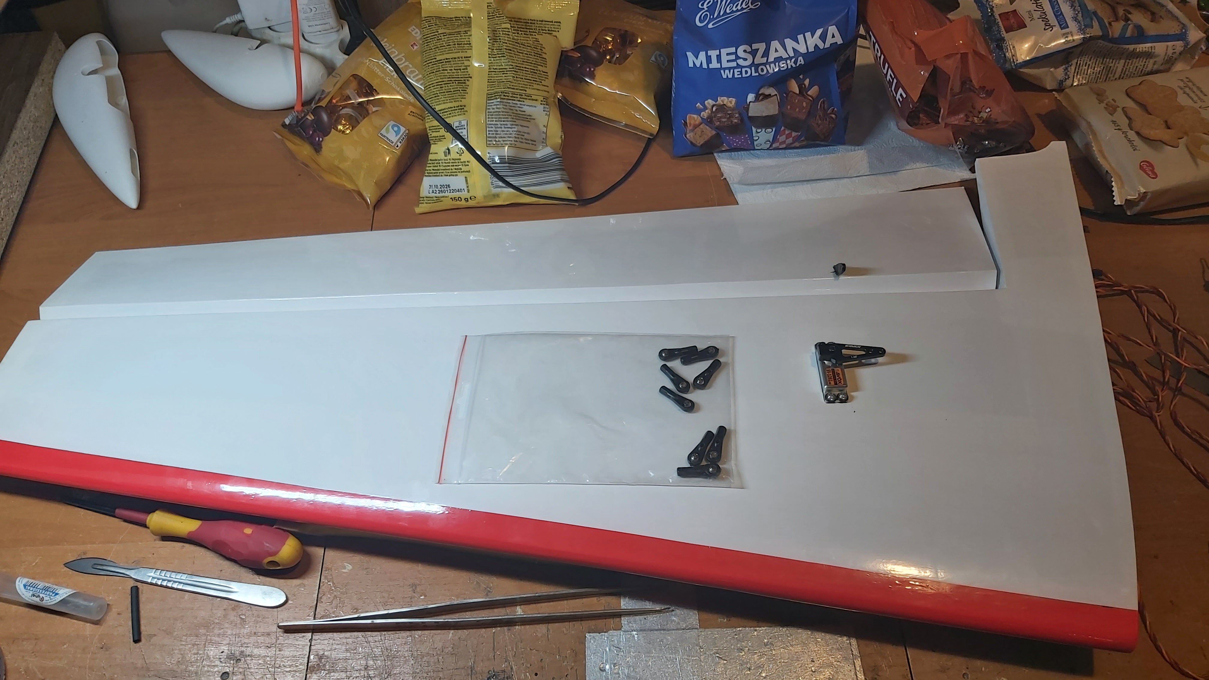 Wreszcie mam powklejane lotki na zawiasy , więc sklejanie skończone , snapy z sklepu modelarskiego sa do niczego , w ogóle otwory na popychacze nie trzymają średnicy , więc wynikła przerwa bo nie będę robił sterów na takim dziadostwie. Zamówiłem snapy od JPS RC , towar premium więc można składać , jedno skrzydło juz ma serwo drugie skrzydło serwo będzie miało jutro😀 . Wtyczki odcinam i lutuję przewody , przy okazji tracąc gwarancję na serwa😁. -
