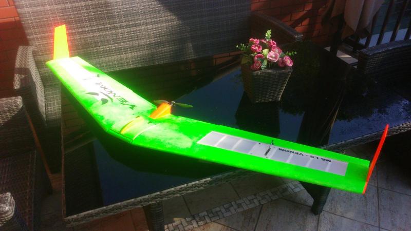 Bartek, nie wiem czy Polish Khaki jest polecana do PO - 2, prawdopodobnie nie. Nie jestem makieciarzem i nie znam się na tym. Zwyczajnie kolor mi się spodobał a jeszcze więcej nazwa, bowiem jestem Polakiem. Ot co. W dodatku mój samolocik nie będzie Pociakiem, tylko luźną wariacją na jego temat. Aerografu także nie posiadam, więc w grę wchodzi pędzel. Ale że faktycznie cena 100 zł nie wydaje się wygórowaną, pewnie zdecyduję się na takie rozwiązanie. Ostatnie kilka latadeł malowałem zwykłymi akrylami z użyciem gąbki, bo mam tych farb od cholery i trochę w najdziwniejszych kolorach. Ale że jest to wykończenie powierzchni raczej ohydne, stąd pomysł na coś innego. Wczoraj oblatałem nowe skrzydełko, pomalowane pomienionymi akrylami w kolorach oczojebnych. Z bliska powierzchnia wygląda fatalnie ale na niebie model widoczny jest doskonale. Także w wysokiej trawie z daleka widać czerwone, transparentne winglety. Nie ma najmniejszych problemów z odnalezieniem. Zdjęcie okropne, robione telefonem za co przepraszam. Lustrzanka chwilowo w serwisie.