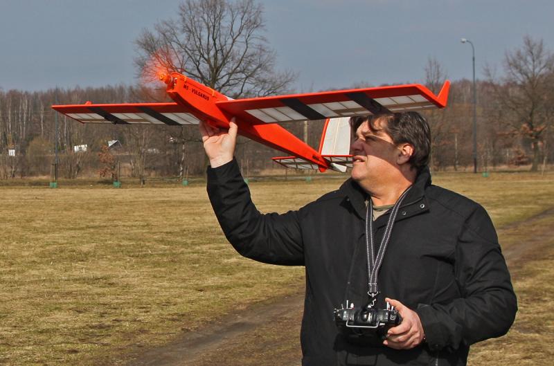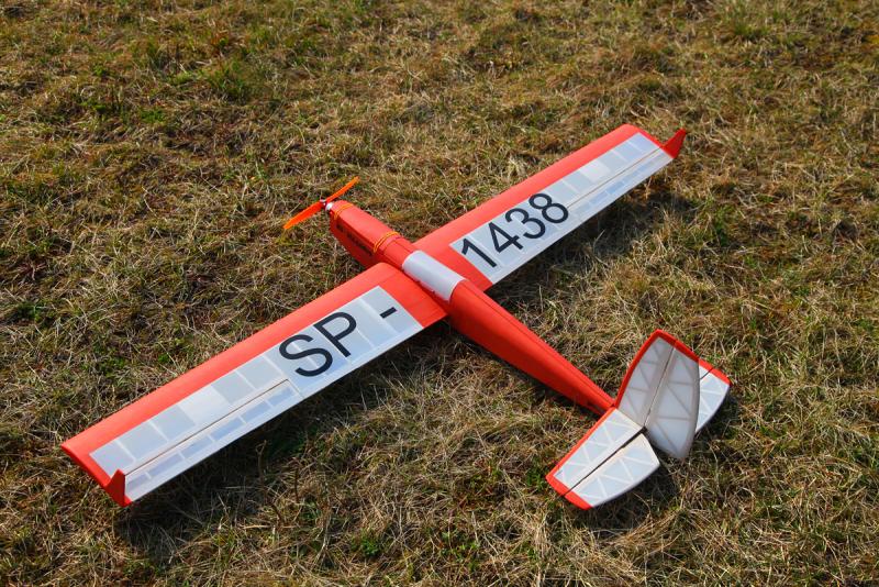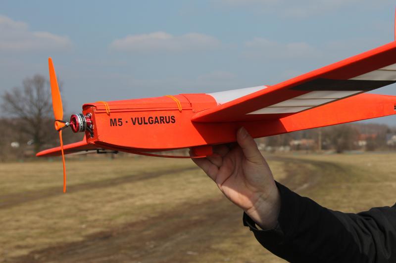 12. Dostojni! Na początek słowo wyjaśnienia: dlaczego " Vulgarus" ? Ano dlatego, że nazwa konweniuje z moim, że tak powiem... sposobem bycia. Nie będzie to stricte relacja ze zdjęciami z budowy, bo, po pierwsze - takich prostych samolocików na forum dostatek i kolejna wielostronicowa relacja o byle czym, mogłaby być nie do wytrzymania, po drugie - samolocik budowałem, po raz kolejny " z głowy ", bez jednego choćby rysunku, i do końca nie wiedziałem ani co wyjdzie ani jak wyjdzie ani czy poleci. Ale poleciał! M5 Vulgarus ( M5 - bo na imię mam Michał i to piąty model, który wyrzeźbiłem za czasów mej, krótkiej jeszcze, bytności na naszym forum ) to aeroplan całobalsowy. Jedynie boczki kadłuba, odrobina " podłogi " i wręgi są ze sklejki 1,2mm, podklejonej twardą balsą 2 mm. Ale po kolei: rozpiętość - 1500 mm powierzchnia - 25,5 dm2 długość - ? ( nie sprawdzałem ) masa - 779 gr obciążenie - 30,5 gr/dm2 profil - S 7055 ( bo płaski spód, bo prosty w montażu i nie wymaga helingu ) zaklinowanie - 1,5 stopnia cięciwy: 19 przy kadłubie, 15 na końcówce. stateczniki płaskie, konstrukcyjne skrzydło konstrukcyjne, jednodźwigarowe, z zamkniętym kesonem z balsy 1,5 mm kadłub - przód skrzynka ze sklejki, tył - kratownica z listew sosnowych, całość kryta balsą 1,5 mm. silnik - Emax CF 2822 ( z początku miał być inny, ale że po licznych kretobiciach wylądował w sanatorium u naszego forumowego kolegi Andrzeja AMC, ja zaś model skończyłem w piątek i koniecznie chciałem w sobotę go oblatać, poleciałem do lokalnego, niezwykle biednego i słabo wyposażonego sklepu, w którym to sklepie dostępne były wyłącznie używane w/w Emaxy po ... 20 złotych , nabyłem jeden, przykręciłem i na razie jest git ) regiel ZTW 20 amp śmigło - GWS 8x6 ( ale będę testował inne ) pakiet - 3S 1300. serwa - TP 92 R odbiornik 6 kan lotki zróżnicowane Skrzydła jako i stateczniki wklejone na stałe, bo mieści mi się to wszystko w samochodzie. Płaty zamocowane na łącznik, sklejony z 5 warstw sklejki 1 mm na żywicę, całość zaś wklejona między dźwigary, przepuszczona przez kadłub i we środeczku przyklejona do dwóch wręg. W razie kreta nie do naprawy... Skrzydło pokryłem Koverallem 17 gr/m2 i cellonowałem. Przepiękne i niezwykle awangardowe malowanie to zwykły akryl, nakładany gąbeczką i gdzieniegdzie pędzelkiem. Model nieznacznie doważony na nosie wałeczkiem ołowianym 15 gr. Jak na mój gust zbyt powoli wychodził z " dive testu " czyli nurkowania, ale ostatecznie mogę się mylić. Choć był w pełni sterowny i zachowywał się poprawnie w locie, to jednak strzeżonego Pan Bóg strzyże, stąd ten wałeczek. Mogłem kupić większe pakiety ale jednak wałeczek tańszy. Nie obyło się oczywiście bez tzw, dania du.... Np. namoczyłem górny keson, ułożyłem elegancko na żebrach i zamiast poczekać aż wyschnie, przykleiłem wilgotny. Po wyschnięciu i zdjęciu ciężarków ze skrzydła, oczom ukazał się piękny banan. Matkobosko! Całość musiałem moczyć płynem do mycia okien, przygniatać do deski, podpierać końcówki i na środku stawiać puchę z farbą i inne takie... W końcu się udało i banan, jak spojrzeć wzdłuż spływu, ma może milimetr ugięcia. Uff! W locie nie widać różnicy. Idzie równo, bez najmniejszego trymu na lotkach czy kierunku. Jedynie radykalnie zmniejszyłem wychylenia steru wysokości i dołożyłem 30% expo. W pierwszym locie model reagował na SW bardzo mocno, wręcz brutalnie. A jak lata? No... cudnie lata. Oczywiście. Idzie dość szybko na tym małym motorku, reaguje poprawnie na stery, ani na milimetr nie przepada w zakrętach, nawet nie trzeba zbytnio nosa podciągać wysokością, prawie wcale. Do następnych lotów muszę jedynie zwiększyć wychylenia lotek, bo pętelkę wykręcił ochoczo ale beczki już nie chciał. Choć może to brak umiejętności, kto wie... Chyba dzięki profilowi, model jest mało czuły na wiatr. Latałem przy 8 m/sek i było super. Samolocik łatwy w pilotażu ale jednak nie dla zupełnego " greenhorna". Nieźle szybuje z tym kręcącym się śmigłem. A gdyby założyć składane, to już w ogóle byłby miód i malina... Ale wolnego nie mam a za nowe chcą stówkę z dostawą, złodzieje... Na koniec kilka zdjęć, statycznych i ze startu. W locie nie mam, bo kolega fotograf, taki prawdziwy profesjonał z Canonem FF i obiektywem za naście tysięcy złotych, operator filmowy itd, powiedział że tym obiektywem to można tylko z bliska. Że z oddali to może " nastempnom razom " a może nawet film... Zobaczymy. pozdrawiam Wszystkich, dziękuję za uwagę i do " nastempnej razy ", może przy okazji czegoś większego... - Michał.