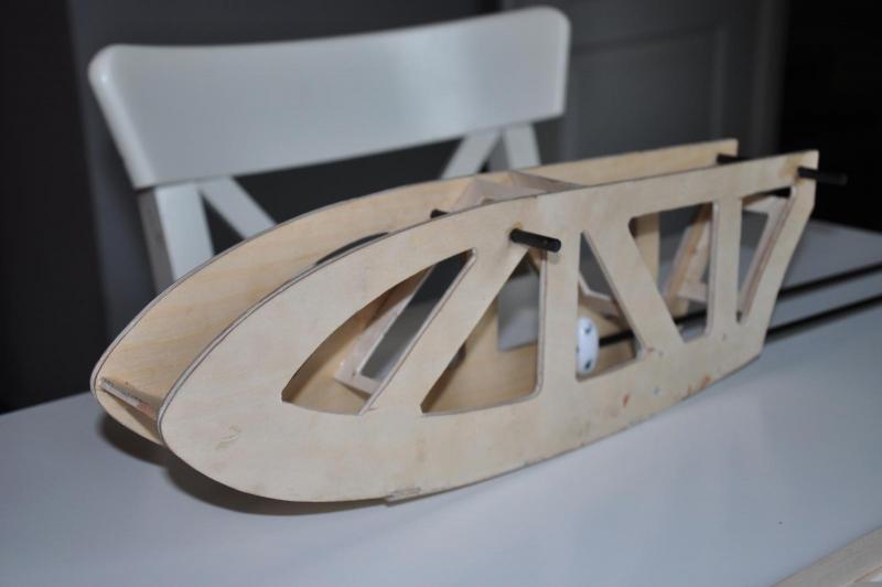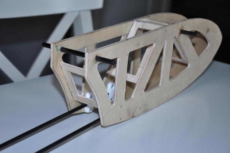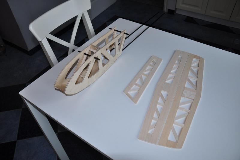 Witajcie! Zapewne myśleliście że temat zarzuciłem i nie będziecie musieli odpowiadać na moje głupie pytania, hehe? Otóż nic z tego. Ruszyłem z budową i powoli zmierzam do celu. Prawie cały ( dość paskudny ) kadłub zrobiony oraz stateczniki. Boki kadłuba to przekładka: sklejka 1,2 - balsa 2 - sklejka 1. Całość sklejona Pattexem zaś wręgi wklejone na żywicę. Wręgi wycięte ze sklejki 1,2 i podklejone twardą balsą 2 mm. Ogon to dwie rurki węglowe 5mm, przykręcone do boków kadłuba na plastikowe mocowania do podwozia. Strasznie długo ustawiałem te dwa pręty, żeby sterczały mniej więcej równolegle. Półmilimetrowy ruch przy kadłubie, daje 1 cm na końcu. Ale w końcu jakoś się udało. W każdym razie po osadzeniu usterzenia i ustawieniu odpowiednich kątów, rurki zamierzam przykleić/przylaminować do kadłuba. Stery to typowa balsowa konstrukcja z lekkiej balsy 2 mm i kesonów z balsy 1mm oraz adekwatnych nakładek na rozpórki / stężenia. Wyszły dość lekko i mocno. Pokryte Koverallem uzyskają dużą sztywność. Tak więc stery klasyczne. Miał być Rudlicki ale to może następnom razom . Całość na razie waży 272 gramy. Celuję w 1,1 - 1,2 kg co chyba jest realne. Przy powierzchni skrzydeł 32 -32,5 dm2 da obciążenie rzędu 37 - 39 gr/dm2. Wartość przyzwoita. Model będzie powolny ale nie jak gazeta na wietrze. Hope so... Przede mną budowa skrzydeł. Tutaj pytanie do Was: jaki profil? Wstępnie myślałem o klasyku czyli Clarku Y. Profil sprawdzony, oblatany w milionach samolotów i modeli, wybaczający błędy i prosty w konstrukcji. Położony na płasko, daje naturalny kąt zaklinowania rzędu 1.8 - 2 stopnie. Same zalety. Ale... są profile nowsze i lepsze. Tyle że ja nie potrafię nic sensownego wybrać. Więc może coś podpowiecie zagubionemu, początkującemu modelarzowi? Poniżej kilka nieudolnych zdjęć mojego autorstwa. ps. sklejka na kadłubie strasznie usmotruchana ale taką miałem na stanie; przecie nie wyrzucę... -