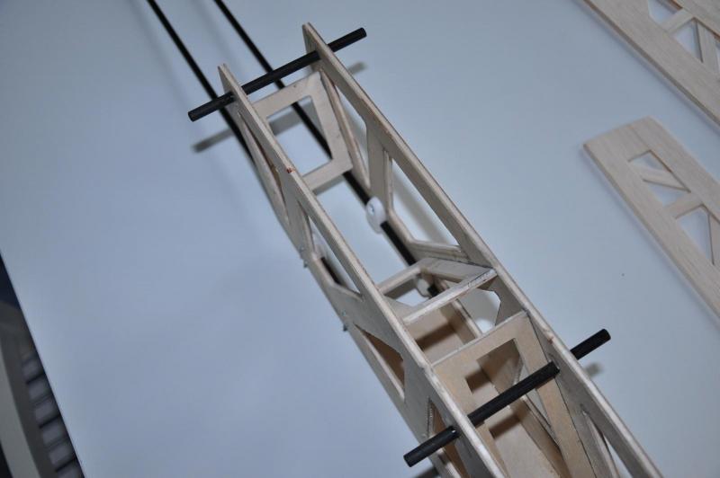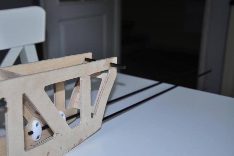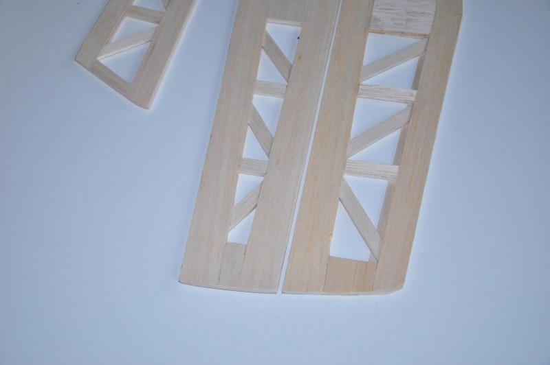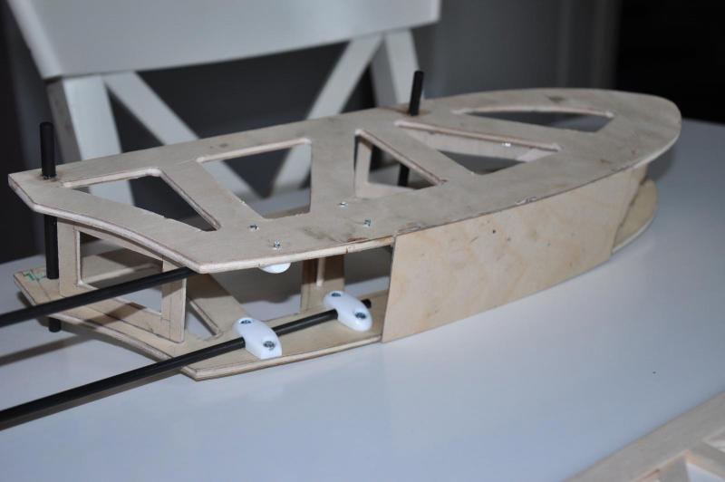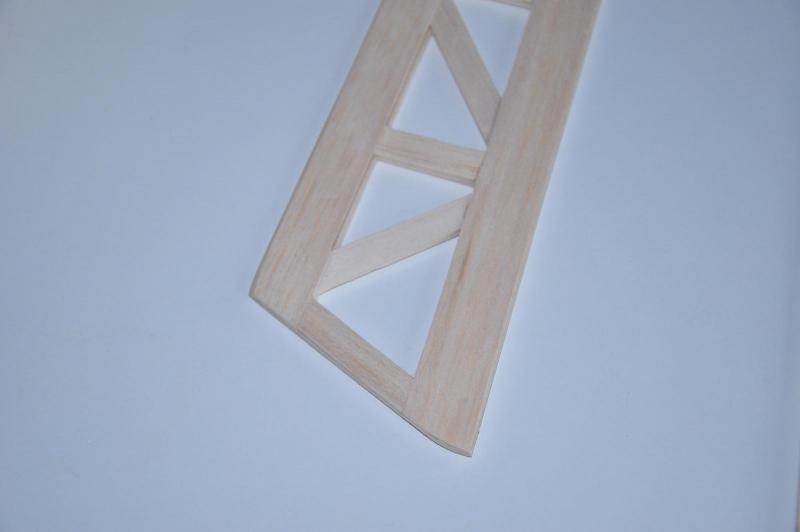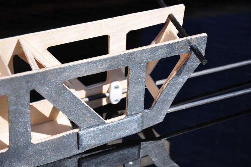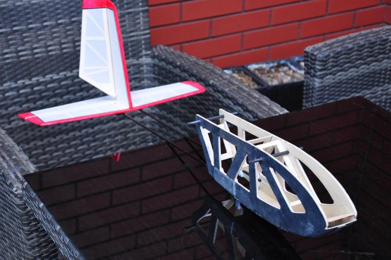 Sztywność jest zadowalająca do spokojnego latania. Pewnie zawodowcy by psioczyli ale dla mnie jest ok. Rurki pod statecznikiem są połączone taką półeczką z dwóch sklejek z przekładką z balsy, co znakomicie usztywnia ogon. Za to rozwiązanie jest lekkie, co powinno umożliwić wyważenie. Mordka tak na oko krótka ( tak mi się wycięło ) ale z dużym pakietem będzie wporzo. Najwyżej wsadzę trochę ołowiu. Na razie i tak jest dość lekko, więc odrobina balastu nie zaszkodzi. W razie czego. Otóż w miejsce silnika przyczepiłem skoczem 50 gr ołowiu i wtedy w dziób musiałem wsadzić 120 gramów innego ołowiu. Tak mniej więcej. Powinno działać. -