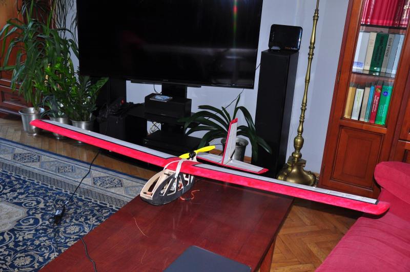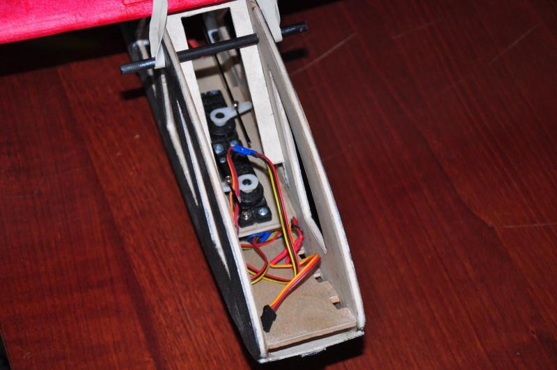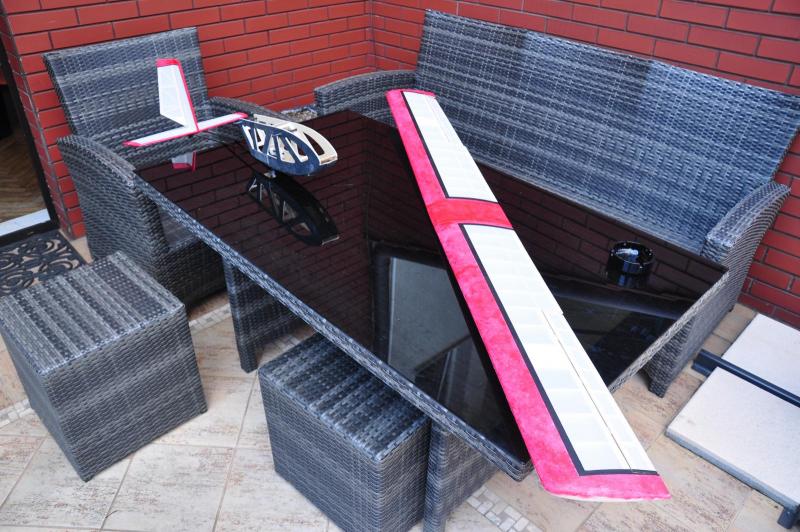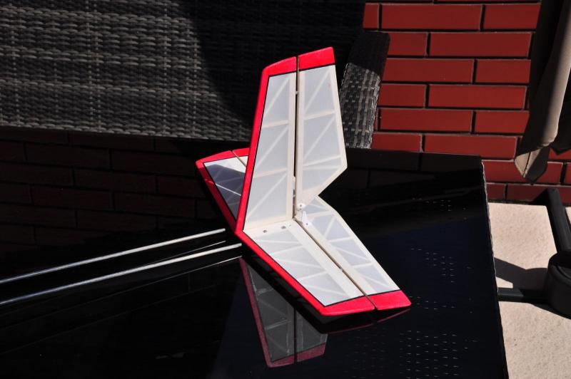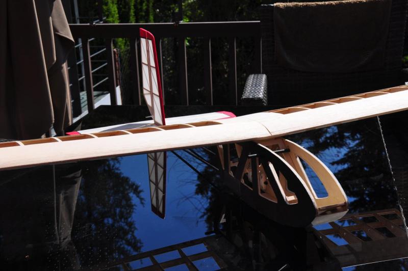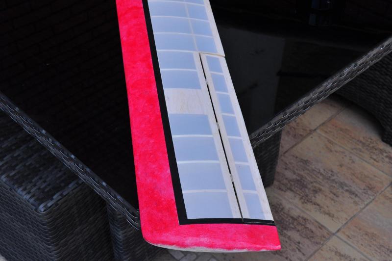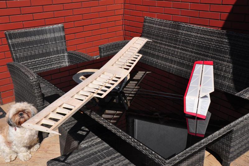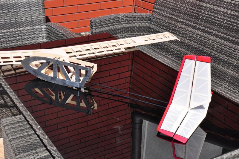 Przyczepiłem skrzydło jakąś parchatą gumą ( muszę kupić nową ) i samolocik na pusto wyważył się mniej więcej 1/3 od krawędzi spływu. Czyli jest dobrze. Co prawda gdzieś w okolice spływu powędruje 55 gramów silnika + śmigło ale za to na przód pójdą serwa standard, pakiet, regiel i odbiornik. Na ogon pójdą jeszcze węglowe popychacze sterów i kilka kawałków rurki ( czerwonej, od bowdenów ) jako prowadnice i dwa małe, plastikowe snapy, ale to wszystko razem waży tyle co nic, więc powinno być dobrze. Mimo krótkiej mordki. Która zresztą wygląda lepiej niż długi ryj. -