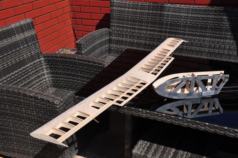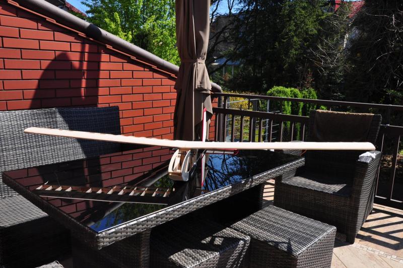 Chwilę nic nie pisałem, co nie znaczy że w temacie nic się nie działo. Samolocik dostał skrzydło, usterzenie zostało pokryte, pomalowane i zajęło swoje stałe miejsce. Można powiedzieć że model ukończony w 70%. Pozostało dorobić końcówki skrzydeł, pokryć ( paczka z Koverallem i kilkoma innymi drobiazgami w drodze ), wsadzić wyposażenie czyli serwa i napęd sterów, serwa lotek, dorobić płozę pod kadłubem ( latam na trawie ) i zabrać się za wyważanie. Po ustaleniu ciężarów, kupię silnik, pakiet i regulator. Mimo dość krótkiej mordki, mam nadzieję że ołowiu będę woził nieznaczną ilość. Skrzydło będzie miało, wraz z końcówkami które dopiero " się robią ", 176 cm rozpiętości i pow. około 34 dm2. To co na zdjęciu waży 480 gr a więc dość lekko. Mam nadzieję że waga 1- 1,2 kg jest jak najbardziej realna. Tak więc obciążenie nie powinno przekroczyć 35 gr/dm2. Pozwoli to na spokojne, powolne przeloty a kto wie, może nawet na łapanie termiki. Choć ani konstrukcja, ani przeznaczenie ani profil ( Clark Y ) nie predestynują tego samolociku do miana szybowca termicznego. -