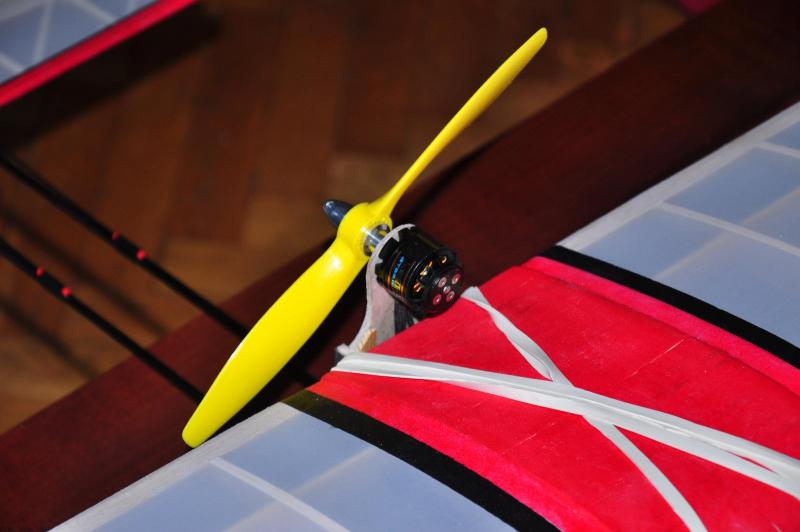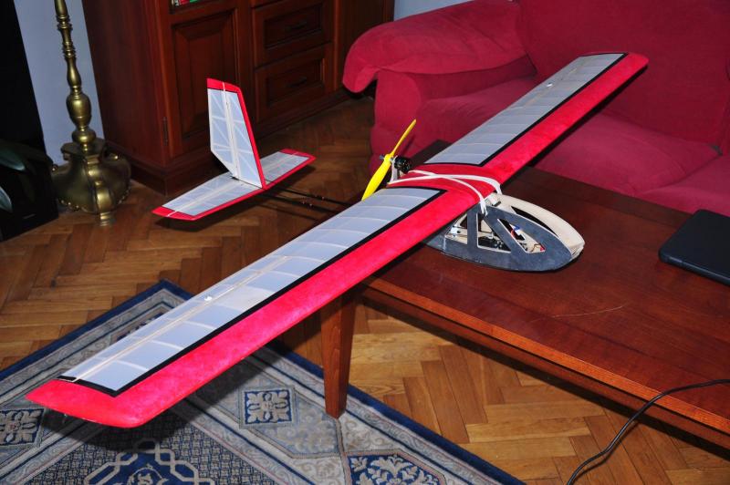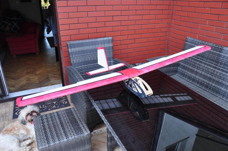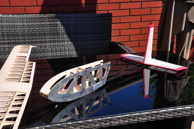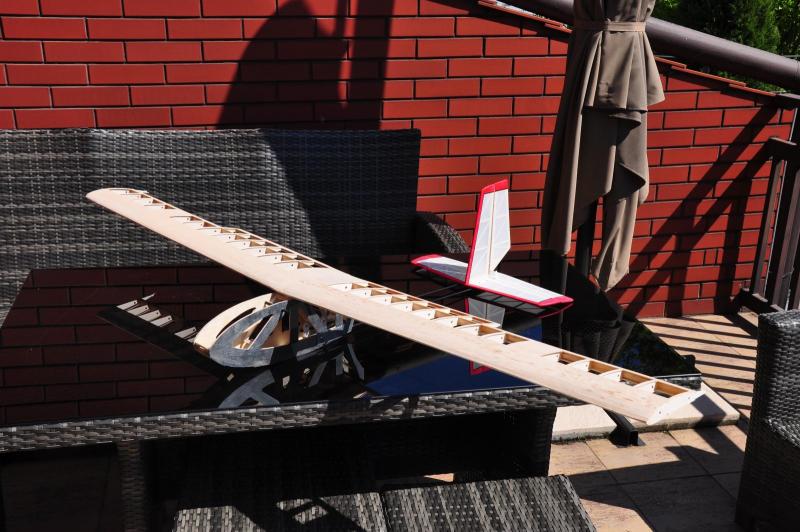 Model w zasadzie ukończony.Pozostały jakieś drobne prace malarskie, coby samolot nie świecił gołą sklejką bo nie uchodzi, wsadzić resztę elektroniki, wyważyć pakietem i w górę. Pakiet nawet mam, jakiś Gens Ace 1800 tylko nie wiem czy nie za lekki. Leciutko spuchnięty, dar od kolegi modelarza. Ale ja nie o tym chciałem: otóż silnik to Emax GT 2210/11, 1470 kV, o ciągu 800 gr i mocy 192 W. Taki miałem i z takim model będzie latał. A że waży bez pakietu +/- 900 gr, myślę że mocy wystarczy choć demonem wznoszenia nie będzie. Ale i nie ma być. Do tego silnika producent przewidział śmigło 9 x 4,7 do 2S, ale jako że w sklepie akurat takiego nie było, kupiłem 9 x 6. Stąd pytanie: czy zakręci tym śmigłem w sensie czy się nic nie stanie? Bo zamawiać przez net jedno śmigiełko za kilka złotych.... Na koniec ogólne zestawienie: rozpiętość - 174cm długość - nie mierzyłem pow, skrzydeł - 35, 6 dm2 obciążenie - w okolicach 30 gr waga -w okolicach 1050 gr serwa: kierunek i wysokość - Sanwa SRM 102, lotki - mini Robbe na metalu o sporym uciągu, symbolu nie pamiętam a nie będę teraz rozkręcał skrzydeł pakiet - jeszcze nie wiem regulator - ZTW 20 amp. -