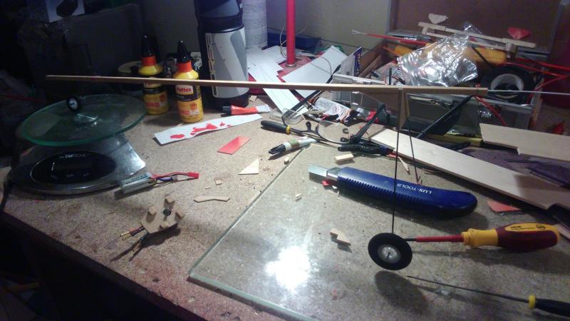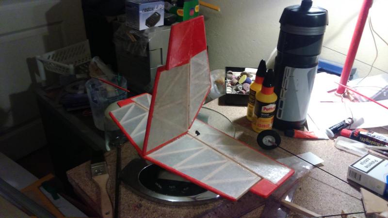Kolejny etap za mną. Samolocik dostał statecznik pionowy, podstawek ( nazwijmy go mostkiem ) pod skrzydła oraz półkę na serwa. Tak jak przypuszczałem, mostek mnie wykończył a jeszcze jest przy nim odrobinę pracy. Położyłem swoje dotychczasowe osiągnięcia na wagę, dołożyłem 10 gramowe serwa Robbe ( mam SG 51 ale są kiepskie, choć zysk 10 gramów kusi ), dwie szprychy rowerowe ( drutu 1,5 mm nie mam ), kawał bowdena z metalowym snapem, odbiornik, dołożyłem deseczkę balsową i kawał japonki i wyszło 128 gr. Nie jest źle, bowiem mój Patyczak przecie jest sporo większy od oryginału. Wraz z przewidywanym wyposażeniem powinienem się zmieścić w 180 gr. Pora zatem zamawiać motor, bateryjkę i regiel. Kiepskie zdjęcia robione telefonem. A mówili w reklamach że przewyższa lustrzanki... PS Czy ktoś z Was orientuje się ile kosztuje przesyłka z HK?