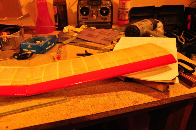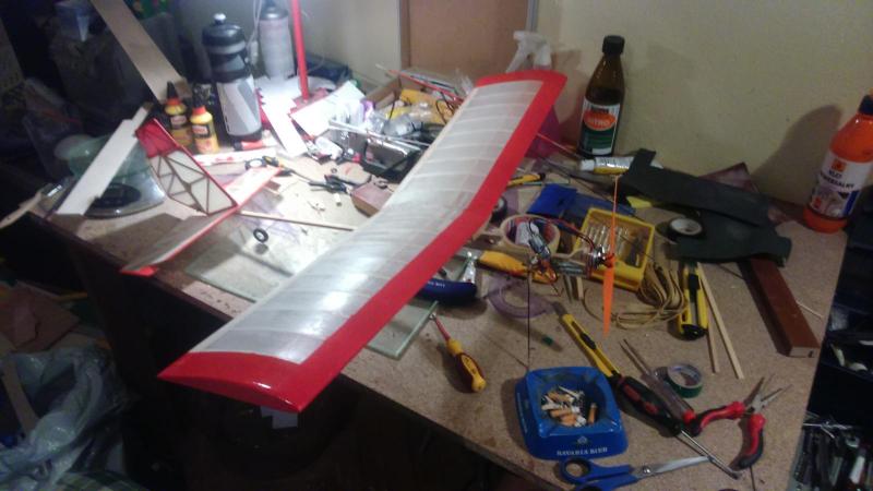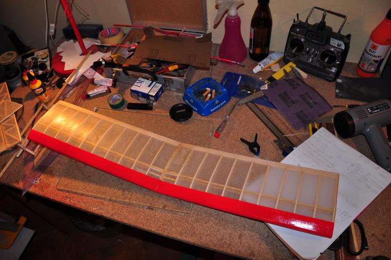 No bez przesady za stary już jestem na takie zabawy. Jak będę potrzebował to sobie kupię. Ale... po wizytach w trzech urzędach ( US, ZUS I KRUS ) , które zawsze są miłe sercu każdego obywatela, wracam ci ja do domu, schodzę do piwnicy i co widzę? Skrzydełko jako tako się naprężyło i tragedii nie ma. Wczoraj wstępnie i na szybko wysuszyłem Capon opalarką ale to było za mało. Dopiero jak podeschło całą noc, to się papier napiął. Natomiast tragedia jest ze statecznikami. Tutaj już nic nie pomoże. Trudno, wyszlifuję krawędzie i musi wystarczyć. Skrzydełko dostało kolorek. Na razie tylko od góry. Jutro pomaluję od dołu oraz końcówki. Bez koloru strasznie smutna ta japonka. Stateczniki też pewnie podmaluję na natarciach. Oczywiście przy tych manewrach zrobiłem dziurę w skrzydle długim pazurem, ale załatałem szczęśliwie. W zasadzie powinienem płat jeszcze pocaponować 2 - 3 razy, wyszlifować, pokryć podkładem, wyszlifować jeszcze raz i dopiero malować ale to mnóstwo nikomu nie potrzebnej pracy a także dodatkowa masa. Więc tylko delikatnie podszlifowałem i popsikałem farbą. Podniesiony na duchu tymi pracami, zamówiłem w pewnym znanym sklepie silniczek, bateryjkę, regiel oraz inne popierdółki typu popychacze węglowe, snapy, dźwignie sterów, kółeczka, gumę do mocowania skrzydeł itd. Czekam zatem z pracami do poniedziałku. Chwalą się że wysyłka w 24h. Zobaczymy. -
