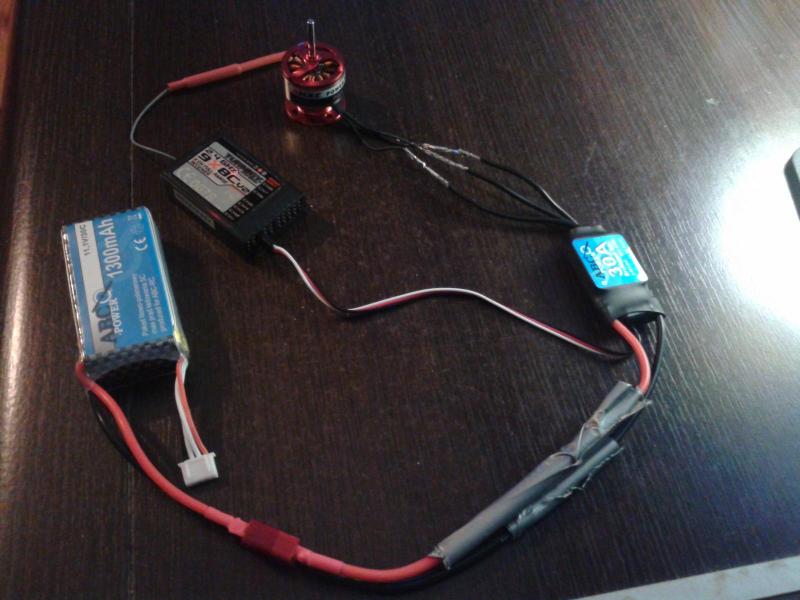Dzień dobry, proszę o pomoc w programowaniu regulatora. Silnik: EMAX CF2822,, Odbiornik: Turingy 9xBC V2 (Nadajnik Turingy 9x) Akumulator: ABC Power 1300 mAhv 3C 11,1 V, Regulator: ABC Power 30A Brushless ESC 2-3 Lipol BEC 5V 2A. Nadajnik został zbindowany z odbiornikiem. Serwa działają poprawnie. Do odbiornika podłączyłem się pod kanał trzeci. Połączenia między regulatorem i wtyczką od zasilania zlutowałem i zabezpieczyłem izolacją. Połączenie silnika z regulatorem tymczasowo (tylko celem sprawdzenia układu) zrealizowałem wtykami. Sprawdziłem napięcia: na akumulatorze miernik wskazuje 11,3 V; na podłączeniu regulatora do odbiornika 5V. W czym problem: Postępując zgodnie z instrukcją programowania regulatora, połączyłem cały układ zostawiając odłączone jedynie zasilanie. Włączam nadajnik, przestawiam dźwignię przepustnicy w położenie skrajne górne, podłączam zasilanie. Wówczas silnik wydaje 3 krótkie dźwięki, nastepuje 1 sekundowa przerwa, a następnie dźwięk tak jak by schodkowy, coraz wyższy, składający się z 3 szybkich sygnałów, potem nic. Jakiekolwiek zmiany wychylenia dźwigni (do położenia neutralnego, skrajnego dolnego, innych) nie powodują żadnej reakcji ani silnika, ani regulatora. Wykonuję tą samą czynność, przestawiając dźwignię w położenie skrajne dolne jak i każde inne i dalej ta sama reakcja silnika- WNIOSEK: niezależnie od położenia dźwigni, jeżeli najpierw włączam nadajnik a potem podłączam zasilanie to reakcja jest taka sama, opisana powyżej. Kolejna czynność: Układ jest cały połączony, włącznie z zasilaniem. Włączam nadajnik z dowolnie ustawioną dźwignią, wówczas silnik losowo reaguje: jednym lub dwoma krótkimi piknięciami. Nie ma tu żadnej zależności- sprawdzałem. Żadnej innej reakcji silnika nie stwierdziłem, proszę o wskazówki w czym może tkwić problem. Byłbym wdzięczny za jakąkolwiek radę. Podejrzewam, że któryś z elementów regulatora nie działa poprawnie. W załączniku zdjęcie połączonego układu.