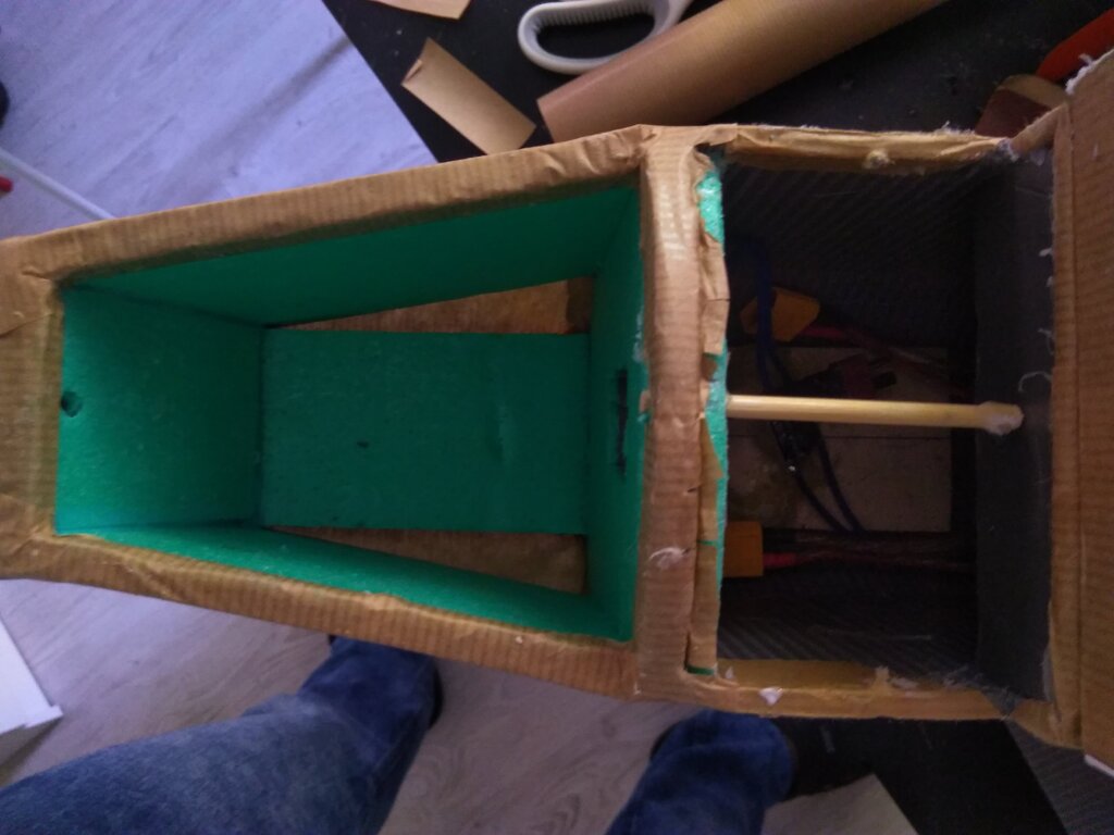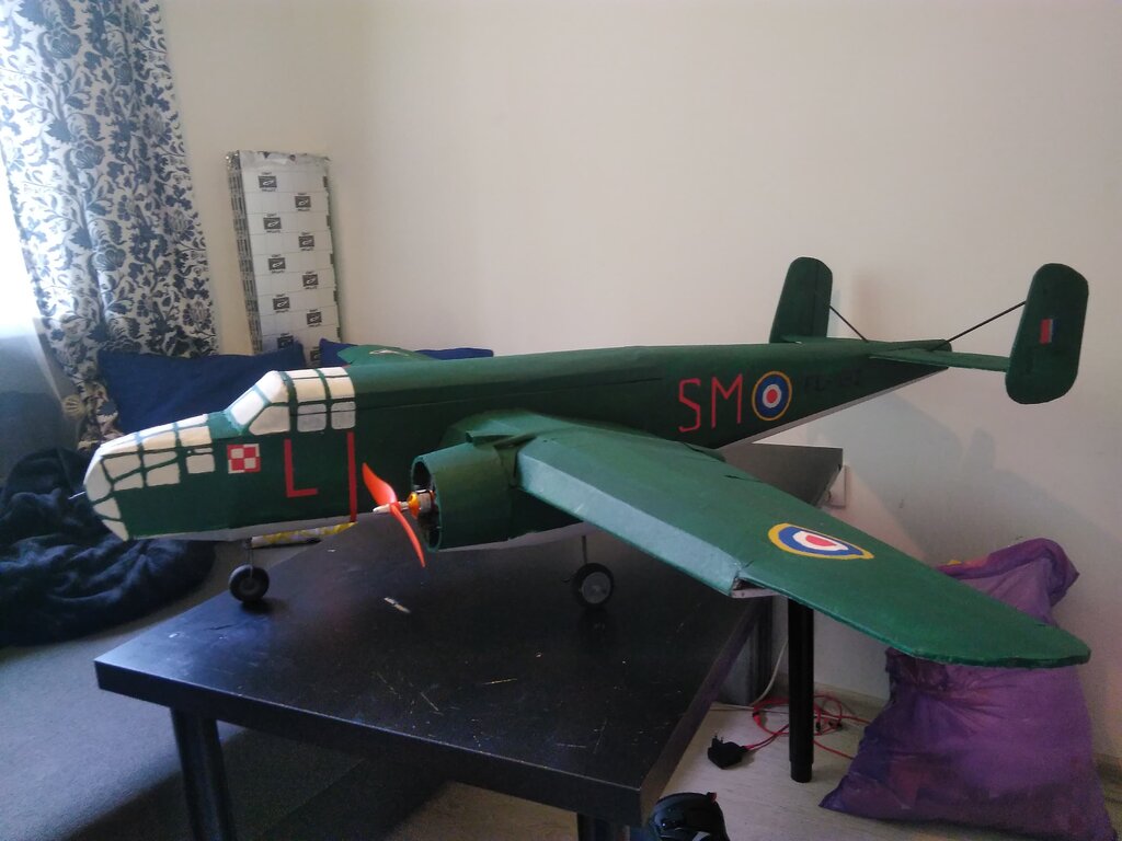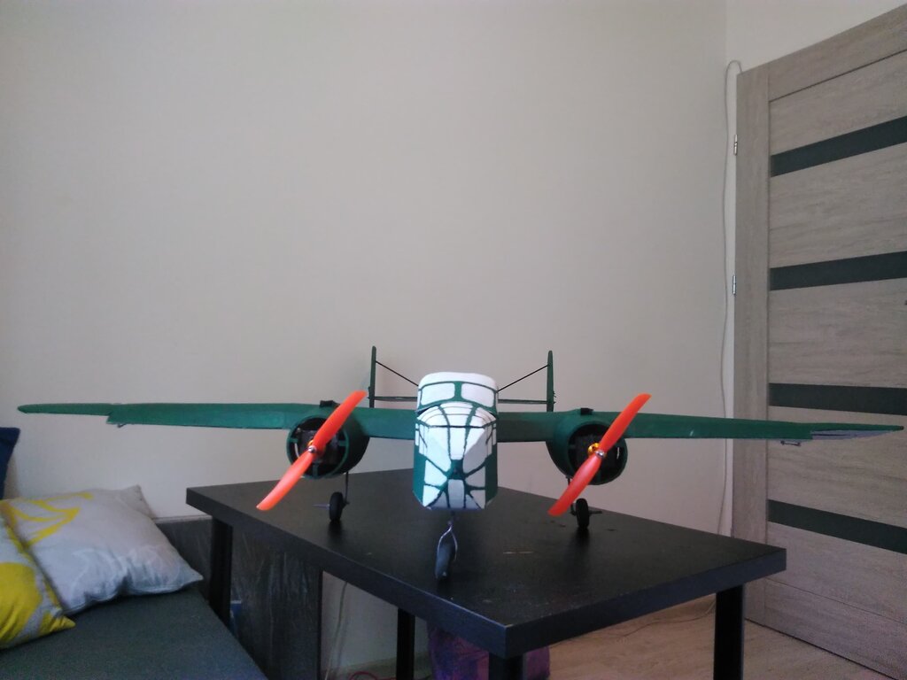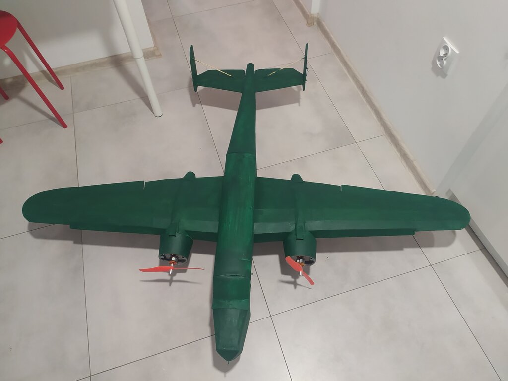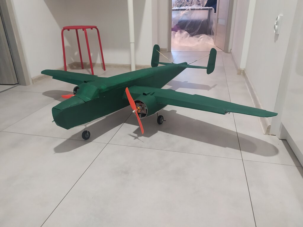 Do dzisiaj udało mi się doprowadzić w miarę mechanizm kierunków do działania, lecz nie podoba mi się nadal to jak działa więc czeka mnie zamówienie pręta fi 2 żeby przegwintować końcówki i zastąpić nim bowdeny, niestety na tych kierunkach zeszło mi więcej czasu niż myślałem więc jestem trochę do tyłu względem tego co planowałem. Za to mam już prawie skończone oklejanie gondoli przez co zbliżam się do możliwości pomalowania go. Jeszcze udało mi się dzisiaj wyjść po raz pierwszy przewietrzyć B25. Brak sterowanego przedniego kółka poskutkował zerową skrętnością na ziemi na krótkich odcinkach więc zrezygnowałem z lotek na osobnych kanałach znalazłem jakiś kabel Y spiąłem razem lotki i wszystkie 3 dostępne mixy we flysky'u poświęciłem na domiksowanie kierunków z silnikami, poniżej zamieszczam zdjęcia, a gdy skończy się przetwarzać film (działanie mechanizmu kierunków oraz pierwszy spacerek hah) na youtube to dodam później link. ( https://youtu.be/H2VvHoaKFLo ) -