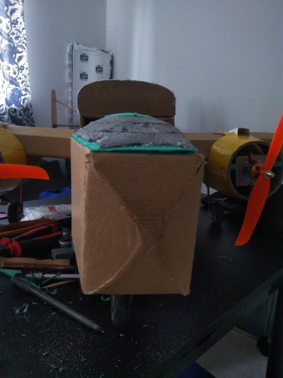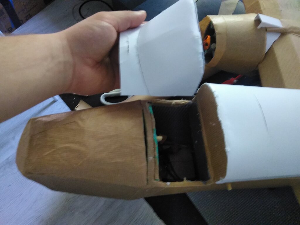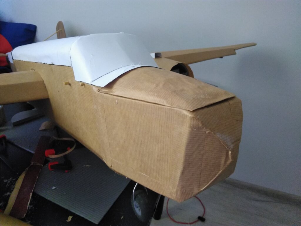 Teraz zmiany które robię są mało widoczne a trochę czasu zajmują, zamaskowałem szczeliny na łączeniach kadłuba oraz na nosie, również na ogonie dorobiłem końcówkę, a na zdjęciu w poście wyżej już widać też zamknięcie nosa i kabiny, początkowo miało być to po prostu naklejonym papierem który będzie trzymał kształt ale przez niepewność jak będzie z wyważeniem, a prawdopodobnie pakiet będzie musiał iść bardzo do przodu zrobiłem te dwa elementy osobno oraz są zdejmowane, dodatkowo odkleiłem jednak taśmę dwustronną z gondol i papier przykleiłem soudalem 64A bo takiego akurat mam a łatwiej na krzywiźnie już ułożyć papier na kleju niż na taśmie, więc czekam aż klej wyschnie i zostanie mi przyciąć naddatek papieru, gdybym miał robić ten model jeszcze raz to na pewno niektóre rzeczy zrobiłbym inaczej. -