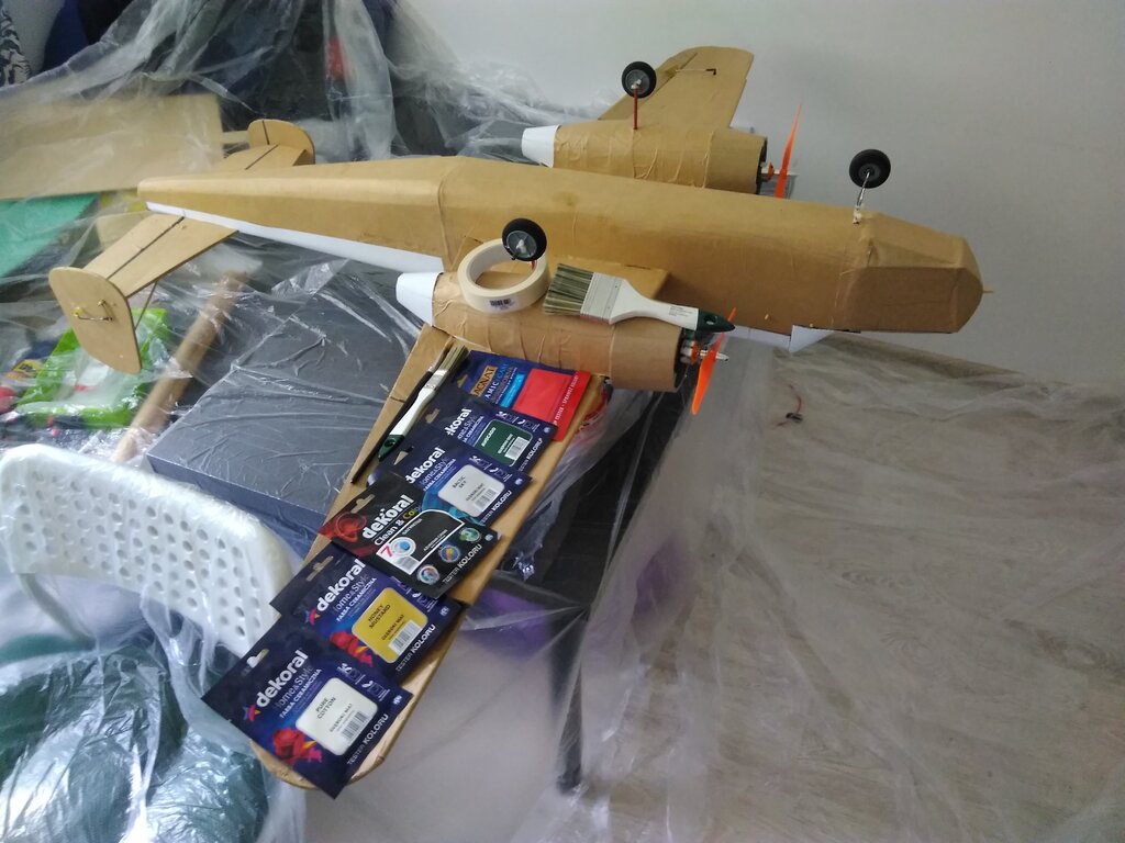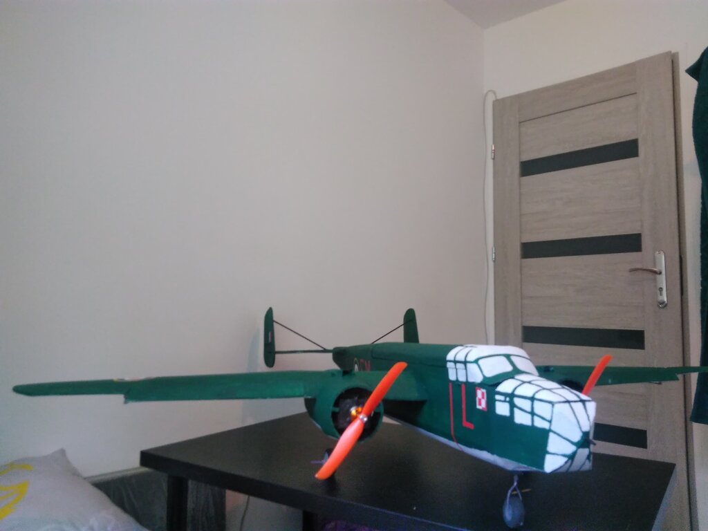 Na dzisiaj malowanie kończę coś z doskoku udawało mi się podmalować w międzyczasie okazało się że za mało farby kupiłem więc byłem w obi po kolejne testery, bazowe kolory mam skończone jutro zabiorę się za oznaczenia i okna. zastosowanie białego papieru technicznego było średnim wyborem bo trochę pije tą farbę więc na elementach które były białe najbardziej widać ślady pędzla, będę wiedział na przyszłość, a poza tym jak na pierwszy raz to chyba nie wyszło tak źle. Niestety zbliżam się do granicy 2kg, na obecną chwilę po pomalowaniu model waży 1666g a jeszcze muszę do niego zamówić pakiet, mam już wybrany czekam tylko na możliwość bo niestety ale mogą być problemy z wyważeniem, obecnie muszę 3 pakiety (2x 3S 1100mAh +1x 2S 1100mAh) całkiem w nos wkładać żeby stał na wszystkich kołach bo na pusto przechyla się na ogon, te 3 pakiety ważą niecałe 300g więc myślę nad pakietem gens ace soaring 3S 4000mAh 30C. Silniki według sprzedającego pobierają max 16A każdy więc wydajność prądowa powinna być na pewno, jedyne co zaczyna mnie zastanawiać to ile pasa do startu będzie potrzebował, do tej pory to najcięższy model z pianki jaki zrobiłem silniki łącznie ciągu mają 1660g więc powinien dać radę w końcu to nie akrobat ale okaże się w Rogóźnie na zlocie. -