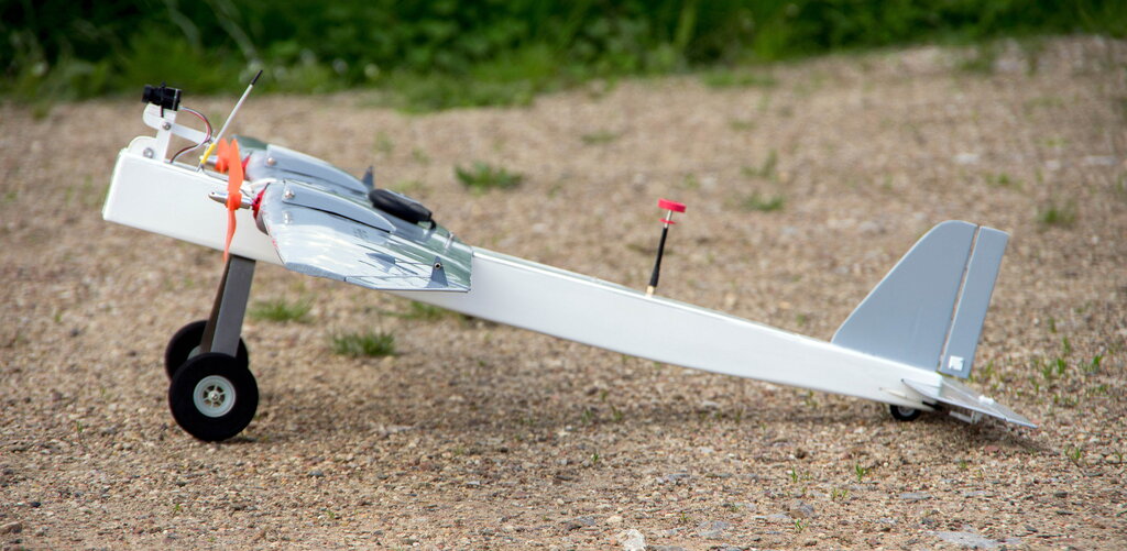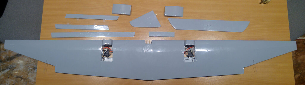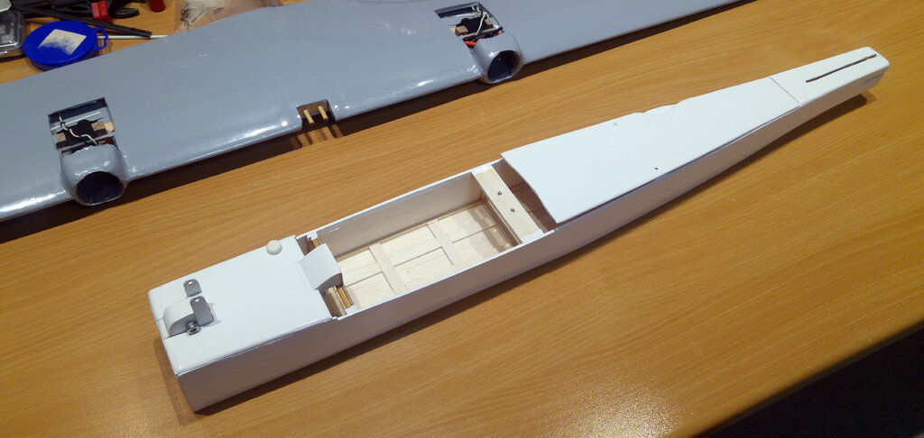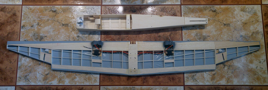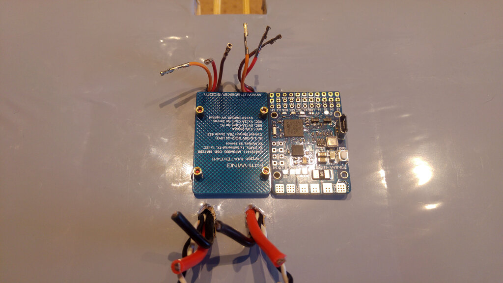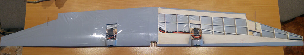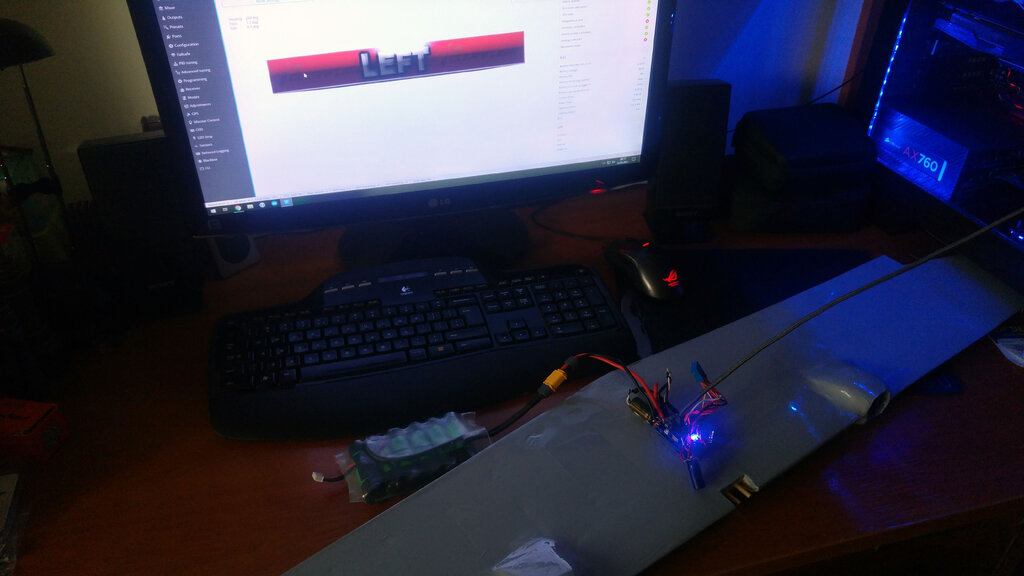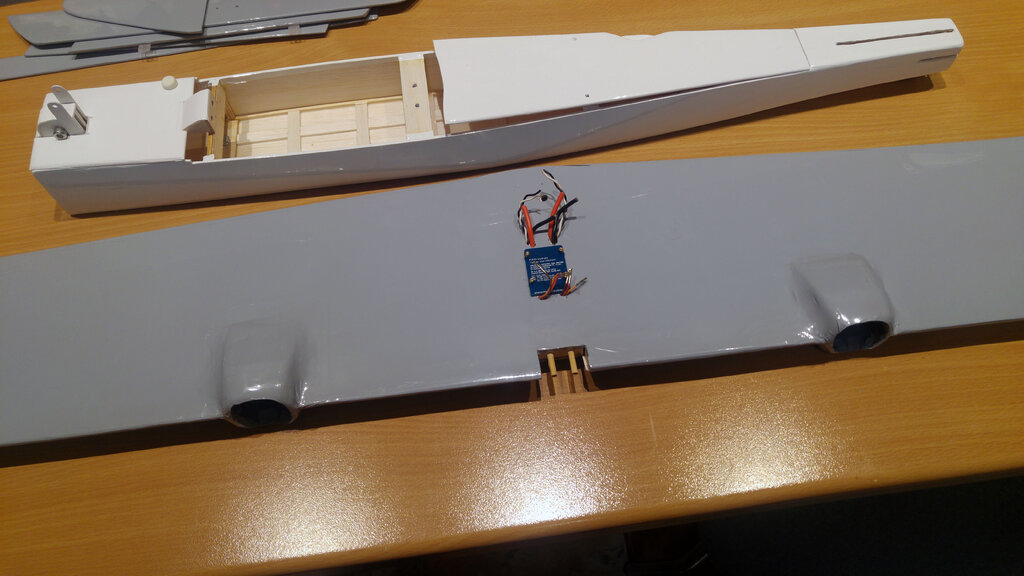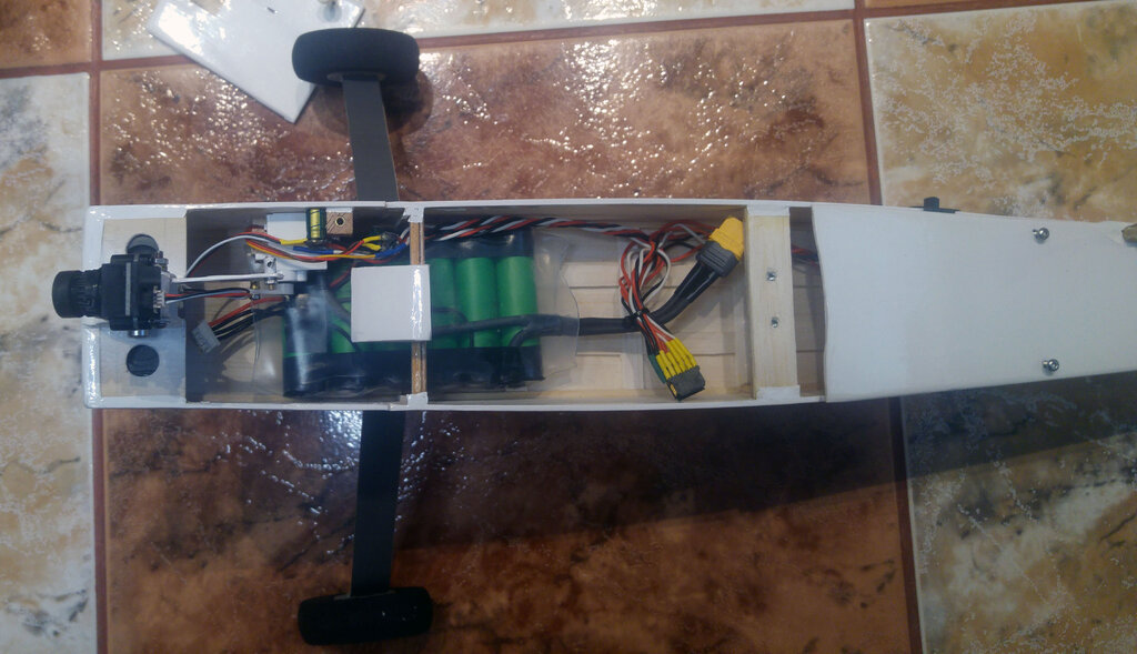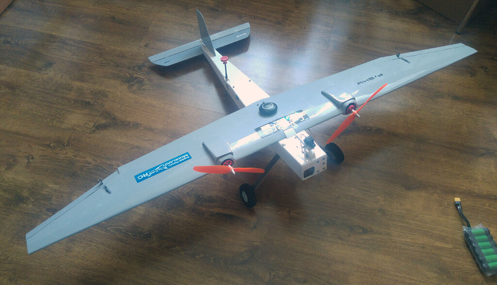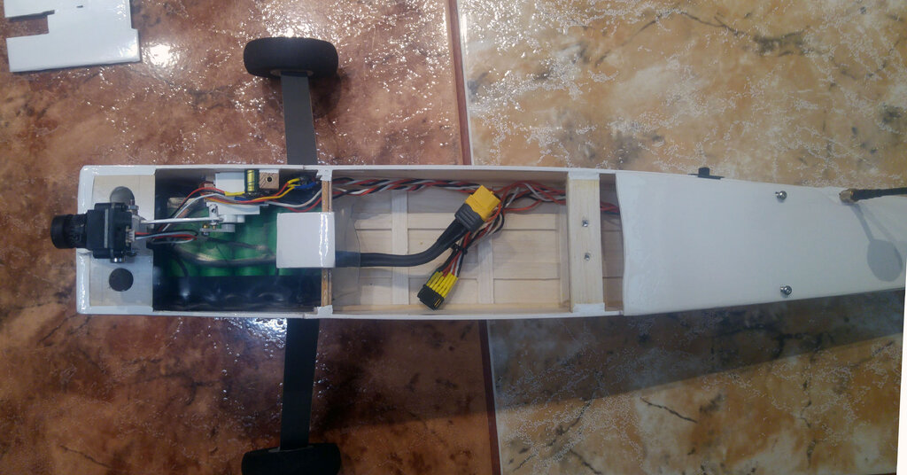 4. Dobra, chyba skończyłem, teraz muszę liczyć na dobrą pogodę w ciągu następnych dni i może coś się uda . Ogólnie zmieniłem troszkę mechanizm ruchu kamerki, bo poprzedni powodował drganie serwa (nieco złe kąty), co prawda obszedłem to programowo funkcjami logicznymi w aparaturze, ale zdecydowanie było to nieeleganckie, stąd zmieniłem to na dłuższą dźwignię, ale nie chodzi tu o siłę, a geometrię popychacza. Teraz chodzi gładko i bez luzów . Wyszedł jednak pewien szczegół, który ukazuje kto ten model projektował ?, bo zrobiłem tyle miejsca z tyłu na wyważanie, a tu było blisko niepowodzenia z wyważeniem bez kamerki . Ale jednak się udało, także jedno z założeń wstępnych spełnione - wyważenie bez jak i z kamerką na froncie. No cóż, uczę się, ale i tak jestem dumny, że powstało coś takiego z mojego pomysłu i konstrukcji - choć tak na 100% okaże się po locie . Na razie poustawiałem co się da w Inav i na balkonie nawet szybko łapie GPS'a i "działają" tryby autonomiczne - tz. włączają silniki itp. Nie wiem jeszcze czy tryb Acro (domyślny) prawidłowo działa i stabilizuje, bo ruszając modelem serwa ruszają się dosłownie minimalnie, ale się zobaczy, bo to moje pierwsze doświadczenie ze stabilizacją, a także kontrolerem . Waga z akumulatorem taka jak w ostatnio oblatanym Wicherku - 1250 gramów, sam akumulator to 340 gramów czyli 27% wagi modelu z kamerką, bez niej będzie około 100 gramów mniej. Daje to obciążenie powierzchni: 58g/dm², sam nie wiem czy to dużo czy mało, to też zobaczymy , choć chyba powinienem usunąć z tego tytułu słowo motoszybowiec . Tak to się wyważa bez kamerki: A tak z kamerką: No i takie jedno zdjęcie złożonego modelu, ale będą lepsze jak wyjadę na lotnisko (niestety telefon robi troszkę kiepsko w takich warunkach): No i nie mogłem się powstrzymać przed sprawdzeniem jednej rzeczy jeśli chodzi o regulatory : Duo.mp4 A i w sumie zastanawia mnie ten kompas, bo niby pokazuje dobrze jak kręcę się w pokoju, ale jak przechylę model w przód lub w tył to trochę to głupieje (nie mówię o dużych kątach, bo to bym rozumiał, ale takim nieznacznym przechyle).