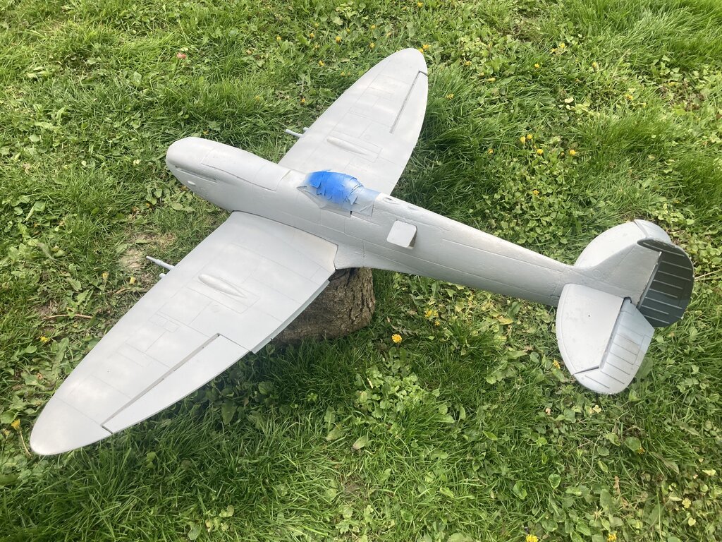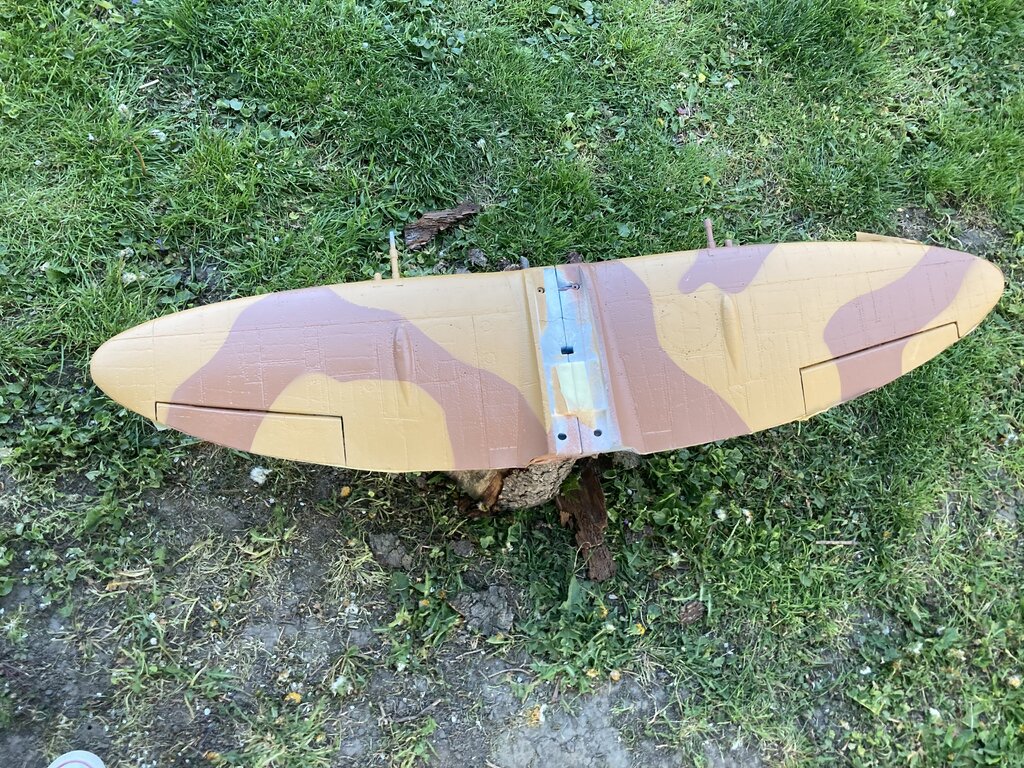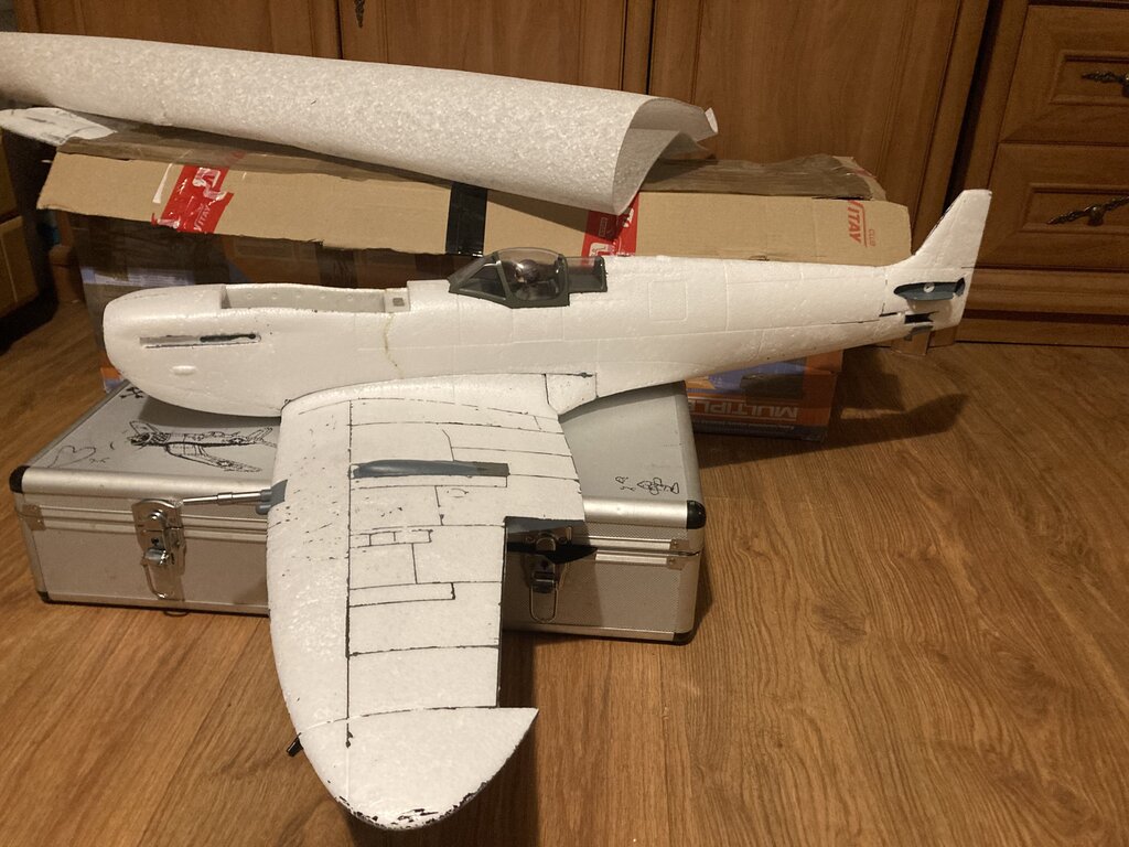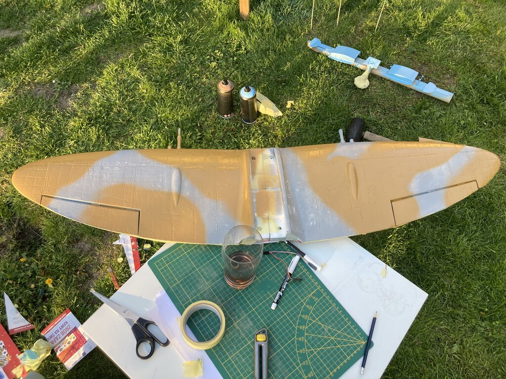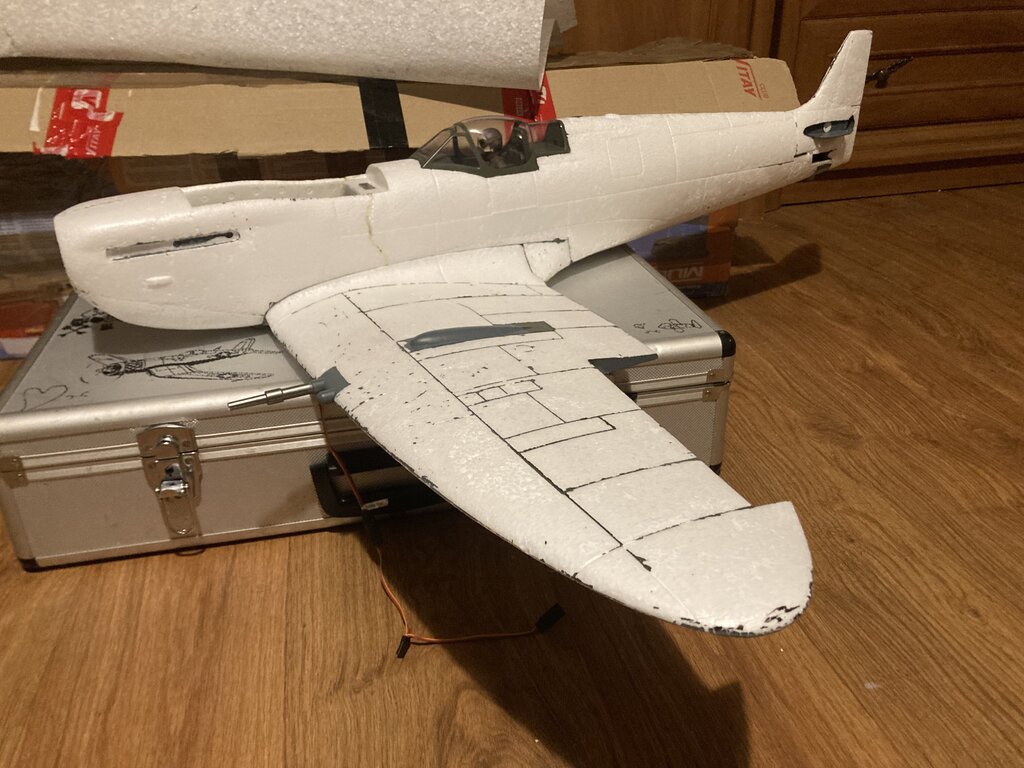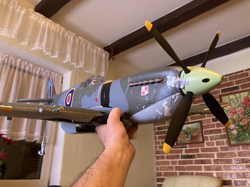 Witam wszystkich, w zeszłym roku kupiłem rozbitego spita, przez inne projekty czekał grzecznie w kolejce, nie chciałem się z nim spieszyć. Dwa miesiące temu zacząłem odbudowę i pomału widać koniec i upragniony oblot. Model miał pęknięty i pokrzywiony kadłub, skrzydło pęknięte i zwichrowane, brak części typu klapy, osłony chłodnic, działa, i kilku drobiazgów. w takim stanie do mnie dotarł Zacząłem od zdjęcia starej farby, co ujawniło wszystkie uszkodzenia. Farbę usuwałem taśma klejąca i to spowodowało ubytki w piance Po naprawieniu wszystkich uszkodzeń i wstawieniu niezbędnych wzmocnień z prętów węglowych zaczęło się wyprowadzanie powierzchni. Poszpachlowalem go całego lekką szpachlówką i wyszlifowalem, pokrylem całego bezbarwnym lakierem do drewna, tą czynność powtarzałem do zadowalającego mnie efektu i poszedł podkład który uwidocznił jeszcze miejsca do szpachlowania, ostatnia warstwa plus lakier bezbarwny do drewna. Po wszystkim czas na linie podziału i nity, do nitów zrobiłem sobie takie urządzenie co bardzo przyspieszyło prace Chciałem tez zrobić też cały kokpit ale po usunięciu „podłogi” okazało się ze idzie tam dość spora wręga po której usunięciu mocno osłabionym konstrukcje kadłuba wiec posklejalem to spowrotem, dorobiłem z balsy brakujące części Wszystko dorobione to czas malować, farby są firmy Montana, polecam, bardzo dobrze kryją, cena dobra i baaaaardzo duży wybór kolorów Na górnej części płatowca naszkicowałem kamuflaż i malowanie Potem oznaczenia, napisy, i watering, farba akwarelowa i kredka akwarelowa i dużo wody. Czekałem do wyschnięcia, i wilgotna szmatka pomału wszystko umyłem efekt świetny ?-jak dla mnie, na żywo wyglada znacznie lepiej niż na zdjęciach. -