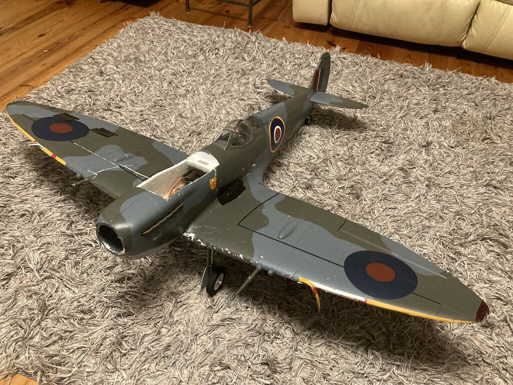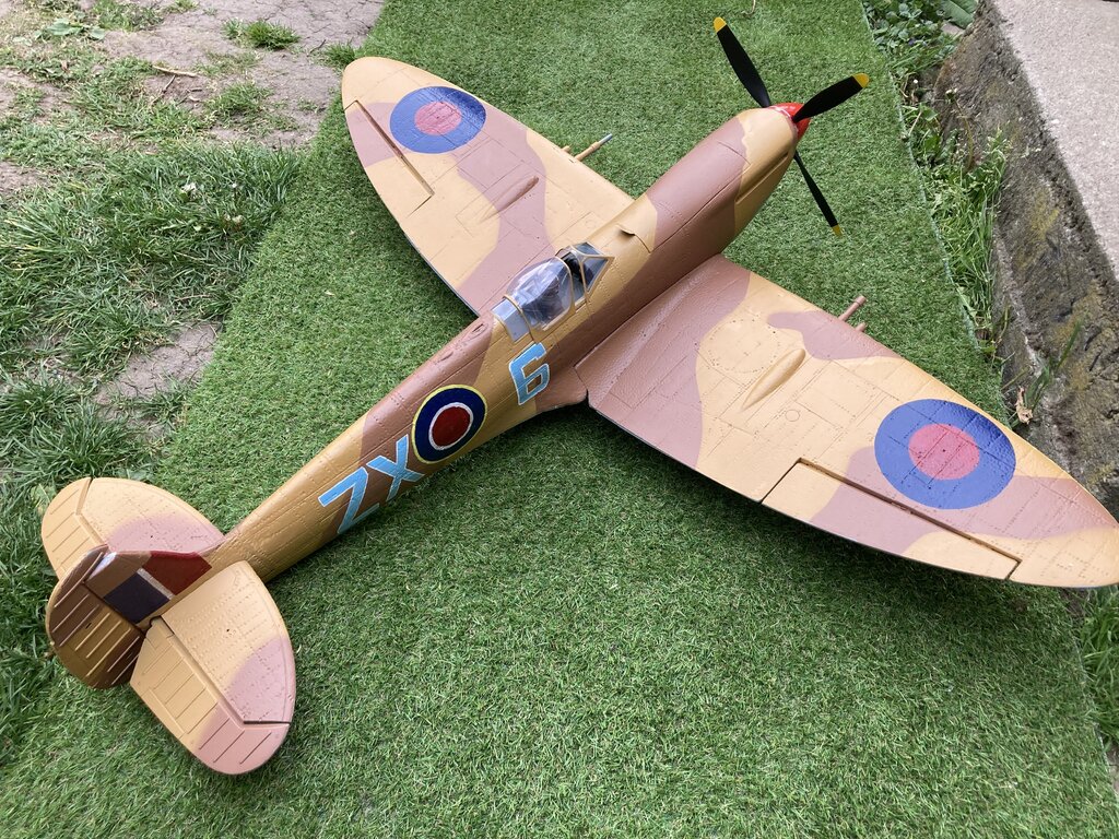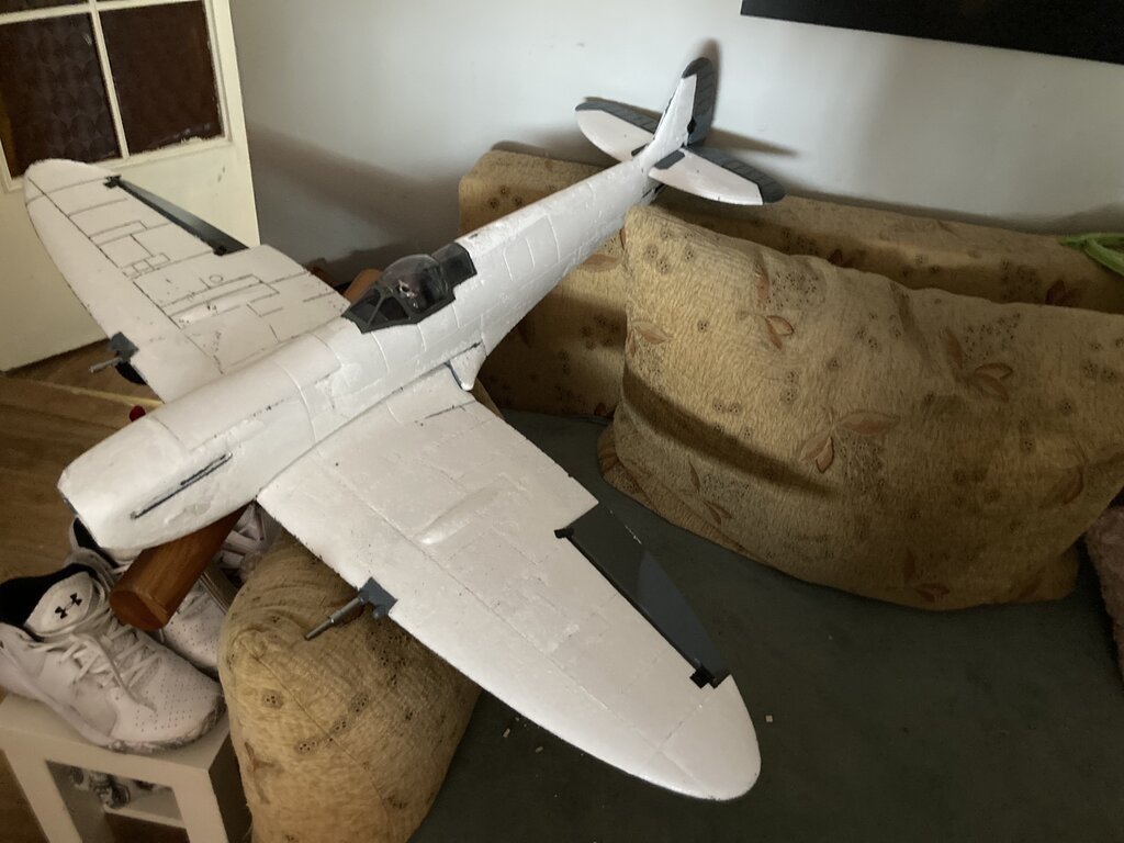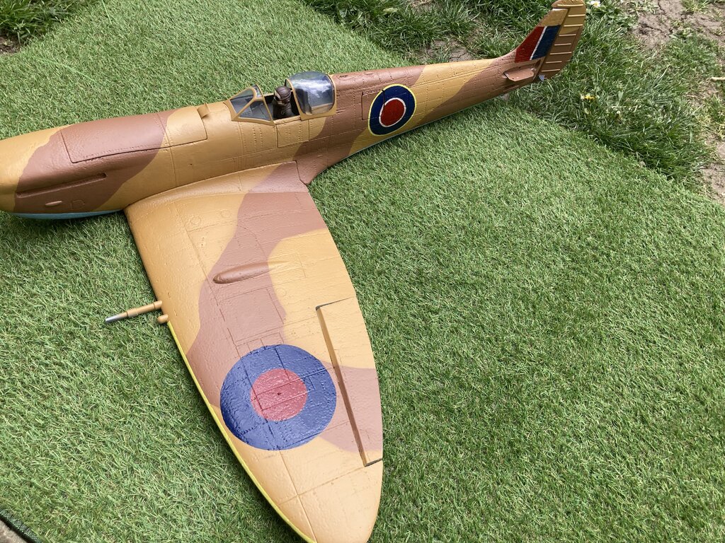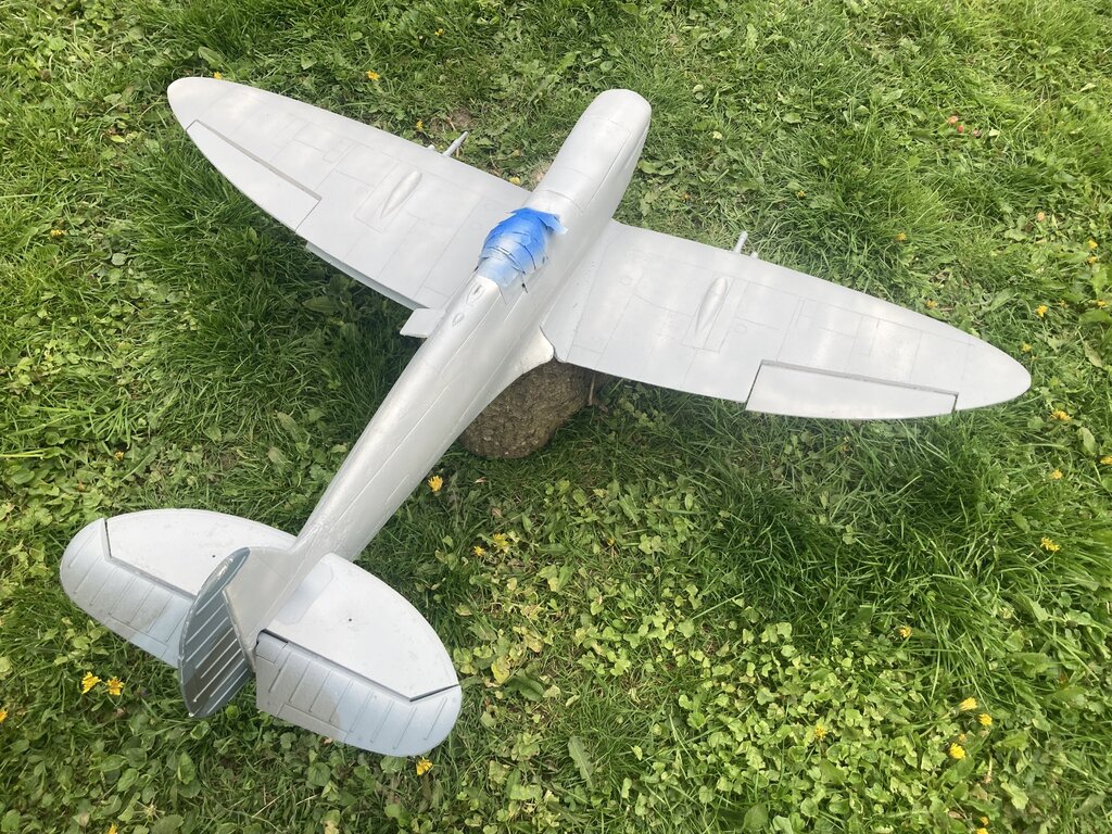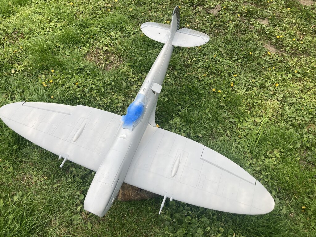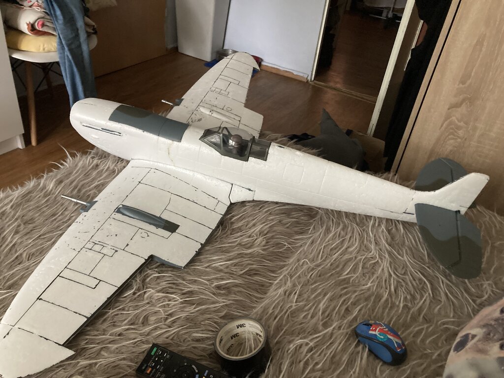 Witam wszystkich, w zeszłym roku kupiłem rozbitego spita, przez inne projekty czekał grzecznie w kolejce, nie chciałem się z nim spieszyć. Dwa miesiące temu zacząłem odbudowę i pomału widać koniec i upragniony oblot. Model miał pęknięty i pokrzywiony kadłub, skrzydło pęknięte i zwichrowane, brak części typu klapy, osłony chłodnic, działa, i kilku drobiazgów. w takim stanie do mnie dotarł Zacząłem od zdjęcia starej farby, co ujawniło wszystkie uszkodzenia. Farbę usuwałem taśma klejąca i to spowodowało ubytki w piance Po naprawieniu wszystkich uszkodzeń i wstawieniu niezbędnych wzmocnień z prętów węglowych zaczęło się wyprowadzanie powierzchni. Poszpachlowalem go całego lekką szpachlówką i wyszlifowalem, pokrylem całego bezbarwnym lakierem do drewna, tą czynność powtarzałem do zadowalającego mnie efektu i poszedł podkład który uwidocznił jeszcze miejsca do szpachlowania, ostatnia warstwa plus lakier bezbarwny do drewna. Po wszystkim czas na linie podziału i nity, do nitów zrobiłem sobie takie urządzenie co bardzo przyspieszyło prace Chciałem tez zrobić też cały kokpit ale po usunięciu „podłogi” okazało się ze idzie tam dość spora wręga po której usunięciu mocno osłabionym konstrukcje kadłuba wiec posklejalem to spowrotem, dorobiłem z balsy brakujące części Wszystko dorobione to czas malować, farby są firmy Montana, polecam, bardzo dobrze kryją, cena dobra i baaaaardzo duży wybór kolorów Na górnej części płatowca naszkicowałem kamuflaż i malowanie Potem oznaczenia, napisy, i watering, farba akwarelowa i kredka akwarelowa i dużo wody. Czekałem do wyschnięcia, i wilgotna szmatka pomału wszystko umyłem efekt świetny ?-jak dla mnie, na żywo wyglada znacznie lepiej niż na zdjęciach. -