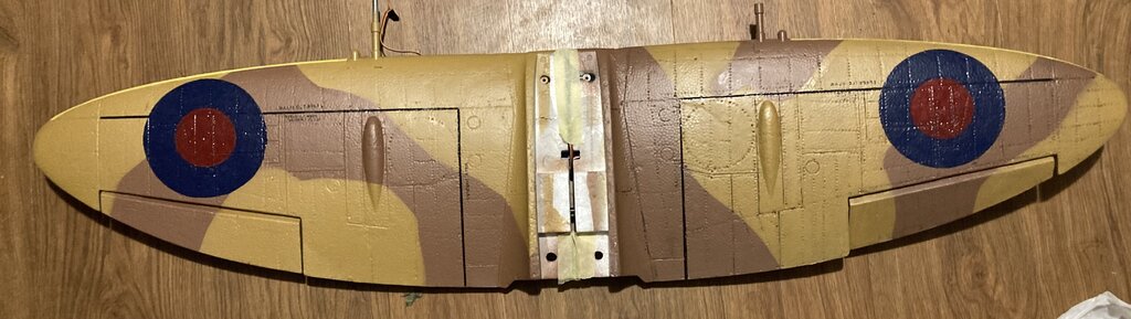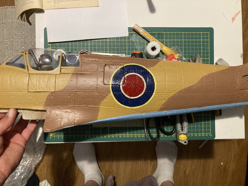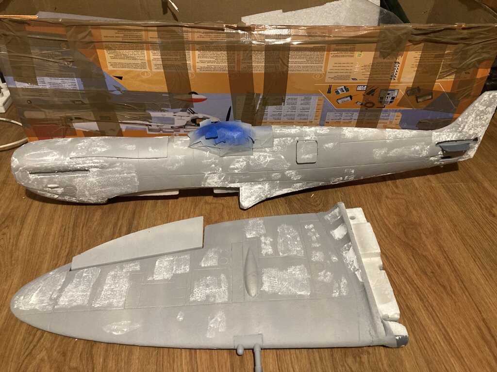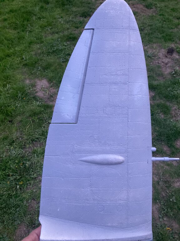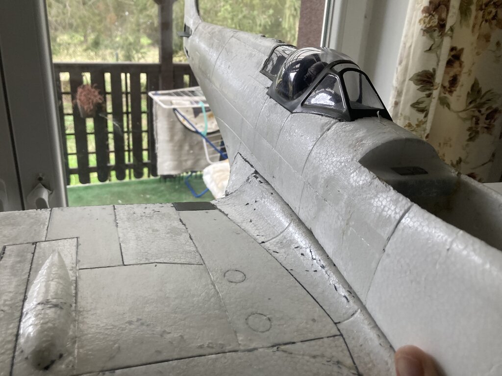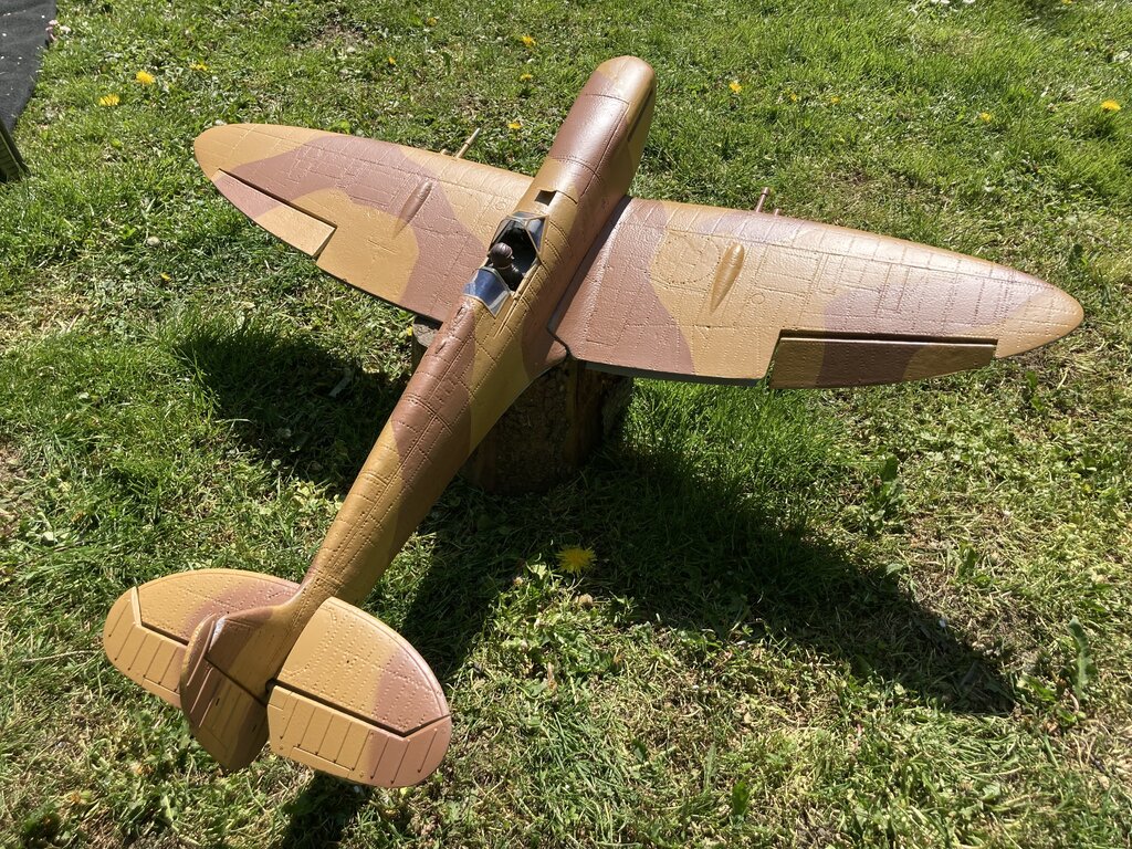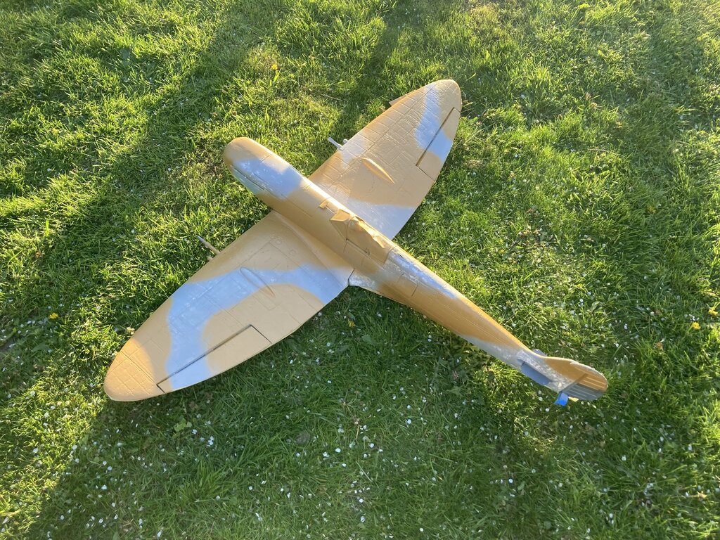 Witam wszystkich, w zeszłym roku kupiłem rozbitego spita, przez inne projekty czekał grzecznie w kolejce, nie chciałem się z nim spieszyć. Dwa miesiące temu zacząłem odbudowę i pomału widać koniec i upragniony oblot. Model miał pęknięty i pokrzywiony kadłub, skrzydło pęknięte i zwichrowane, brak części typu klapy, osłony chłodnic, działa, i kilku drobiazgów. w takim stanie do mnie dotarł Zacząłem od zdjęcia starej farby, co ujawniło wszystkie uszkodzenia. Farbę usuwałem taśma klejąca i to spowodowało ubytki w piance Po naprawieniu wszystkich uszkodzeń i wstawieniu niezbędnych wzmocnień z prętów węglowych zaczęło się wyprowadzanie powierzchni. Poszpachlowalem go całego lekką szpachlówką i wyszlifowalem, pokrylem całego bezbarwnym lakierem do drewna, tą czynność powtarzałem do zadowalającego mnie efektu i poszedł podkład który uwidocznił jeszcze miejsca do szpachlowania, ostatnia warstwa plus lakier bezbarwny do drewna. Po wszystkim czas na linie podziału i nity, do nitów zrobiłem sobie takie urządzenie co bardzo przyspieszyło prace Chciałem tez zrobić też cały kokpit ale po usunięciu „podłogi” okazało się ze idzie tam dość spora wręga po której usunięciu mocno osłabionym konstrukcje kadłuba wiec posklejalem to spowrotem, dorobiłem z balsy brakujące części Wszystko dorobione to czas malować, farby są firmy Montana, polecam, bardzo dobrze kryją, cena dobra i baaaaardzo duży wybór kolorów Na górnej części płatowca naszkicowałem kamuflaż i malowanie Potem oznaczenia, napisy, i watering, farba akwarelowa i kredka akwarelowa i dużo wody. Czekałem do wyschnięcia, i wilgotna szmatka pomału wszystko umyłem efekt świetny ?-jak dla mnie, na żywo wyglada znacznie lepiej niż na zdjęciach. -