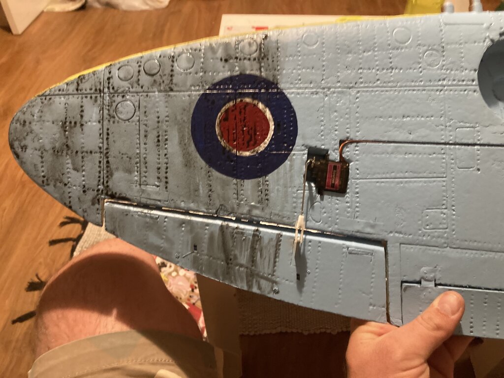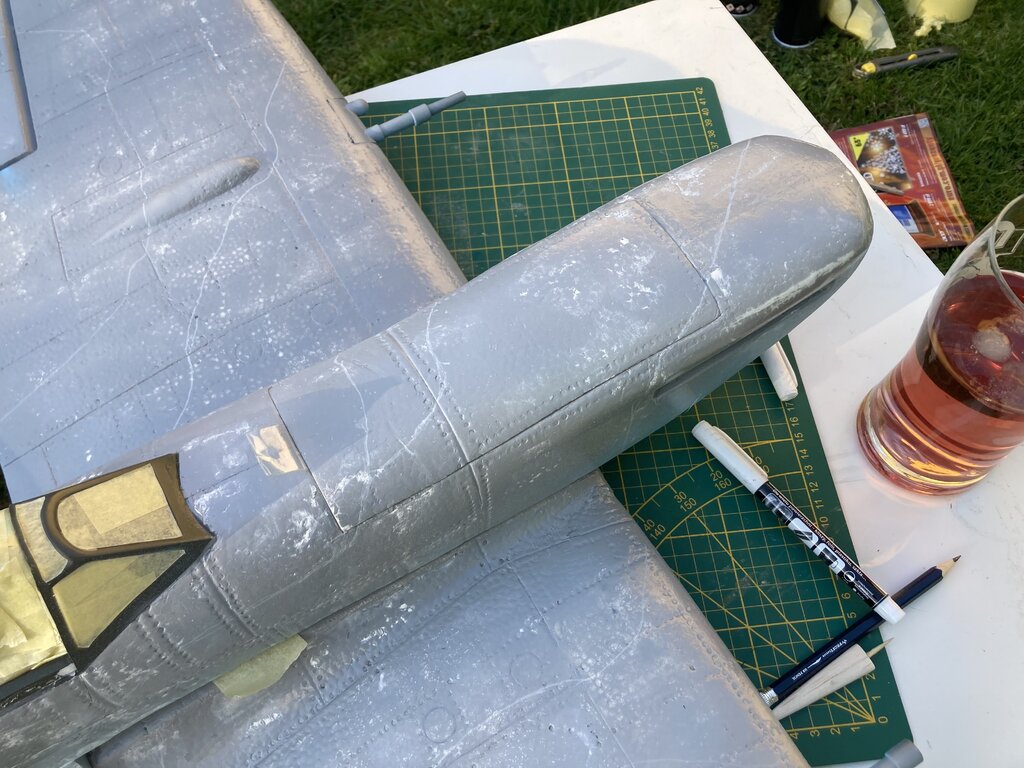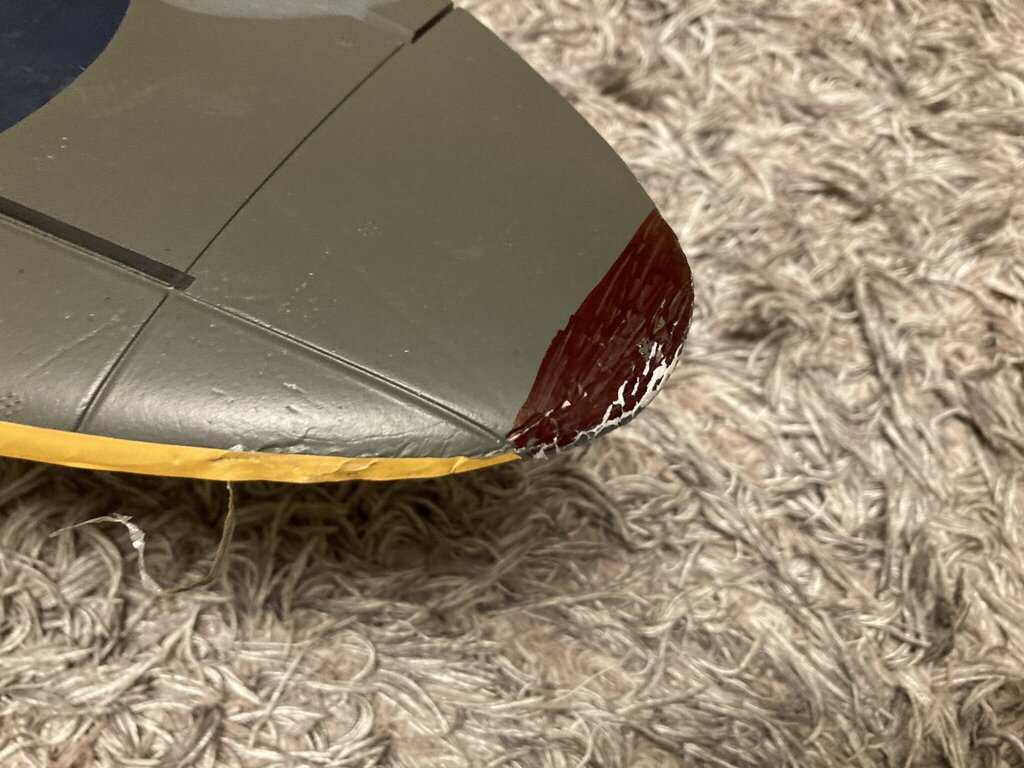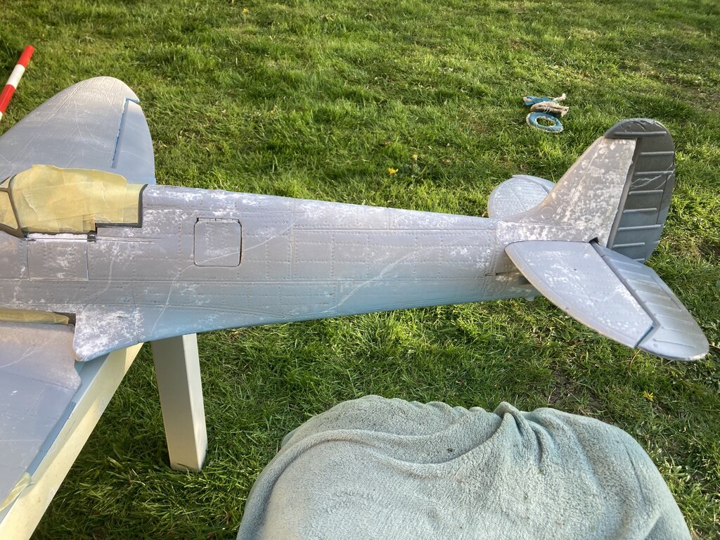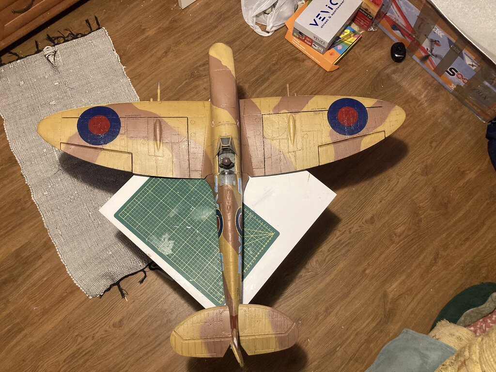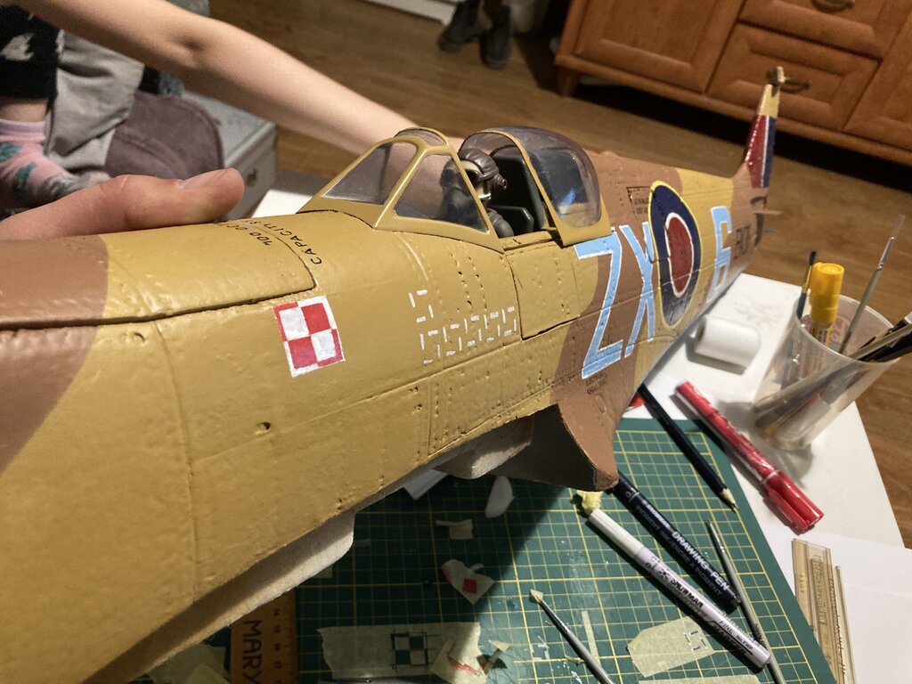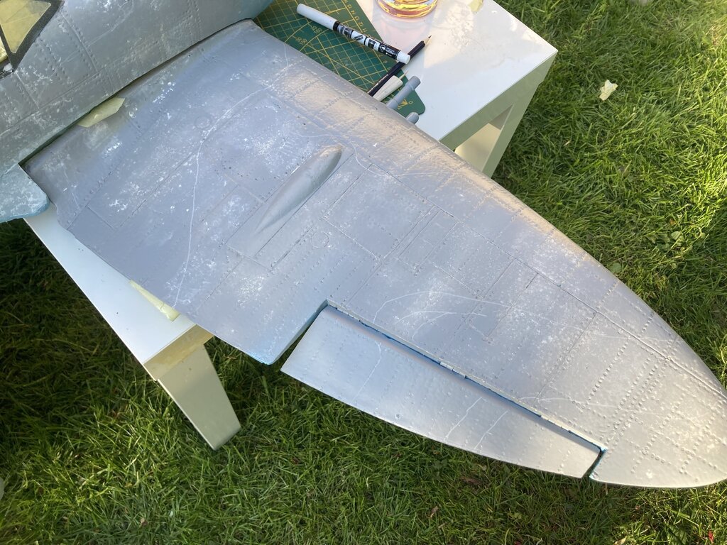 Witam wszystkich, w zeszłym roku kupiłem rozbitego spita, przez inne projekty czekał grzecznie w kolejce, nie chciałem się z nim spieszyć. Dwa miesiące temu zacząłem odbudowę i pomału widać koniec i upragniony oblot. Model miał pęknięty i pokrzywiony kadłub, skrzydło pęknięte i zwichrowane, brak części typu klapy, osłony chłodnic, działa, i kilku drobiazgów. w takim stanie do mnie dotarł Zacząłem od zdjęcia starej farby, co ujawniło wszystkie uszkodzenia. Farbę usuwałem taśma klejąca i to spowodowało ubytki w piance Po naprawieniu wszystkich uszkodzeń i wstawieniu niezbędnych wzmocnień z prętów węglowych zaczęło się wyprowadzanie powierzchni. Poszpachlowalem go całego lekką szpachlówką i wyszlifowalem, pokrylem całego bezbarwnym lakierem do drewna, tą czynność powtarzałem do zadowalającego mnie efektu i poszedł podkład który uwidocznił jeszcze miejsca do szpachlowania, ostatnia warstwa plus lakier bezbarwny do drewna. Po wszystkim czas na linie podziału i nity, do nitów zrobiłem sobie takie urządzenie co bardzo przyspieszyło prace Chciałem tez zrobić też cały kokpit ale po usunięciu „podłogi” okazało się ze idzie tam dość spora wręga po której usunięciu mocno osłabionym konstrukcje kadłuba wiec posklejalem to spowrotem, dorobiłem z balsy brakujące części Wszystko dorobione to czas malować, farby są firmy Montana, polecam, bardzo dobrze kryją, cena dobra i baaaaardzo duży wybór kolorów Na górnej części płatowca naszkicowałem kamuflaż i malowanie Potem oznaczenia, napisy, i watering, farba akwarelowa i kredka akwarelowa i dużo wody. Czekałem do wyschnięcia, i wilgotna szmatka pomału wszystko umyłem efekt świetny ?-jak dla mnie, na żywo wyglada znacznie lepiej niż na zdjęciach. -