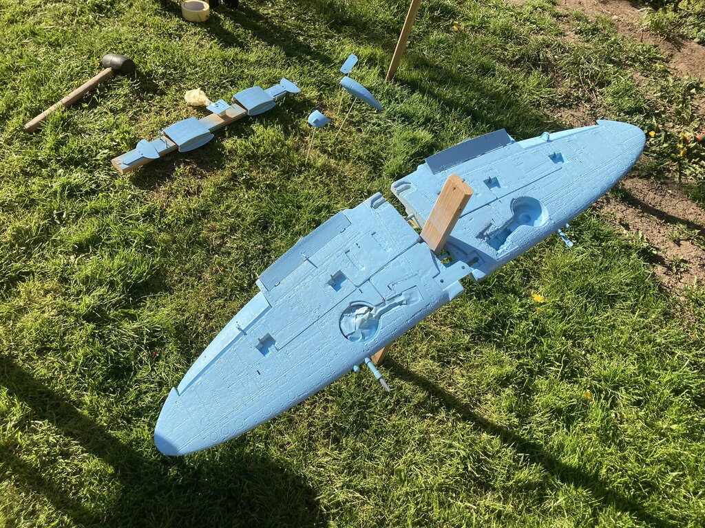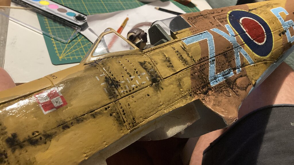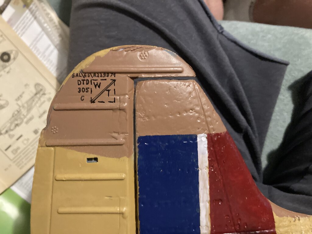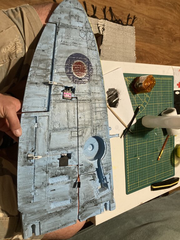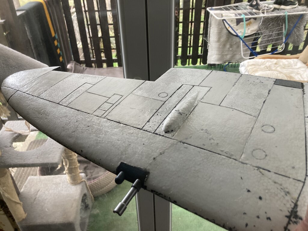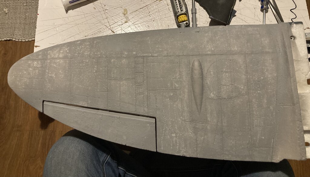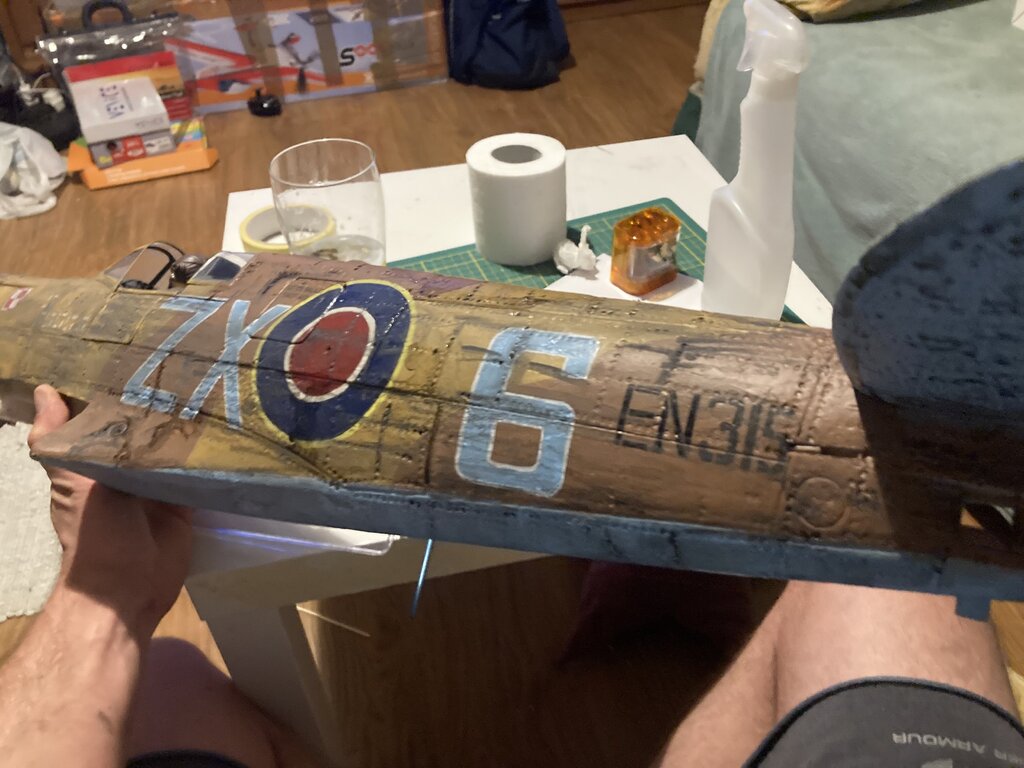 Witam wszystkich, w zeszłym roku kupiłem rozbitego spita, przez inne projekty czekał grzecznie w kolejce, nie chciałem się z nim spieszyć. Dwa miesiące temu zacząłem odbudowę i pomału widać koniec i upragniony oblot. Model miał pęknięty i pokrzywiony kadłub, skrzydło pęknięte i zwichrowane, brak części typu klapy, osłony chłodnic, działa, i kilku drobiazgów. w takim stanie do mnie dotarł Zacząłem od zdjęcia starej farby, co ujawniło wszystkie uszkodzenia. Farbę usuwałem taśma klejąca i to spowodowało ubytki w piance Po naprawieniu wszystkich uszkodzeń i wstawieniu niezbędnych wzmocnień z prętów węglowych zaczęło się wyprowadzanie powierzchni. Poszpachlowalem go całego lekką szpachlówką i wyszlifowalem, pokrylem całego bezbarwnym lakierem do drewna, tą czynność powtarzałem do zadowalającego mnie efektu i poszedł podkład który uwidocznił jeszcze miejsca do szpachlowania, ostatnia warstwa plus lakier bezbarwny do drewna. Po wszystkim czas na linie podziału i nity, do nitów zrobiłem sobie takie urządzenie co bardzo przyspieszyło prace Chciałem tez zrobić też cały kokpit ale po usunięciu „podłogi” okazało się ze idzie tam dość spora wręga po której usunięciu mocno osłabionym konstrukcje kadłuba wiec posklejalem to spowrotem, dorobiłem z balsy brakujące części Wszystko dorobione to czas malować, farby są firmy Montana, polecam, bardzo dobrze kryją, cena dobra i baaaaardzo duży wybór kolorów Na górnej części płatowca naszkicowałem kamuflaż i malowanie Potem oznaczenia, napisy, i watering, farba akwarelowa i kredka akwarelowa i dużo wody. Czekałem do wyschnięcia, i wilgotna szmatka pomału wszystko umyłem efekt świetny ?-jak dla mnie, na żywo wyglada znacznie lepiej niż na zdjęciach. -
