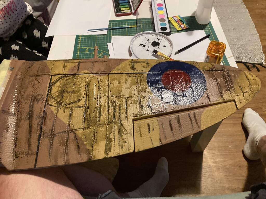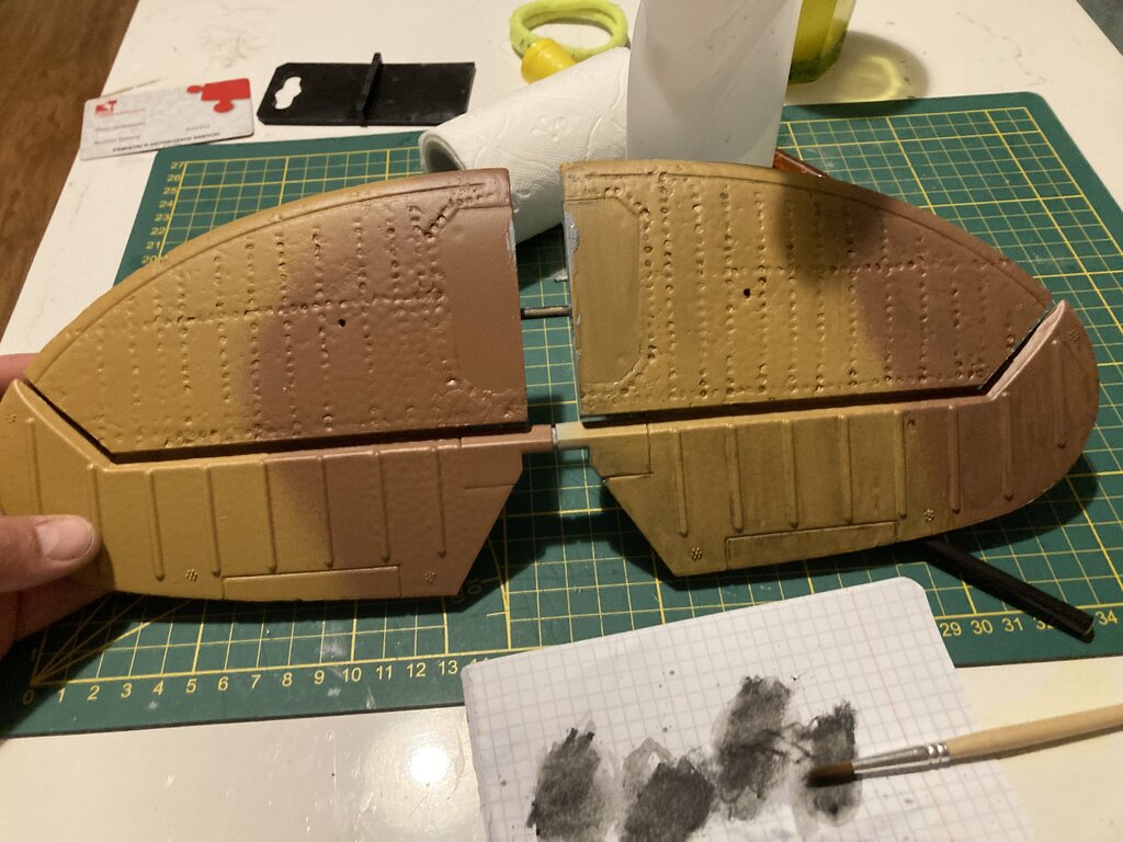 Pewnie, pierwszy etap to było rozcieńczoną akwarelką tak dość mocno, nałożenie na całe skrzydło pędzlem, to jeszcze nie wyschło i zacząłem nakładać mniej rozcienczoną prawie czarną po liniach podziału i po nitach, jak było jeszcze mokre to wziołem kredką akwarelową i poprawiłem jeszcze raz. Jak wyschło to wilgotna szmatka zmyłem wszystko -