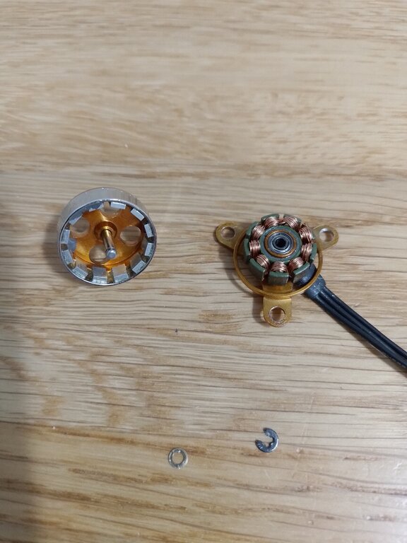Silnik 1504 w serwisie ! Na pewno wał do wymiany ! Wał 2mm blokowany na e-clip. Próbowałem rotor kombinerkami wyrównać ale nie da się. Ogólnie chyba nie jest aż taki krzywy. Pewnie nigdzie nie dostanę takiej ośki. Można uciąć pręt 2mm i blokować śrubą dociskową na imbus o ile się tak da 🤔 Nowy motorek a ma takie bicie, że ciężko go utrzymać z samą piastą bez śmigła na większych obrotach.