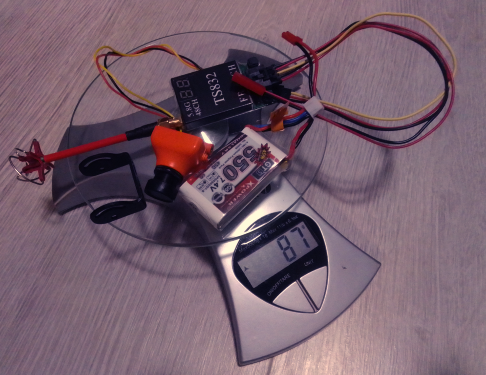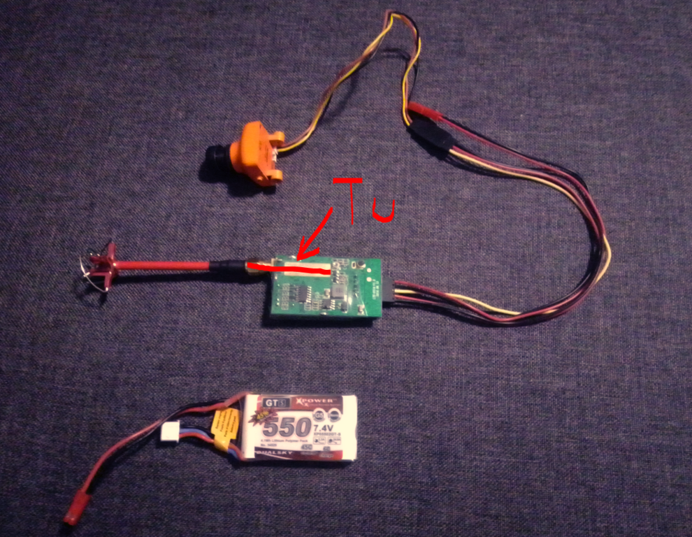 Centrum dowodzenia już prawie gotowe, muszę jeszcze zrobić jakąś półkę na baterie i kable... Trochę mały ten monitorek, wolałbym większy. Zestaw do modelu wazy 87g, na baterii 550mAh długo nie podziała, może 5-10 min. ? To akurat się sprawdzi. Wszędzie piszą że "Nadajnik w trakcie pracy się nagrzewa - należy zapewnić mu właściwą temperaturę pracy. (właściwe chłodzenie)" No rzeczywiście grzeje się już od 1 sekundy działania najbardziej w tym miejscu: Według mnie to powinien tam być naklejony jakiś radiator a nie koszulka termokurczliwa. Zmieniłem antenki na koniczynki, zobaczymy jak to będzie działać w akcji, ale najpierw muszę zamontować to gdzieś w modelu? Wstępnie już rozplanowałem miejsce na baterię, kamerkę i nadajnik.