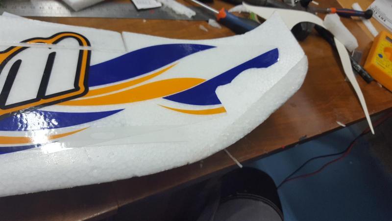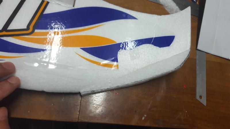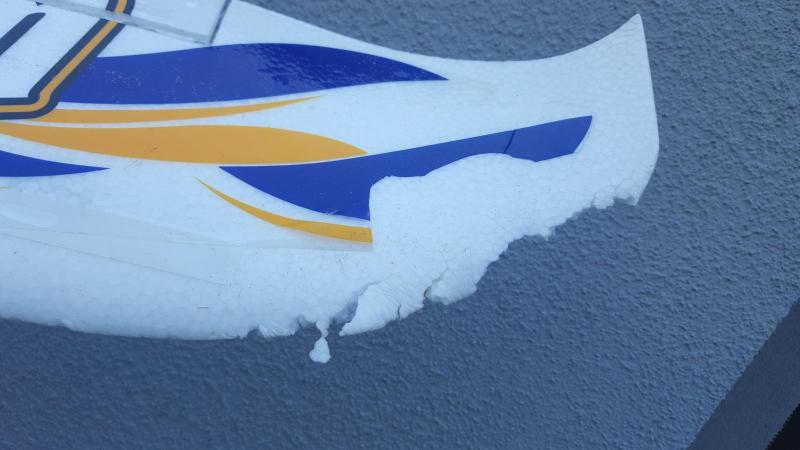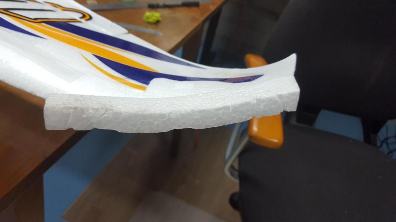 Koledzy potrzebuję rady jak uzupełnić ubytek pianki w skrzydle. Lądując wyhaczyłem jakiś drucior na ziemi. W efekcie krawędź natarcia końcówki skrzydła Walrusa postrzępiła się. Czy ktoś z Was ma pomysł jak takie nierówne uszkodzenie naprawić?