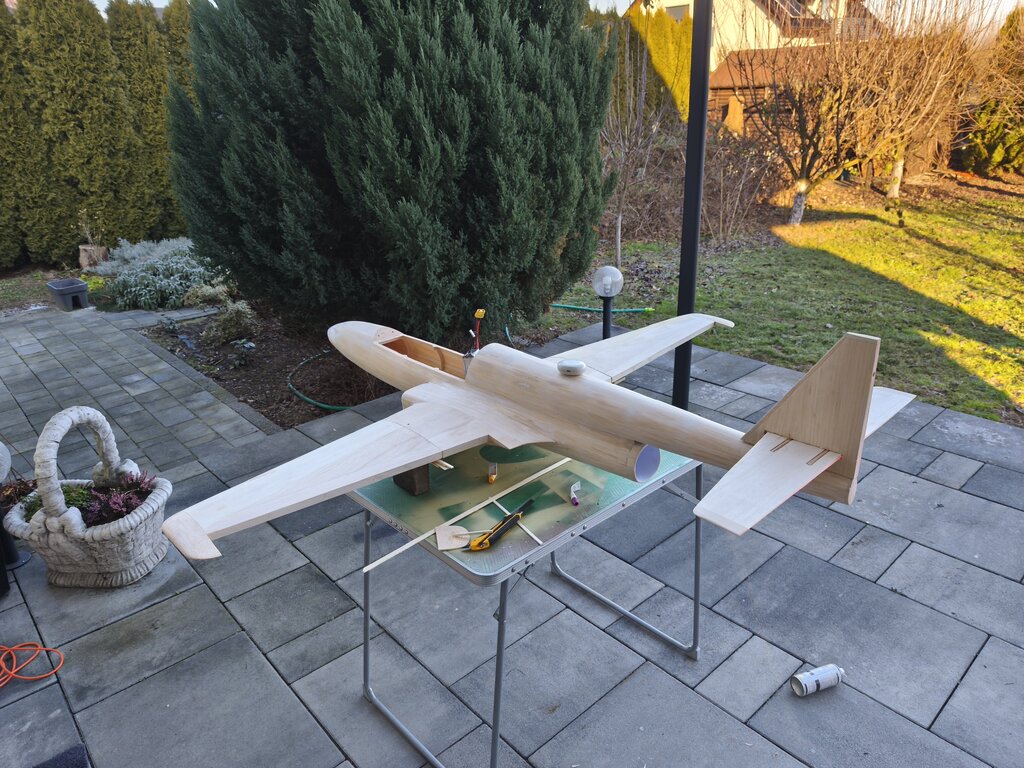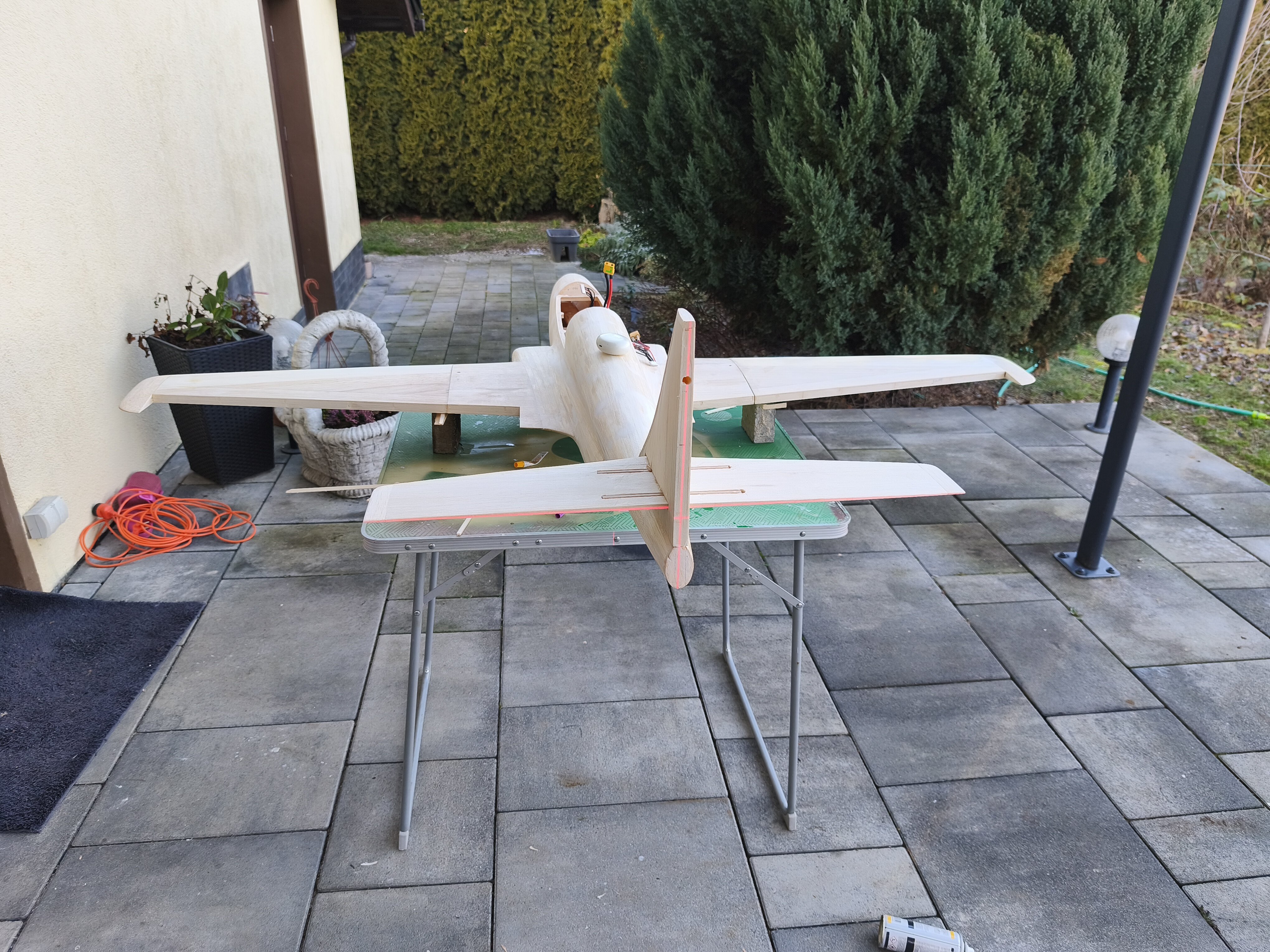 W końcu doszlifowałem statecznik poziomy do kształtu (super sprawa - połowa masy statecznika w pył). Z tej okazji skleiłem ogon z resztą modelu:: I mimo walki z krzywą sklejką, to udało mi się zrobić prosty model: Zostało mi doszliwać natarcia lotek i klap, dorobić grzebień na przejściu statecznika pionowego i kadłuba i całe drewno będzie gotowe Jak dobrze pójdzie to dziś to będę wykańczał. Po tym - pójdzie w końcu szkło na model. Też super przyjemny etap pracy W sumie to chyba ogólnie przyjemna robota się skończyła, czas się poczuć jak lakiernik samochodowy I korzystająć z okazji, to mam pytanko. Producent zaleca robienie klapek podwoza z blachy aluminiowej 0,5mm. MIejsca gdzie będą klapki są obłe, na zdjęciach u producenta ta blacha mu wyszła pofalowana, jak blacharka w Seicento jeżdzącym w KJSie. Nie mam ochoty się więc szarpać z aluminium, zrobię to z kompozytu. Tu pojawia się pytanie - ile warstw i jak grubej tkaniny mi trzeba na te klapki? -