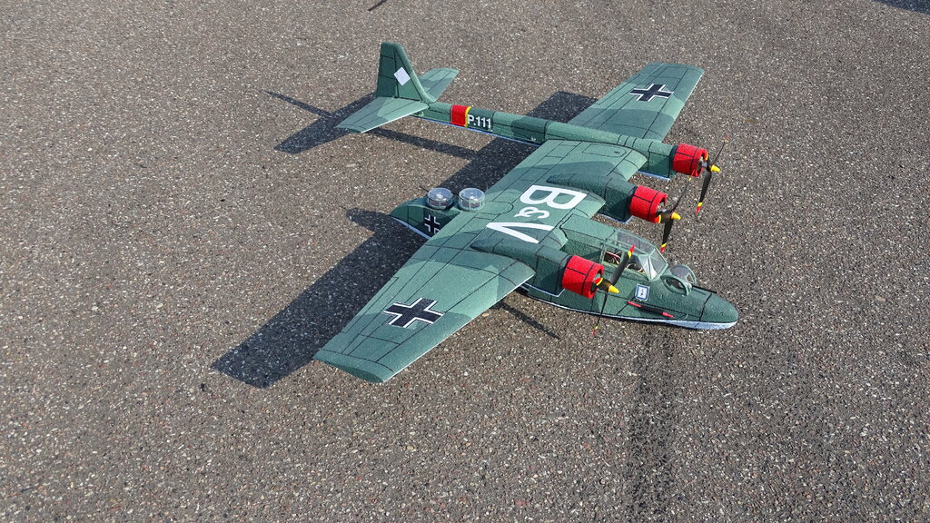 Powiem szczerze ,że każdy kto widzi ten model nie wierzy że to może latać . Szukając w internecie B&V P 111 natrafiałem na modele statyczne , nigdzie nie znalazłem latającego P-111 . Czy to rzeczywiście pierwsze na świecie ulotnienie tego projektu ? Jeżeli tak to niesamowita frajda. Model ciągle jest zajmujący , wiele poświęca mu się uwagi aby choć zrobił poprawną "beczkę " . Ciągle nas zaskakuje , ostatnio podczas lotu odkręciło się jedno ze śmigieł, które zgubił /zakreślone na zdjęciu / i wyobraźcie sobie samolot nie reagował na stery lotkami , nie skręcał !!! /odczuwalny jest brak steru kierunku/ .Oddalał się i to bardzo szybko ,jedynie działający ster wysokości spowodował upadek samoloty w zborze . To ono już wiele razy uratowało mu życie . Wiele pracy przed nami, ciągle są nowe pomysły z miksowaniem sterów , zaklinowaniem silników , czy wyważenie w osi podłużnej. Jest nad czym myśleć , ale przecież to frajda aby takie coś mogłoby zrobić poprawnie akrobacje . Mankamentem jedynie jest lądowanie modelem na trawie , prawie zawsze uszkodzony jest pływak pod skrzydłem. Zawsze zawadzi o trawę , a lądować na wodzie ...... no może kiedyś. Przezabawny model polecam wszystkim którzy mają chęć do eksperymentu. Pozdrawiam Ciąg dalszy nastąpi ....... m -