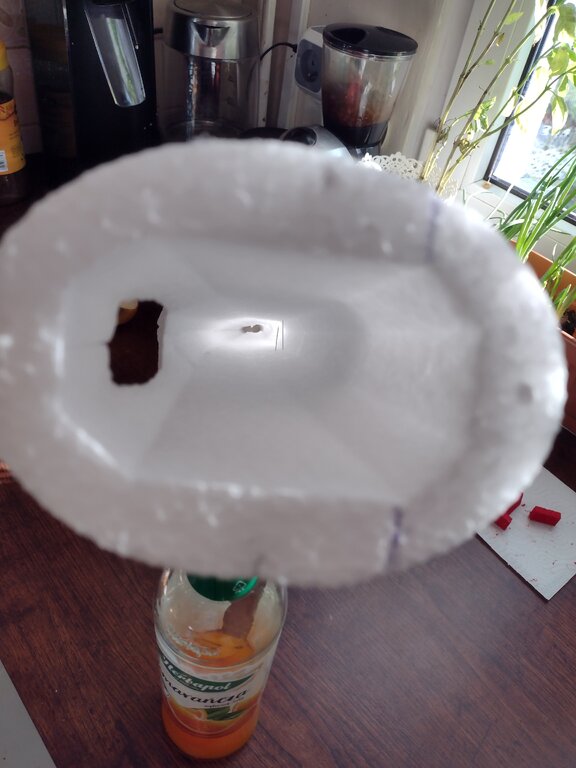 Trudno znaleźć butelkę która by pomieściła taki gipsowy monolit / kopyto pod kabinę pilotów mojej "stonogi"/. Niemniej jest takowa butelka 2,5 l znanego napoju. Obkurczona / staje się bardzo twarda/z otworem na karabin maszynowy , przyklejona do kadłuba dała sztywność i wydawała się pancerna . Całość była sztywna i naprawdę można spokojnie powiedzieć ,że przy kolizji z kretem da radę , ale przypominam że muszę ją zdjąć, aby umieścić wewnątrz baterię . Trzeba było to odciąć i...... tu okazało się ,że po odcięciu całość była mało stabilna . Podobnie było przy Żubrze i tam przyklejenie na cyjanoakryl sklejki jako podłogi załatwiło sztywność co uratowało model podczas kraksy. Tutaj przykleiłem dwa patyki od lodów znacznie zmniejszając ruchomość podłogi na zginanie. Dodatkowo zabezpieczeniem przed "kretem " będzie doklejenie przedniego koła podwozia i jego urządzenia hydraulicznego , które będzie stanowiło jakby "taran" podczas przygód przy lądowaniu. Jest jeszcze jeden element usztywniający całość samolotu, dwadzieścia niskociśnieniowych kół wklejonych w kadłub. Niestety ze względów estetycznych / w moim samolocie jest ich tylko 18 / musiałem ująć dwa bo zbyt daleko sięgały, prawie że do rampy rozładunkowej / jakoś to źle wyglądało , a że to nie makieta...../. Nie bardzo wiem jak to cudeńko pomalować , bo model jest niesamowity jeżeli go się przyszpilkuje . Zobaczymy. m -