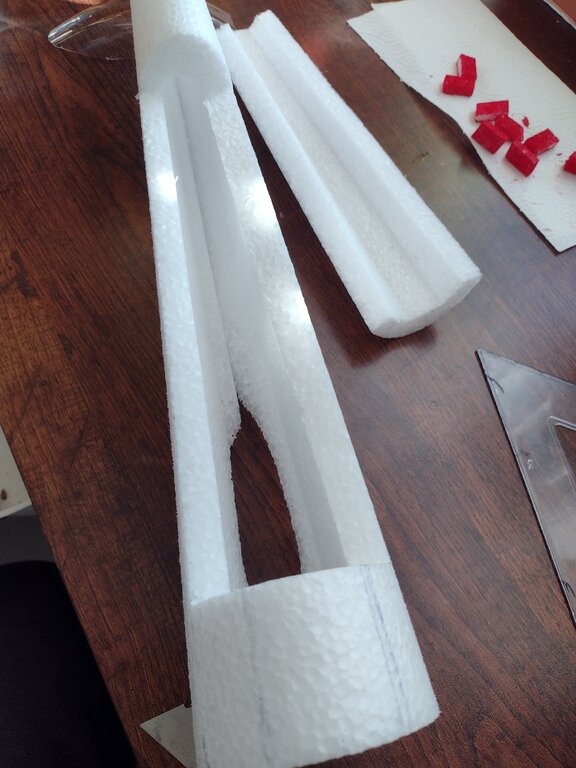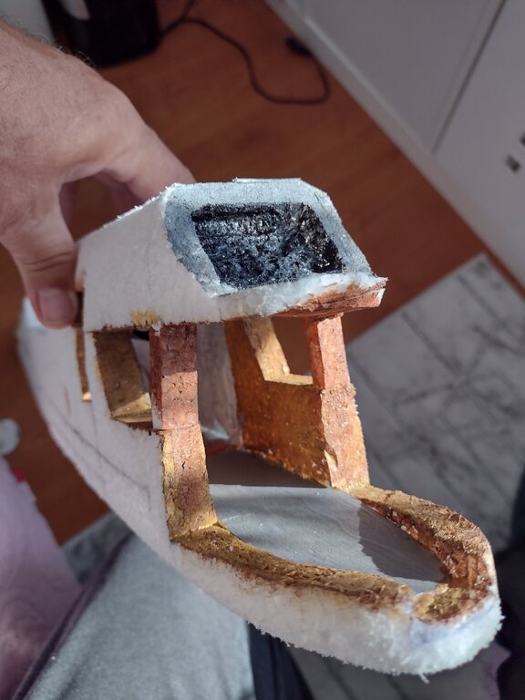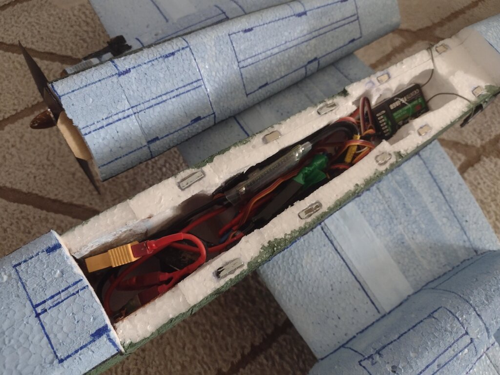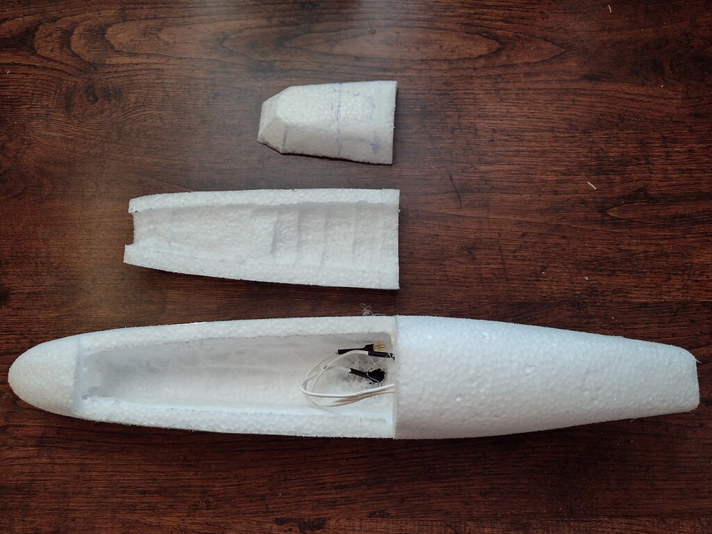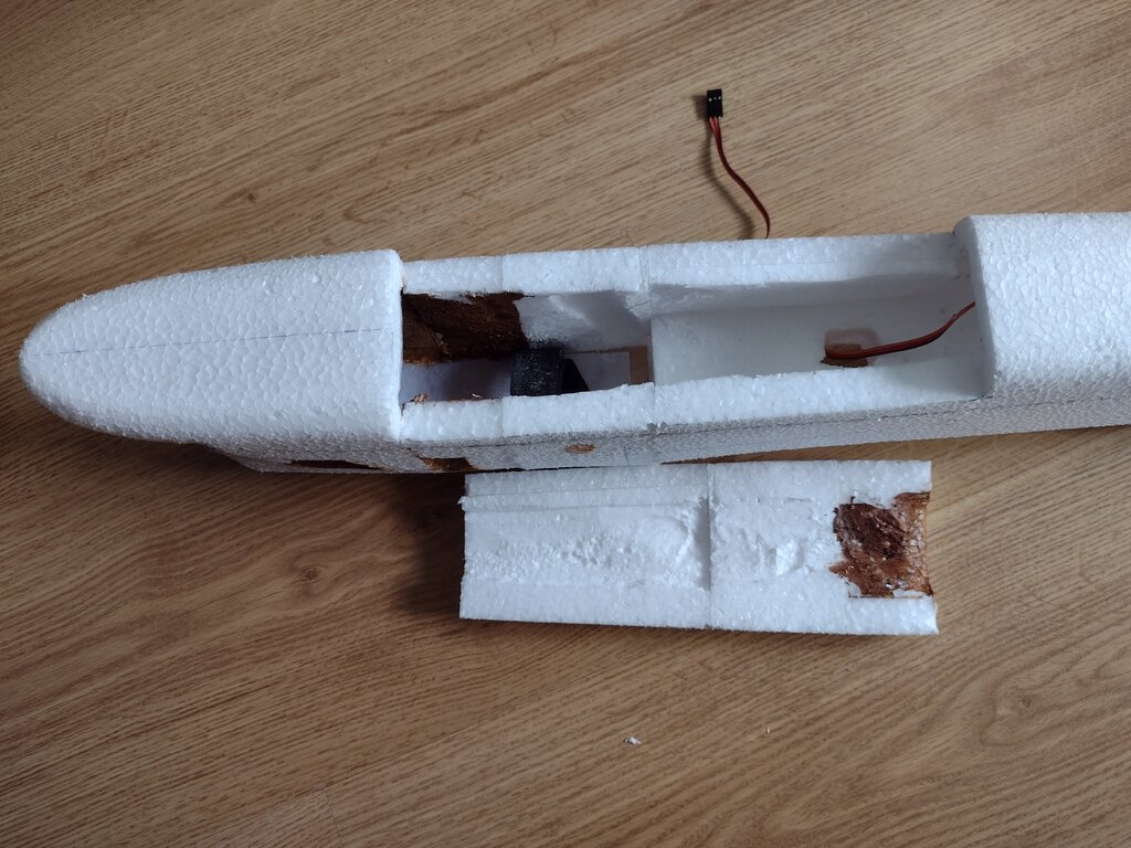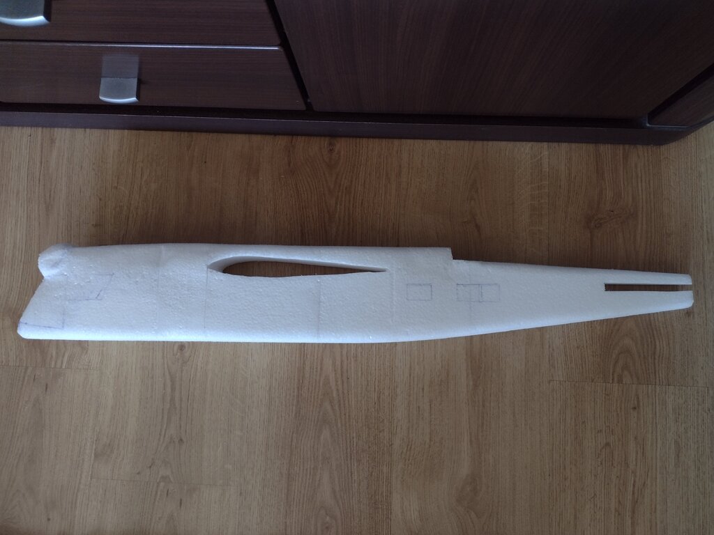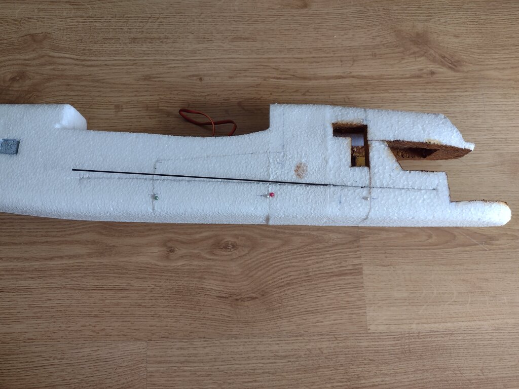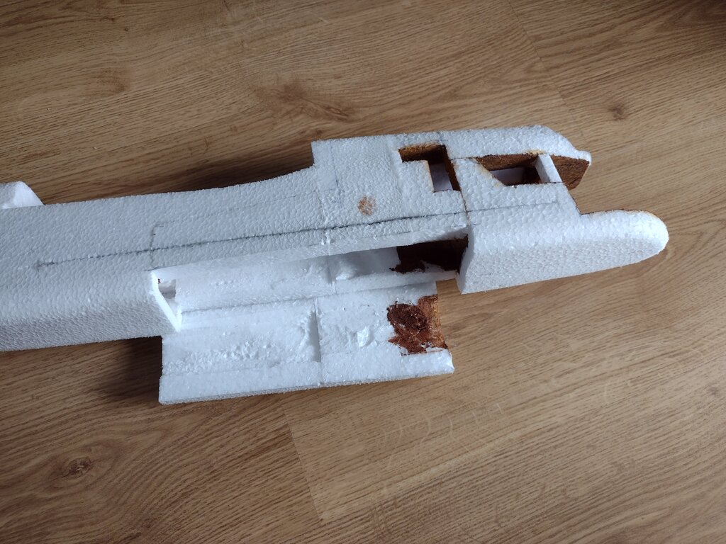 Niby to duży samolot , a jak trzeba umieścić elektronikę wewnątrz to miejsca tam nie za dużo . Serwo steru wysokości musiałem umieścić w suficie kabiny pilotów . Trudno do niego będzie dojść bo na nim będzie zamocowana wieżyczka karabinu maszynowego. Jedyny mankament takiego rozwiązania to przeprowadzenie bowdena przez całą długość modelu do steru wysokości. Myślałem ,ze robiąc rampę załadunkową rozwiąże dostęp do rozmieszczenia elektroniki wewnątrz kadłuba i umocowania wszystkiego chociaż na rzepy . Niestety nie da się i musiałem wyciąć " kanał rewizyjny" od spodu aby chociaż poukładać wiązkę kabli. Szkoda że nie można zostawić tego na stałe , bo w tym miejscu jest dwadzieścia niskociśnieniowych kół . Powoli zbliżam się do końca , ale duży problem stanowi znalezienie odpowiednio dużej butelki i wypalenie z niej kabiny pilotów z otworem na karabin maszynowy. Samolot zapowiada się bardzo efektownie i jest duża szansa na zmieszczenie się w limicie wagowym mimo ciężaru węglowej rury spinającej całość. Bardzo zdziwiłbym się jak byłby z niego rzeczywiście super kombat , ale wszystko przed nami. Pozdrawiam m -