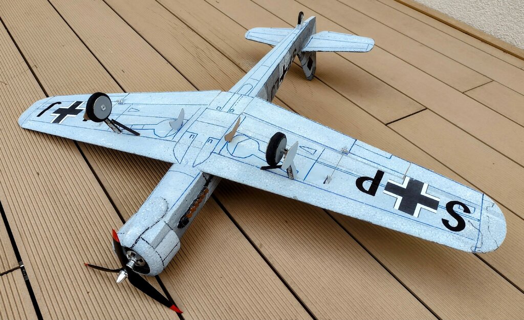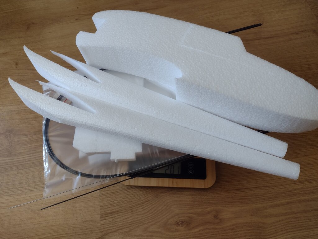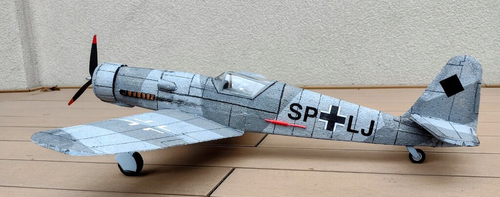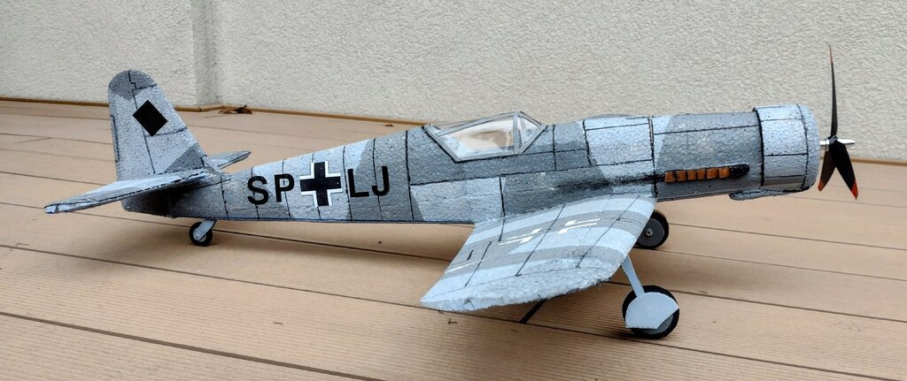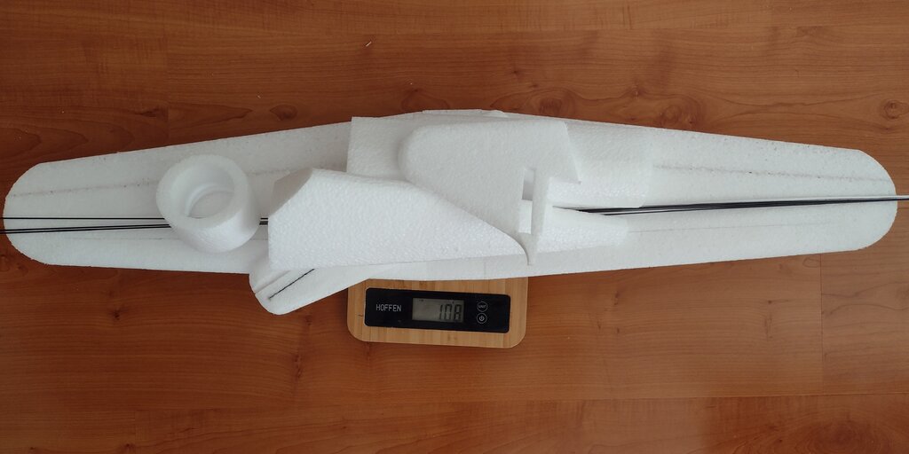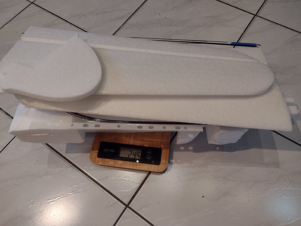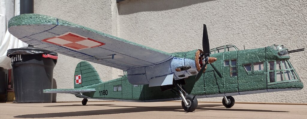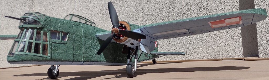 Dalej poszło normalnie jak w każdym kombacie . No może troche nie normalnie, bo z mojego skąpstwa model nie trzyma wagi. Ponieważ robiłem to z tego co miałem w szufladach . Użyłem takich silników oraz regulatorów 40 A zamieniając je na mniejsze silniczki od drona np. Eco 2207 Emax-a i regulatory 20 A zyskałbym 100 gram i zmieścił się w limicie wagowym. No cóż jeżeli ktoś by robił Żubra jako kombata powinien mieć to na uwadze. Jeszcze jedno . Mój kolega który zbiera modele parowozów widząc Żubra powiedział ,że przód kadłuba przypomina mu szybkie parowozy lat 30-tych i ma racje. Ciekawe kto z kogo ściągnął takie rozwiązanie kształtów aerodynamicznych. Niemniej Żubr to piękny samolot i warto go przypominać. Mój Żubr ma następujące wymiary: długość kadłuba 88 cm!!! wysokość 12 cm , a razem z kabiną pilota 14,5 cm szerokość 7 cm / bardzo duży kadłub/ , rozpiętość 102 cm i waży do lotu 712gram. Ciężki , ale jak pisałem można to uszczuplić i zmieścić się w regulaminowej wadze a wygląda tak: To na tyle moich posiedzeń przy ŻUBRZE . Piękny samolot wbrew tym wszystkim którzy mówią o nim "brzydal" . zobaczymy jak będzie latał. Pozdrawiam wszystkich. Marek
