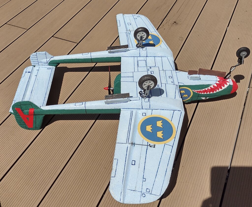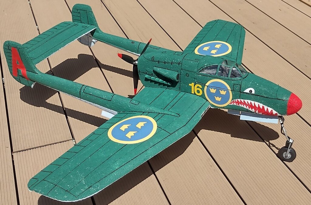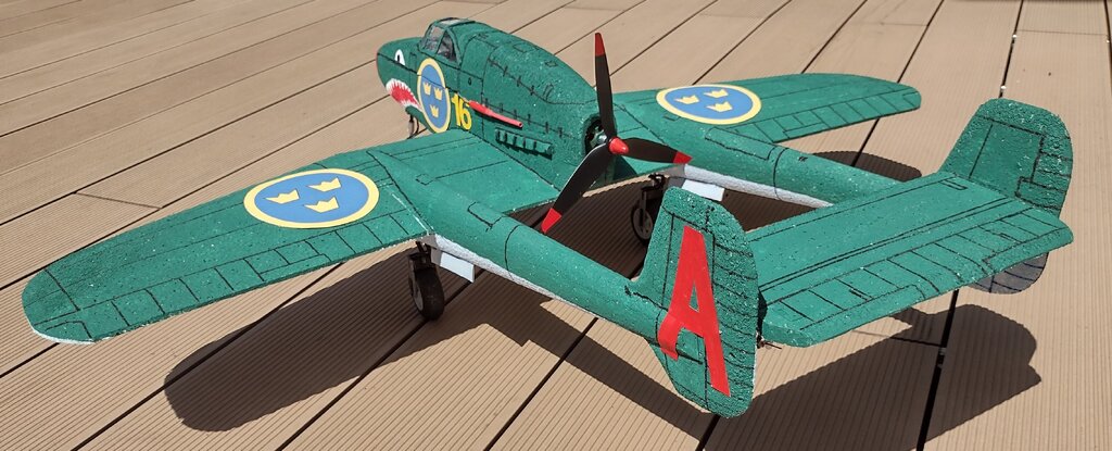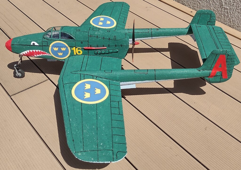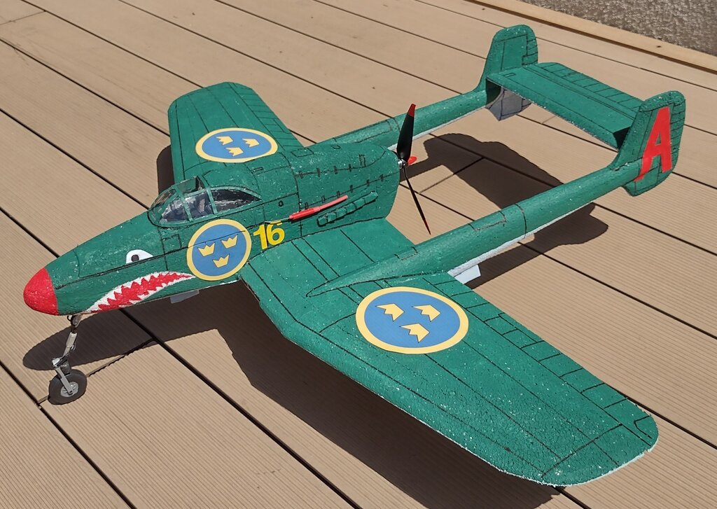 Szwecja przed drugą wojną światową dysponowała przestarzałymi samolotami Gloster Gladiator Dlatego postanowiono zamówić w Stanach Zjednoczonych kilkadziesiąt samolotów P-35 Seversky oraz kilkadziesiąt P-66 Varguard Niestety nie doszło do tego z powodu wprowadzonego przez USA embarga. Postanowiono więc zbudować swój własny samolot który dorównywał by najlepszym konstrukcją . Końcówka lat trzydziestych obfitowała w wyścigi kto szybciej, dalej , wyżej , celniej......każda ze stron szukała rozwiązań które by temu sprostały, szukano złotego środka na poprawę parametrów lotu. Wiele państw poszło w kierunku dwukadłubowych konstrukcji szukając w nich rozwiązania poprawy lotu swoich samolotów. Niemcy- FW 189. Holandia Fokker Ga, USA - XP54, Włochy Caproni Ca4. Również Szwecja zbudowała ciekawy myśliwiec Saab J21. Myśliwiec ze śmigłem pchającym rzadko stosowany w konstrukcjach samolotów lat czterdziestych. Jako zabezpieczenie pilota , zastosowano w nim z powodu tylnego napędu wystrzeliwany fotel. Trudno jest powiedzieć o jego zdolnościach bojowych , bo nigdy nie walczył , niemniej z armii szwedzkiej wycofano go dopiero w 1949 r. Pianki wypalone przez Marka leżały u mnie od jakiegoś czasu , a czekając na część zza Wielkiego Muru pozwoliłem sobie na sklejenie tego kombata. Waga wymaga dużo wycięcia materiału i ostrożnego klejenia , aby zmieścić się w regulaminie ESA. Wycinam co się da , zostawiając skorupę kadłyba. Ponieważ silnik jest z tyłu zmuszony byłem do umieszczenia serwa pod skrzydłem aby nie obciążać i tak dostatecznie ciężkiego tyłu. To właściwie wszystko , reszta tak jak przy budowie De Havilland DH-100 "Vampire". Mój model ma wymiary : rozpiętość 86 cm, długość 790 , waga do lotu 440-455 gram zależnie od baterii, a wygląda tak. Czy będzie z niego super kombat ? nie wiem . " Vampir" jest szybki , zwrotny , ale z cięciem tasiemki nie szczególnie sobie radzi. Pewnie to wina pilota , ale podobno w Eskadrze Kraków kiedyś latał taki samolot . Mirek czy to prawda? Trochę dziwny samolocik , ale szybko się go buduje i może będzie lepiej niż z Vampirem . Pozdrawiam Marek