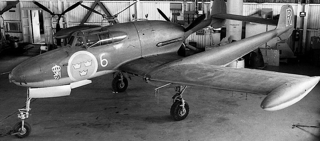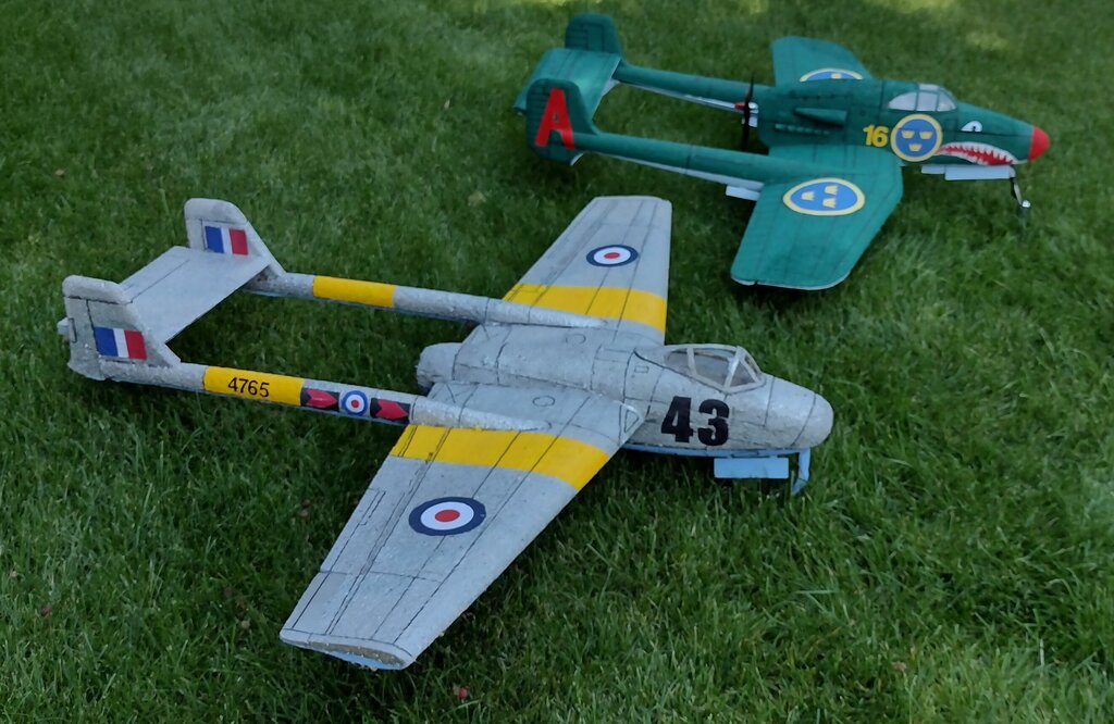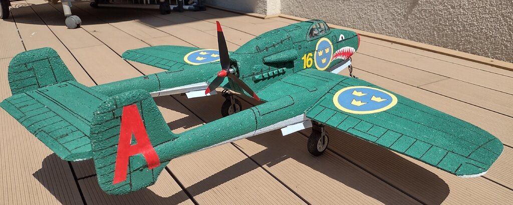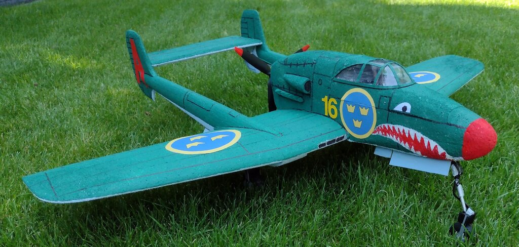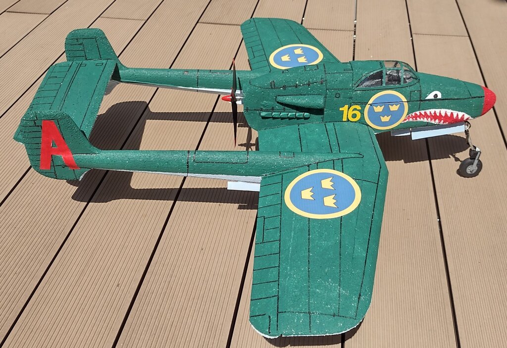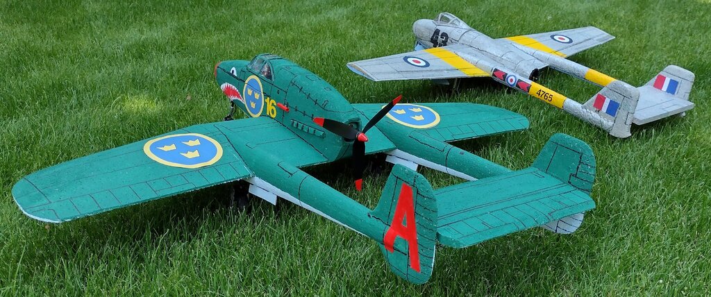 Szwecja przed drugą wojną światową dysponowała przestarzałymi samolotami Gloster Gladiator Dlatego postanowiono zamówić w Stanach Zjednoczonych kilkadziesiąt samolotów P-35 Seversky oraz kilkadziesiąt P-66 Varguard Niestety nie doszło do tego z powodu wprowadzonego przez USA embarga. Postanowiono więc zbudować swój własny samolot który dorównywał by najlepszym konstrukcją . Końcówka lat trzydziestych obfitowała w wyścigi kto szybciej, dalej , wyżej , celniej......każda ze stron szukała rozwiązań które by temu sprostały, szukano złotego środka na poprawę parametrów lotu. Wiele państw poszło w kierunku dwukadłubowych konstrukcji szukając w nich rozwiązania poprawy lotu swoich samolotów. Niemcy- FW 189. Holandia Fokker Ga, USA - XP54, Włochy Caproni Ca4. Również Szwecja zbudowała ciekawy myśliwiec Saab J21. Myśliwiec ze śmigłem pchającym rzadko stosowany w konstrukcjach samolotów lat czterdziestych. Jako zabezpieczenie pilota , zastosowano w nim z powodu tylnego napędu wystrzeliwany fotel. Trudno jest powiedzieć o jego zdolnościach bojowych , bo nigdy nie walczył , niemniej z armii szwedzkiej wycofano go dopiero w 1949 r. Pianki wypalone przez Marka leżały u mnie od jakiegoś czasu , a czekając na część zza Wielkiego Muru pozwoliłem sobie na sklejenie tego kombata. Waga wymaga dużo wycięcia materiału i ostrożnego klejenia , aby zmieścić się w regulaminie ESA. Wycinam co się da , zostawiając skorupę kadłyba. Ponieważ silnik jest z tyłu zmuszony byłem do umieszczenia serwa pod skrzydłem aby nie obciążać i tak dostatecznie ciężkiego tyłu. To właściwie wszystko , reszta tak jak przy budowie De Havilland DH-100 "Vampire". Mój model ma wymiary : rozpiętość 86 cm, długość 790 , waga do lotu 440-455 gram zależnie od baterii, a wygląda tak. Czy będzie z niego super kombat ? nie wiem . " Vampir" jest szybki , zwrotny , ale z cięciem tasiemki nie szczególnie sobie radzi. Pewnie to wina pilota , ale podobno w Eskadrze Kraków kiedyś latał taki samolot . Mirek czy to prawda? Trochę dziwny samolocik , ale szybko się go buduje i może będzie lepiej niż z Vampirem . Pozdrawiam Marek