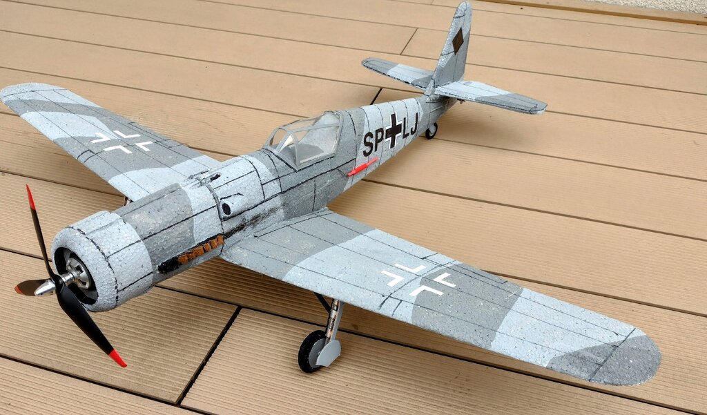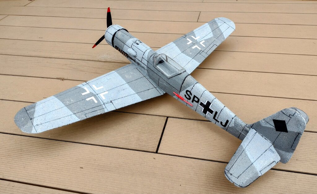 W roku 1943 podstawowy samolot Luftwaffe Me 109 starzał się i mimo że był dobrą maszyną , to zaczął ustępować chociażby Fw 190 D9 czy Fw Ta 152. Wówczas Willy Messerschmitt wpadł na pomysł skonstruowania lepszej wersji Me 109 , wykorzystując do tego specjalnie skonstruowany do bicia rekordów prędkości, samolot o nazwie Me 209 . Sami widzicie że nie miał ten samolocik nic wspólnego z samolotem seryjnym Me 109 używanym podczas działań wojennych. Wykorzystując wyśrubowany rekord prędkości wynoszący 755km/h propaganda nazistowska okłamywała wszystkich ,że Me 209 to kontynuacja starzejącego się Me 109. Ciekawostką jest to że rekord prędkości z 26.04.1939 r udało się pobić dopiero 16 sierpnia 1969 r przez Grummana F8F2 " Bearcat" oczywiście chodzi o samolot z silnikiem tłokowym. W wyniku podjętych starań w listopadzie 1943 roku odbył swój pierwszy lot Me 209 V5 . Myśliwiec ten faktycznie był przygotowany do działań wojennych , posiadał wiele nowinek technicznych , był zwrotny , łatwy w prowadzeniu doskonale uzbrojony , ale miał zasadniczą wadę która jednoznacznie dyskwalifikowała go jako wiodącego myśliwca , mianowicie był o 50 km/h wolniejszy od Fw 190D . Dlatego wyprodukowano go w kilkunastu egzemplarzach . Nigdzie nie mogłem znaleźć czy brał udział w walkach i z jakim skutkiem , ale przecież nie można marnować gotowego do walki samolotu. Byla tez wersja wysokogórska Me 209 5H, ale nie znalazłem właściwego zdjęcia. Później była wersja Me 309 z której wyrósł Me 409 dość oryginalny dwukadłubowy ciężki myśliwiec , ale to juz przy okazji omawiania różnych planów Messerschmitta. Tak więc postanowiłem zbudować niesławną podróbkę Me 209 , bo wydaje mi się że będzie to niezły wojownik ESA. Pianki które przysłał Marek wyszły bardzo obiecująco więc nie było kłopotów z utrzymaniem wagi. Budowa przebiegała normalnie jak każdego kombata szybko, bo pianek nie musiałem poprawiać . Jedyna uwaga, jeżeli będziecie składali kombata z kadłubem rurowym , przyklejcie najpierw skrzydło do kadłuba , a dopiero potem odetnijcie górę w celu dostępu do baterii i całej elektroniki. Jeżeli uczynicie to wcześniej na skutek naprężeń jakie występują przy tej czynności spowodują nieznaczne acz widoczne odstępy i magnesy neodymowe tego nie skorygują. To tyle uwag co do do budowy modelu. Patrząc na mój samolot i Na Fw Ta 152 mogę stwierdzić ze to bardzo podobne samoloty. No ale samoloty są do siebie podobne , chyba że to samoloty Blohm & Voss , ale to już osobna bajka. Gotowy do walki mój Me 209 V5 waży 402 gram, rozpiętość 85 cm , kadłub 70 cm a wygląda tak: posiada dużo miejsca na regulację SC za pomocą baterii. Chciałem jeszcze nadmienić ,że w Polsce po wojnie w Czerniakowie znaleziono na złomowisku kadłub Me 209 V1 . Obecnie można go zobaczyć w Muzeum Lotnictwa Polskiego w Krakowie , czyli wszystkie wersje V1, 2,3,4,5, latały , czy brały udział w walkach powietrznych nie jestem w stanie tego stwierdzić . Niemniej mój Me 209 V5 zanosi się na niezłego wojownika. Łatwy w budowie polecam. Pozdrawiam Marek