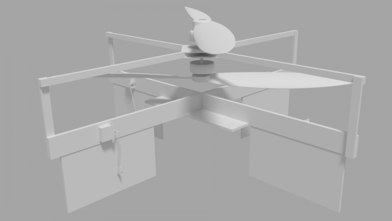 18. Witam, zainspirowany konstrukcjami takimi jak Avro Car oraz Hiller VZ-1 Pawnee wpadłem ostatnio na pomysł budowy - e... no właśnie, czego? - nazwijmy to drona UFO z koaksjalnym wirnkiem na środku. Jest to całkowicie eksperymentalna konstrukcja - wymiary i parametry opieram na intuicji, ale jeśli ją skończę, to będę miał dalszą bazę do usprawnień. Całość ma być wyposażona w 2 silniki DT750 - z testów sprawności tych silników wynika, że najlepiej pracują z 2-łopatowym propellerem 11x4.7 cala. Całość jednak będzie pracować wewnątrz tunelu, więc zastanawiam się, czy nie dałoby się uzyskać jeszcze lepszej sprawności przy większej ilości łopat? Poniżej zamieszczam rendery samej koncepcji - rzeczywiste wymiary ramy nieco się różnią. Rama jest wykonana ze sklejki brzozowej 3mm, a "lotki" są wykonane z XPS. Obudowa również będzie z XPS, ale na razie jej nie robię, bo szkoda na to czasu jeśli się okaże, że np cała rama wpadnie mi w takie drgania, że nie będzie co zbierać. Boję się przede wszystkim o wytrzymałość ramy na wibracje - jeśli będzie drgała zbyt mocno, to nie obejdzie się chyba bez wyeliminowania górnego "krzyżaka" i puszczenia wału dolnego silnika przez górny na łożysku. Ta półka na dole jest przeznaczona na mocowanie baterii od dołu, a na górze będą ESC 20A oraz odbiornik. Na razie zbieram fundusze na budowę, ale myślę że pod koniec roku całość bez obudowy powinna być zrobiona