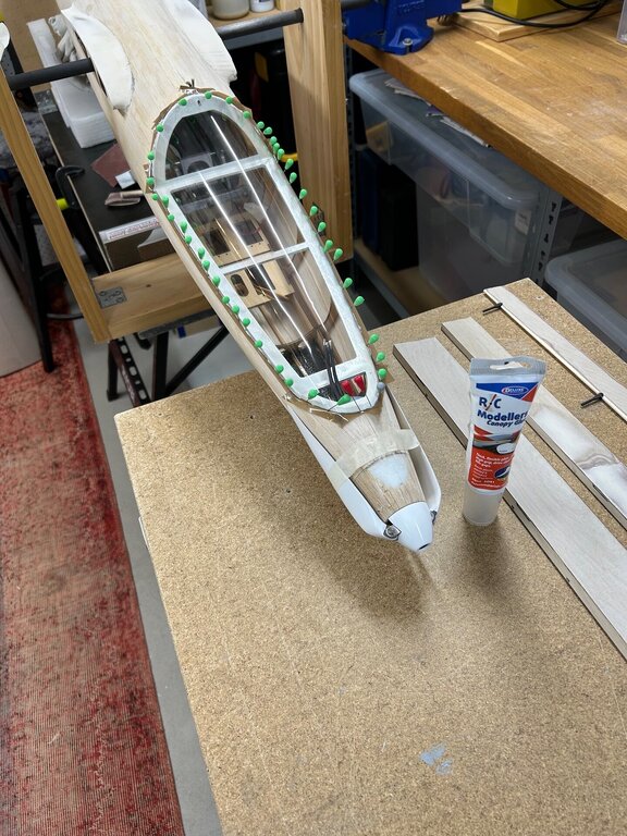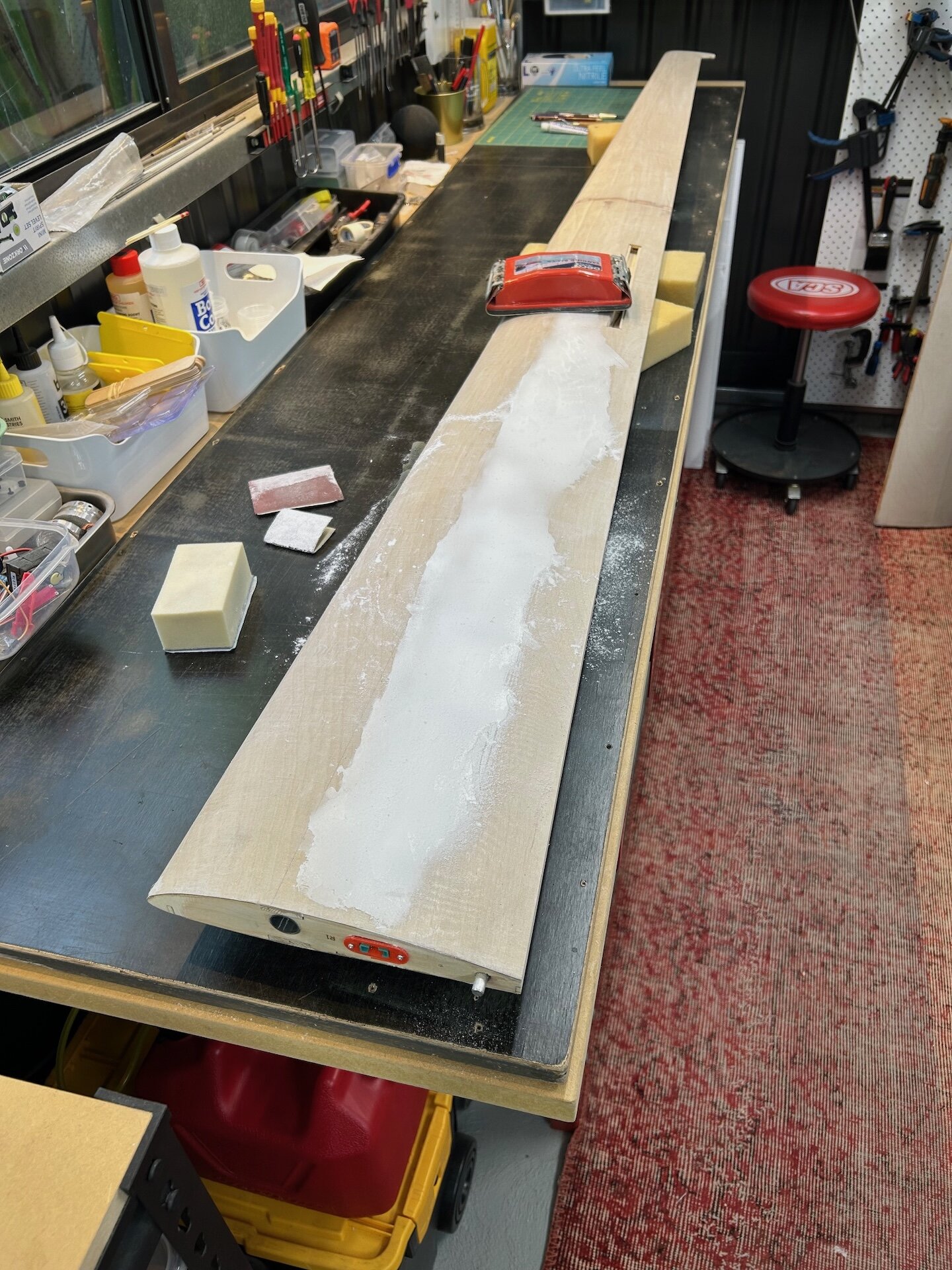 Witam, Owiewka przyklejona do ramy. Prawe skrzydło ma nierówna powierzchnie. Lewe jest OK - użyłem woreczki piasku do dociskania i wyszło bardzo dobrze. Musze teraz to naprawić. Stosuje taka bardzo lekka szpachle.