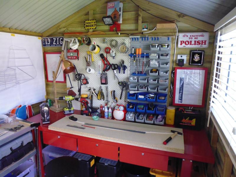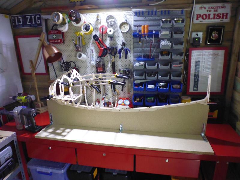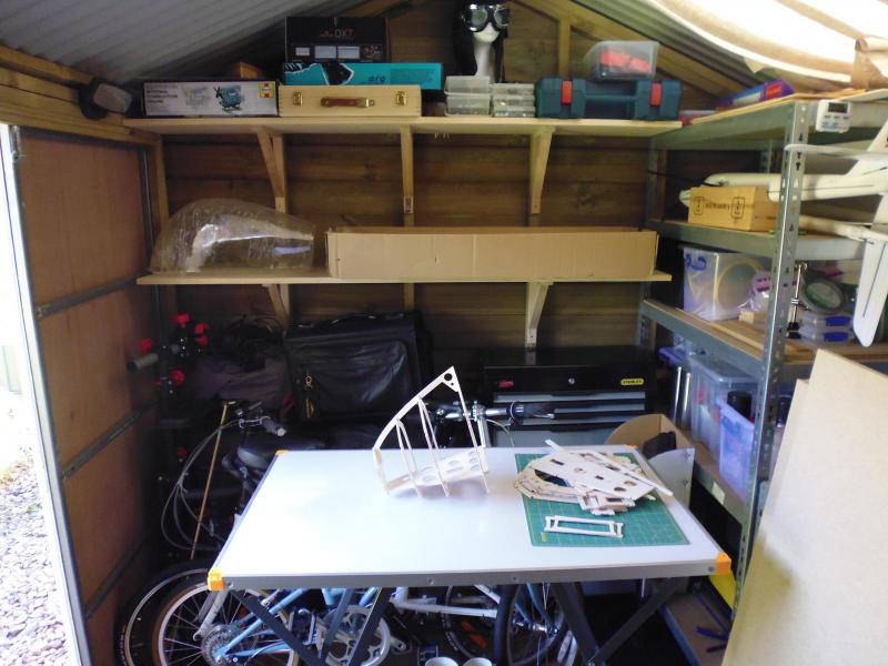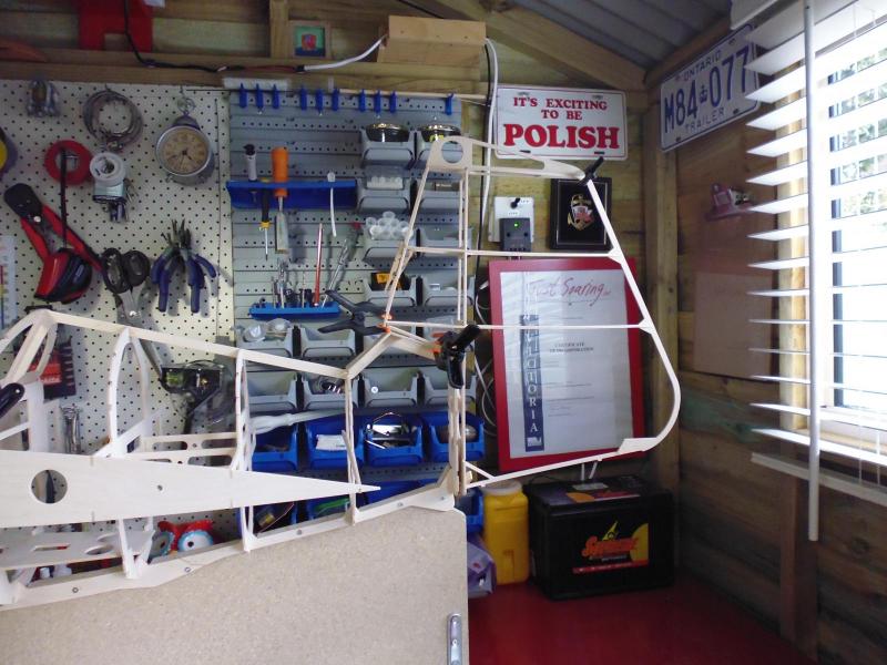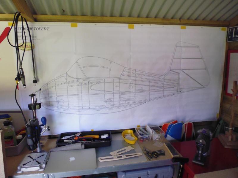 Witam, Dzisiaj rozpoczynam budowe Nietoperza szd 6x - zestaw od Oldgliders. Skala 1 : 2.5. Tak na wstepie to moja "modelarnia",drewniana budka w koncie ogrodu. Mam podlaczony panel sloneczny do ladowania akumlatora - daje mi to oswietlenie na nieograniczony czas. Kabel elektryczny podciagam z domu kiedy potrzebuje uzyc Dremela. Buda nie jest duza ale daje mi wystarczajaco miejsca do pracy. Plan Nietoperza na scianie i przygotowalem podstawe do montarzu kadluba. Ustawiam wregi na sucho.Wlasnie zdalem sob sprawe z tego, ze jest to duzy model !! Tyle na dzisiaj. Astatnia fotka uciekla....