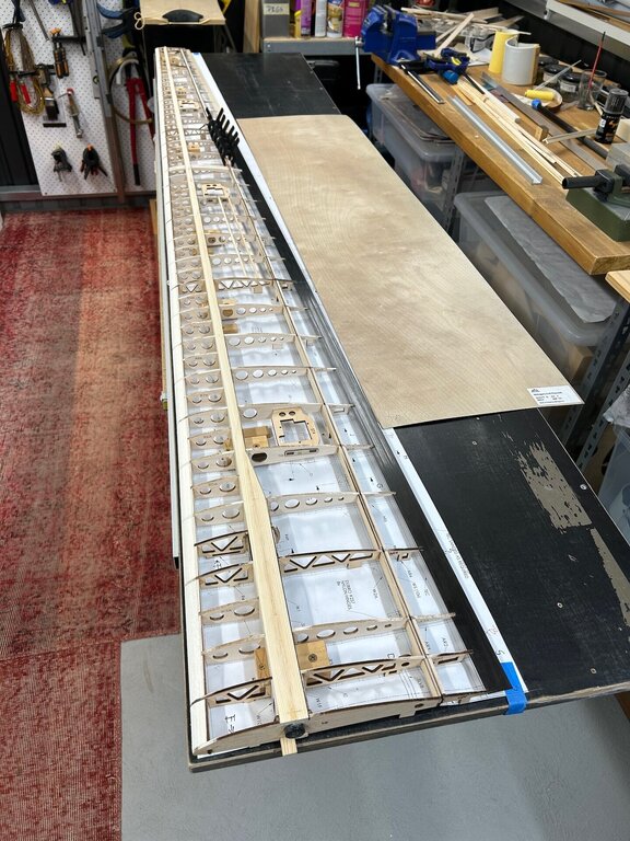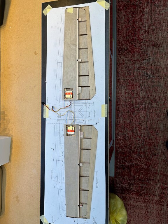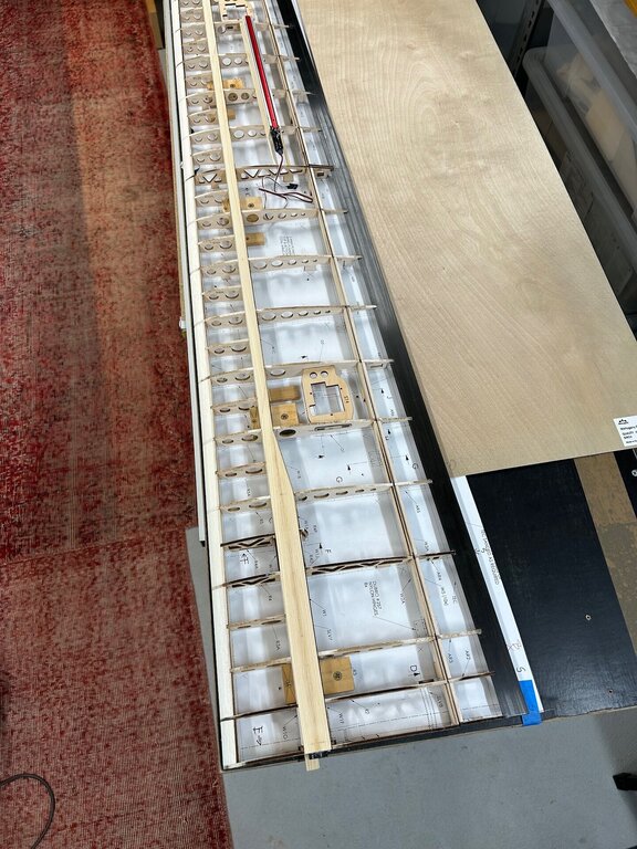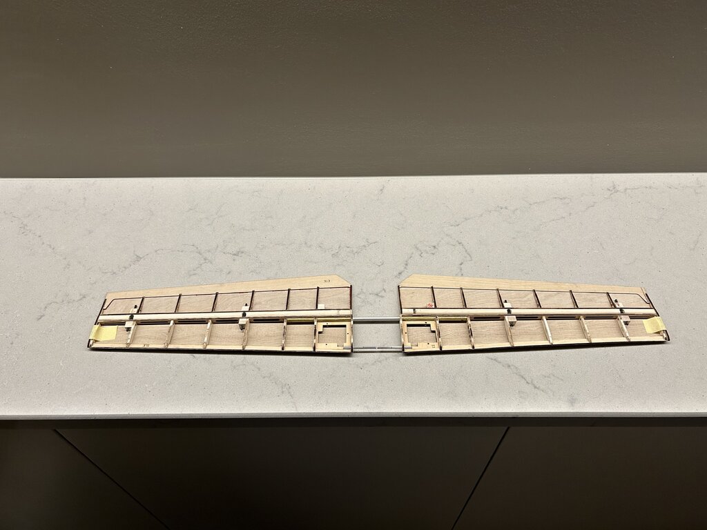 Witam, Prawe skrzydło jest gotowe to pokrycia - sklejka 0.4 mm Miejsce na hamulce zamontowane, zrobiłem taki profil C i mogę go wklejać dopiero jak obrócę skrzydło.