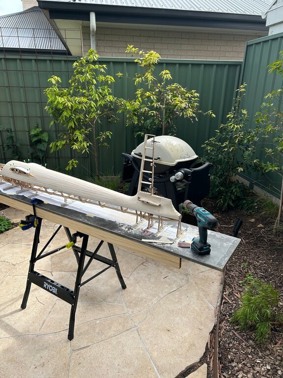 Witam, Powoli idzie praca tego skrzydła. Wypełniam krawędź natarcia balsa i musze powoli szlifować to kształtu noska.Zabezpieczam żeberka taśma aby nie zepsuć profilu. Jestem także w trakcie zamykania dźwigara. Czekam na carbon strips 25.4 mm do sklejenia klap tego skrzydła. Nie mogę tego kupić lokalnie i zajmuje to czas aby dostać ten materiał. Sklejka 0.4 mm na pokrycie skrzydeł tez będzie wysłana z Melbourne ale Australijski dostawca jest w Brisbane. Teraz mam dylemat jaka metoda przykleić to 0.4 sklejkę na skrzydło. Klej i ciężarki do kształtu profilu czy klejąc na gorąco.Widzialem to na YouTube ale nigdy tej metody nie próbowałem.Sklejka jest bardzo cienka i nie wiem czy będzie nierówna pomiędzy żeberkami jak wyschnie. Macie jakieś pomysły ??