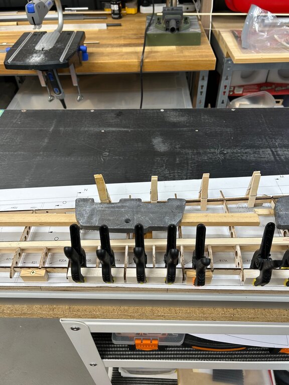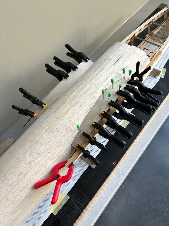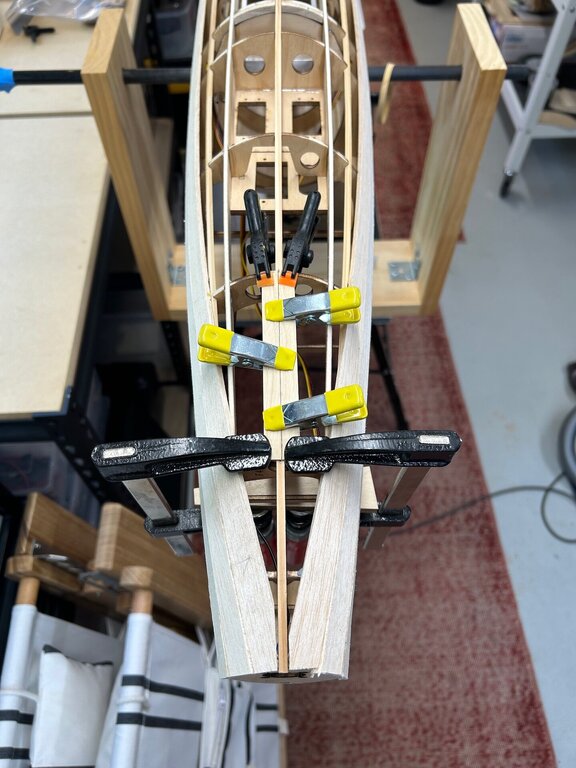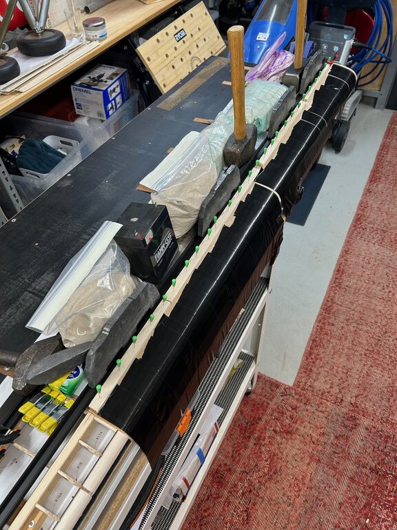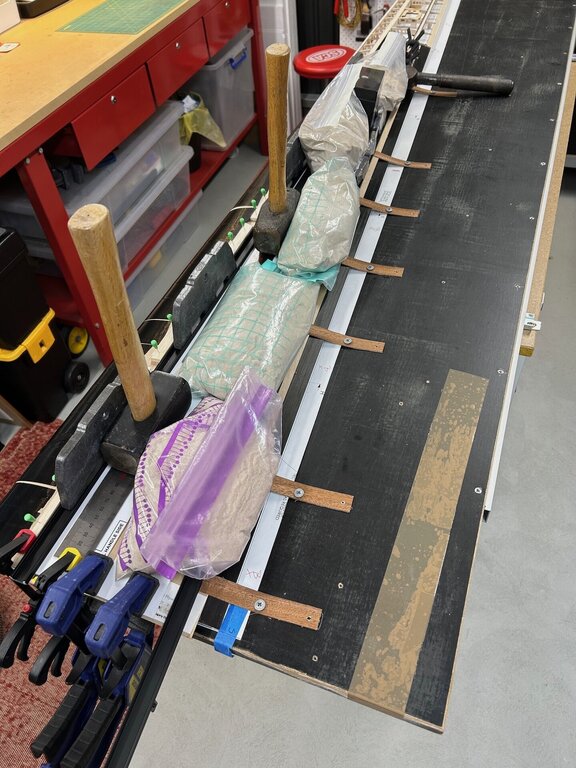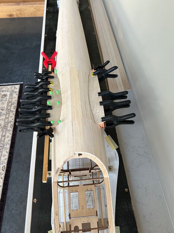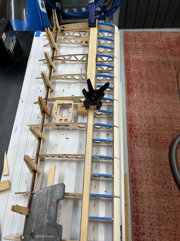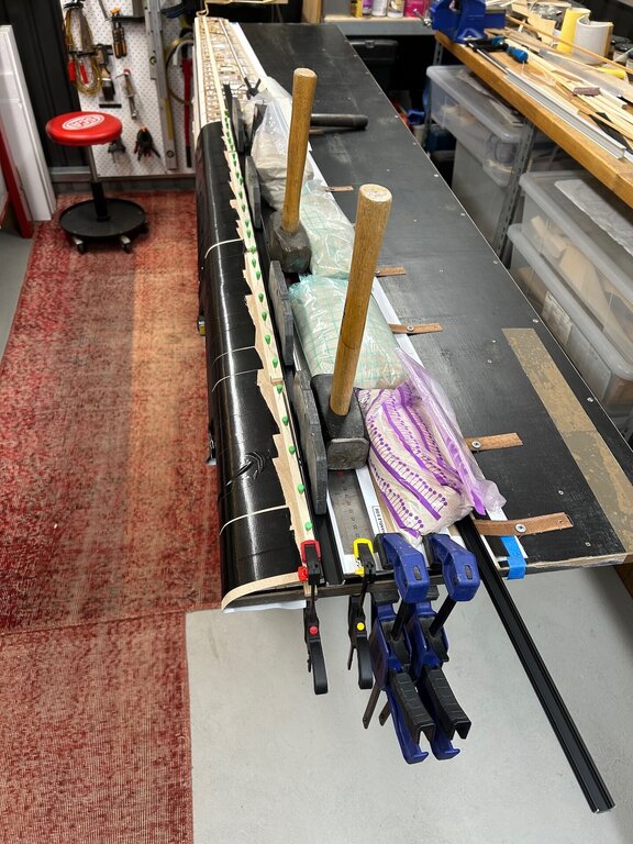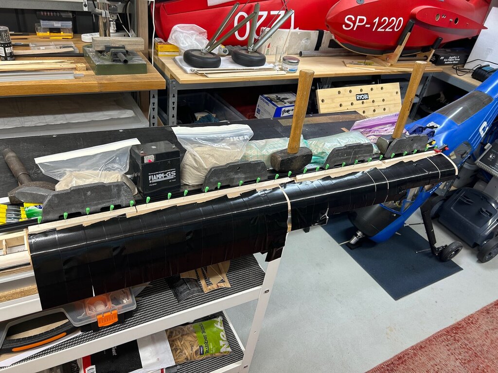 Witam, Dzisiaj przykleiłem pierwszą sklejkę. Tego jesz nie robiłem. Użyłem wszystko co mialem : ciężarki, duct tape, i takie mocowania do klap bot to było bardzo trudno aby uzyskać ucisk bez deformacji. Zobaczymy jutro jak to wyjdzie