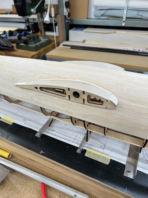 Witam, Musialem szlifować na zewnątrz - pyl balsy nie jest zdrowy. Trochę to było pracy z tym przejściem w tyle kadłuba. Statecznik pionowy okleiłem sklejka 0.4 mm i teraz musze dopasować druga część.