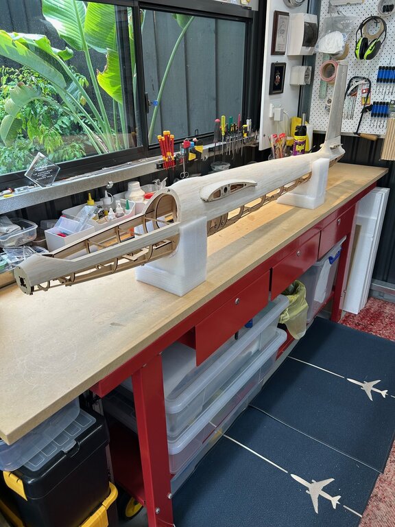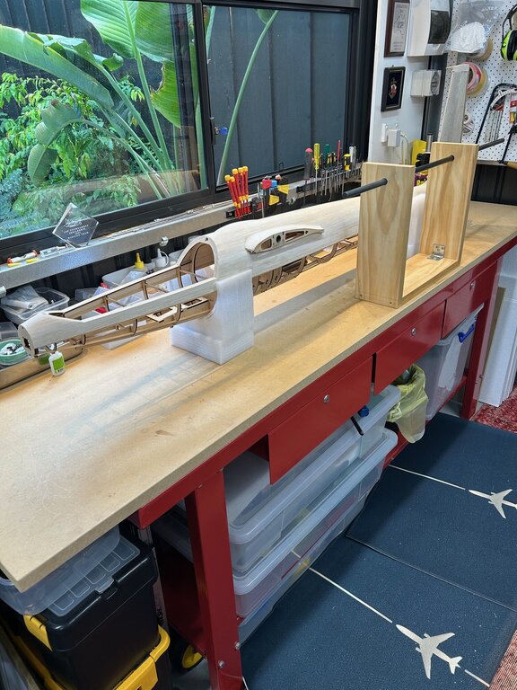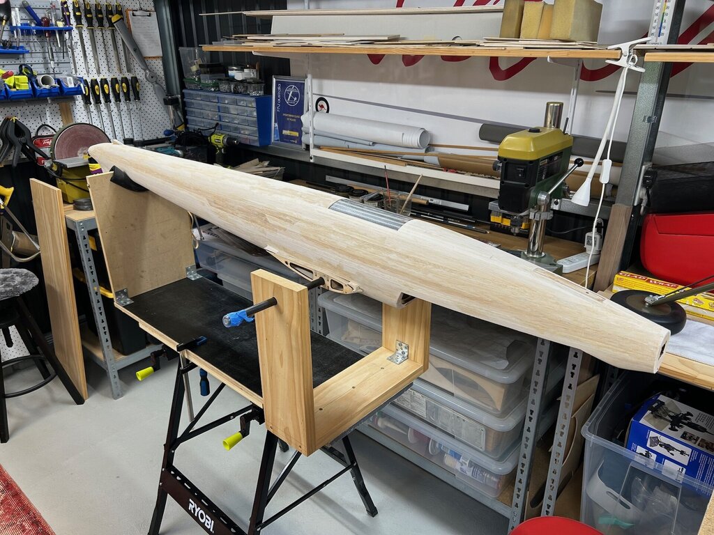 Witam Dziękuję za porady, zrobie kawałek skrzydła z paru żeberek jako szablon to metody klejenia na gorąco. Dzisiaj wielki dzień. Zdjąłem kadłub z deski montażowej i przygotowałem podparcie aby odwrócić kadlub.