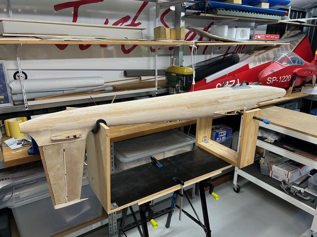 Witam, Kadłub pokryty balsa. Trochę pracy było ze szlifowaniem kształtu. Najgorszy jest ten pyl z balsy. Teraz poszpachlowalem nierówności i jutro dokończę resztę. Czekam na końcówki kadłuba to jest 3D drukowane i wtedy będzie gotowy to pokrycia mata szklana. No i jeszcze musze zamontować klapy podwozia.