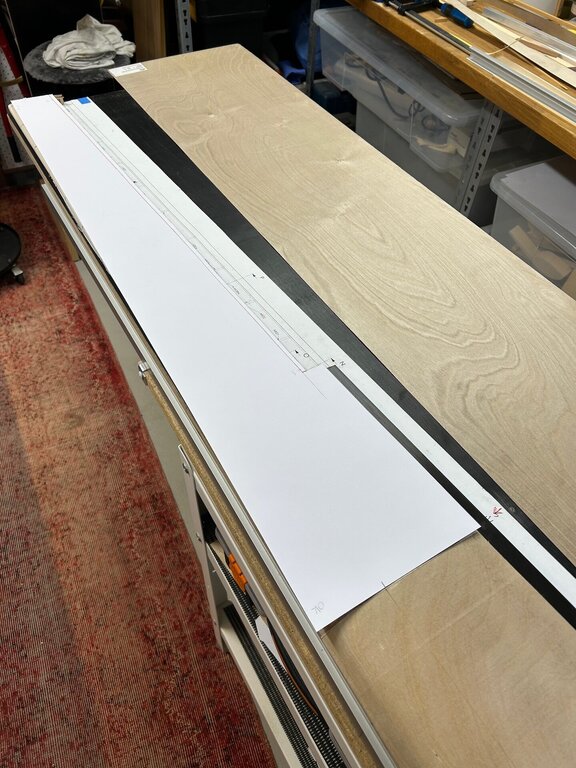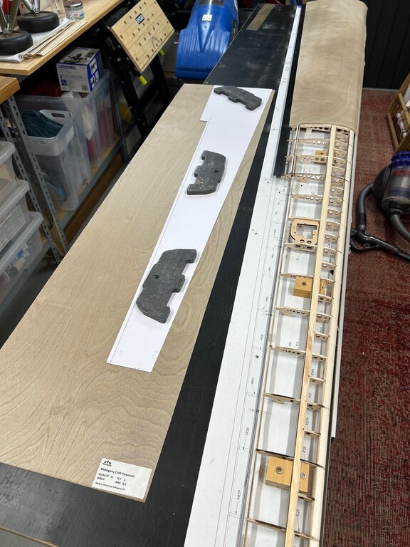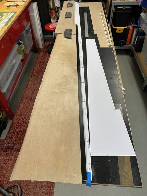Witam, Pierwsza część skrzydła przyklejona. Patrząc to nie widać załamań ale trochę to czuć pod ręką. Dopiero jak obrócę skrzydło to zobaczę jak to zostało sklejone. Dzisiaj zrobiłem szablon do drugiej połówki.Sklejka wycięta, gotowa do klejenia.